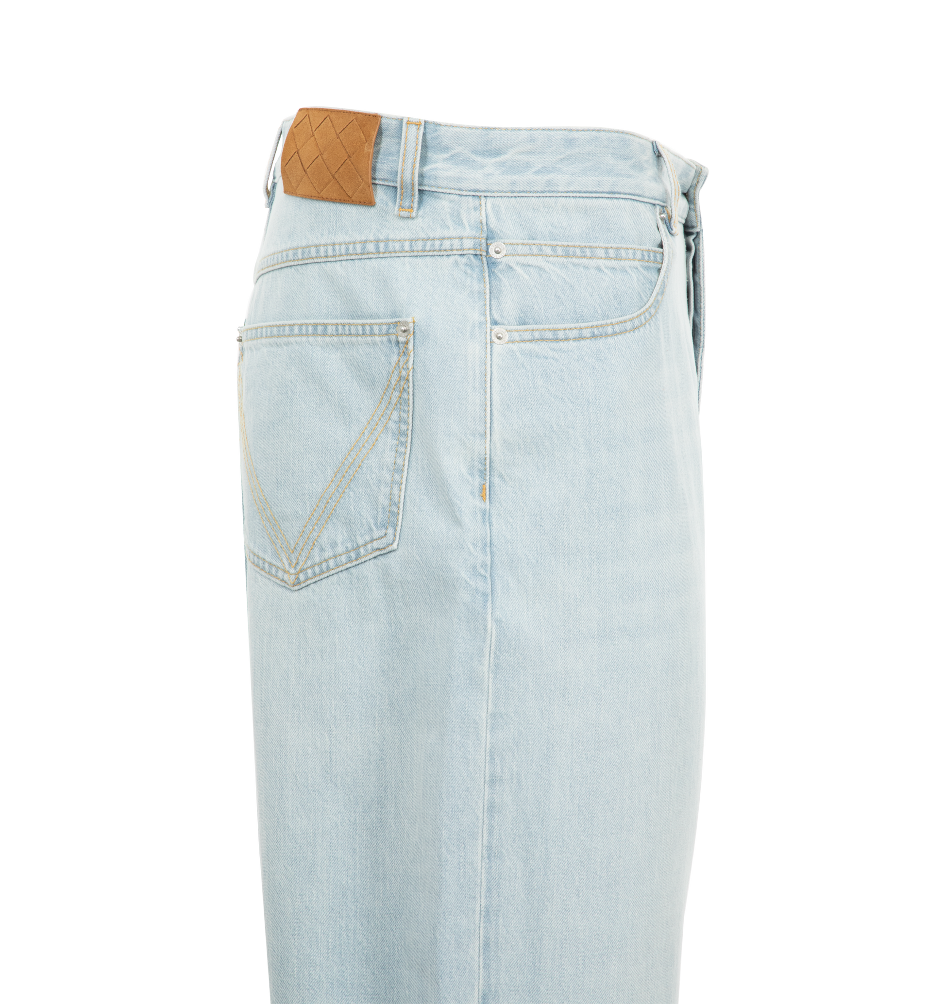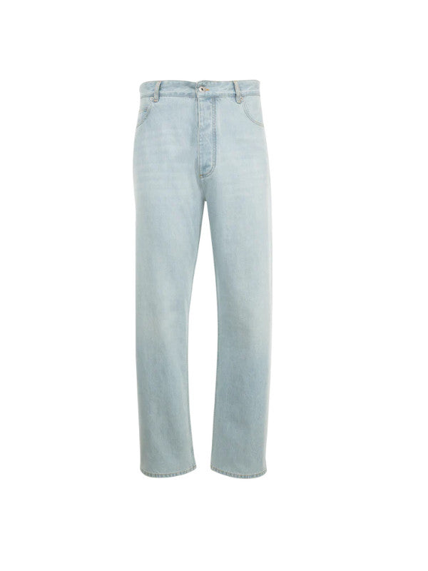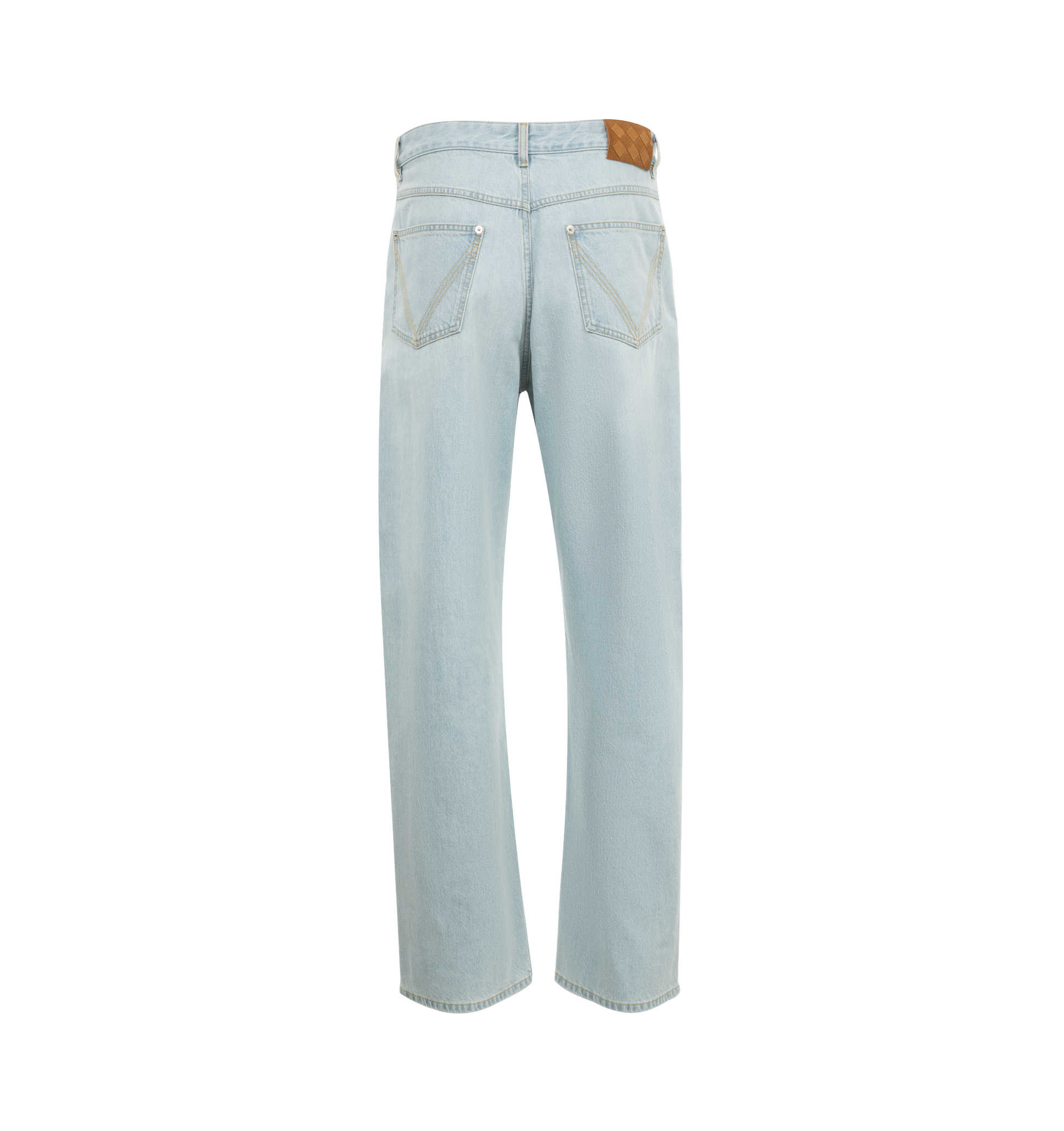 Bottega Veneta men's jeans in extra bleached washed denim. Featuring wide leg, regular waist, button fly and Intrecciato suede back patch. 100% cotton. Made in Italy.