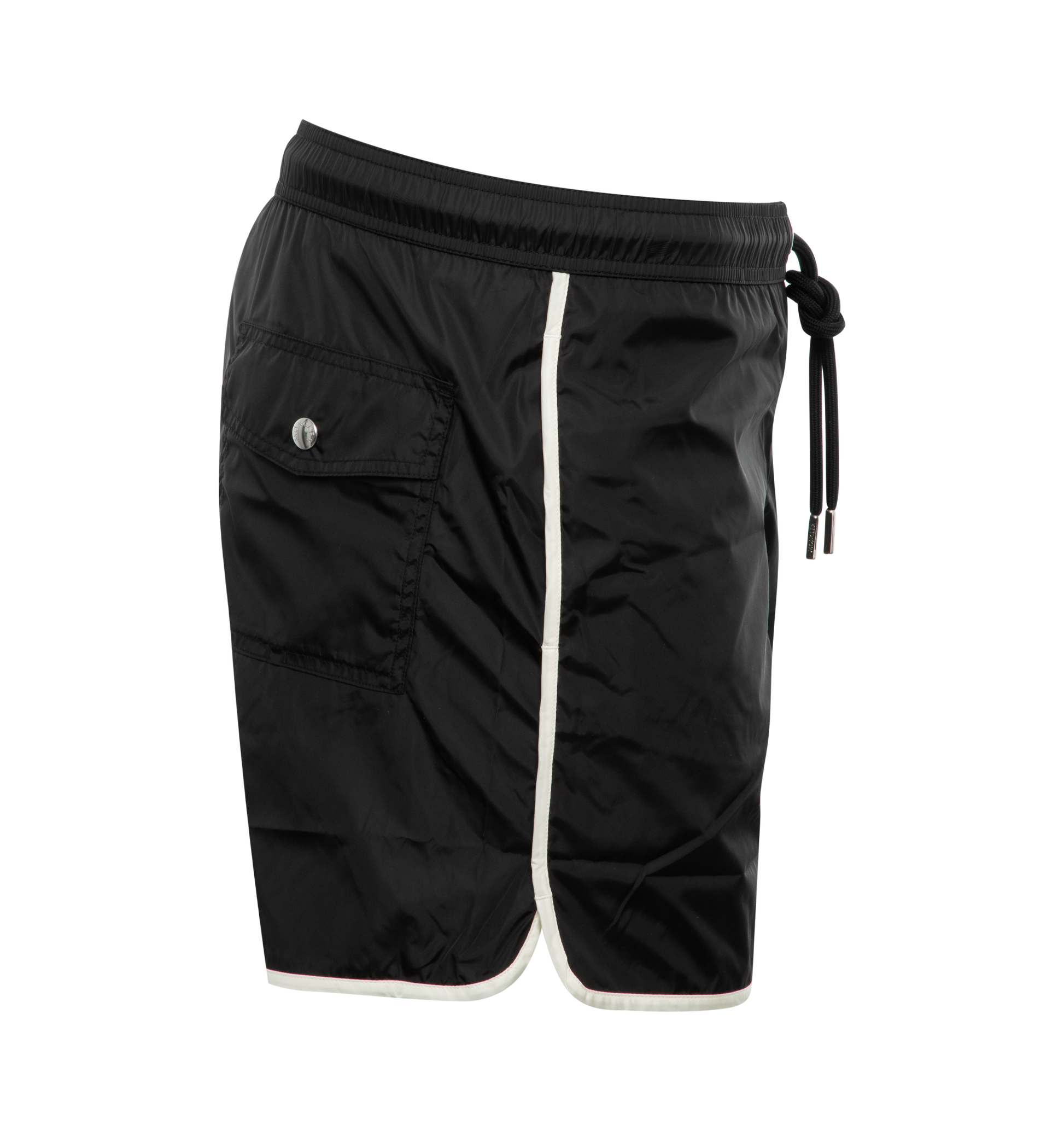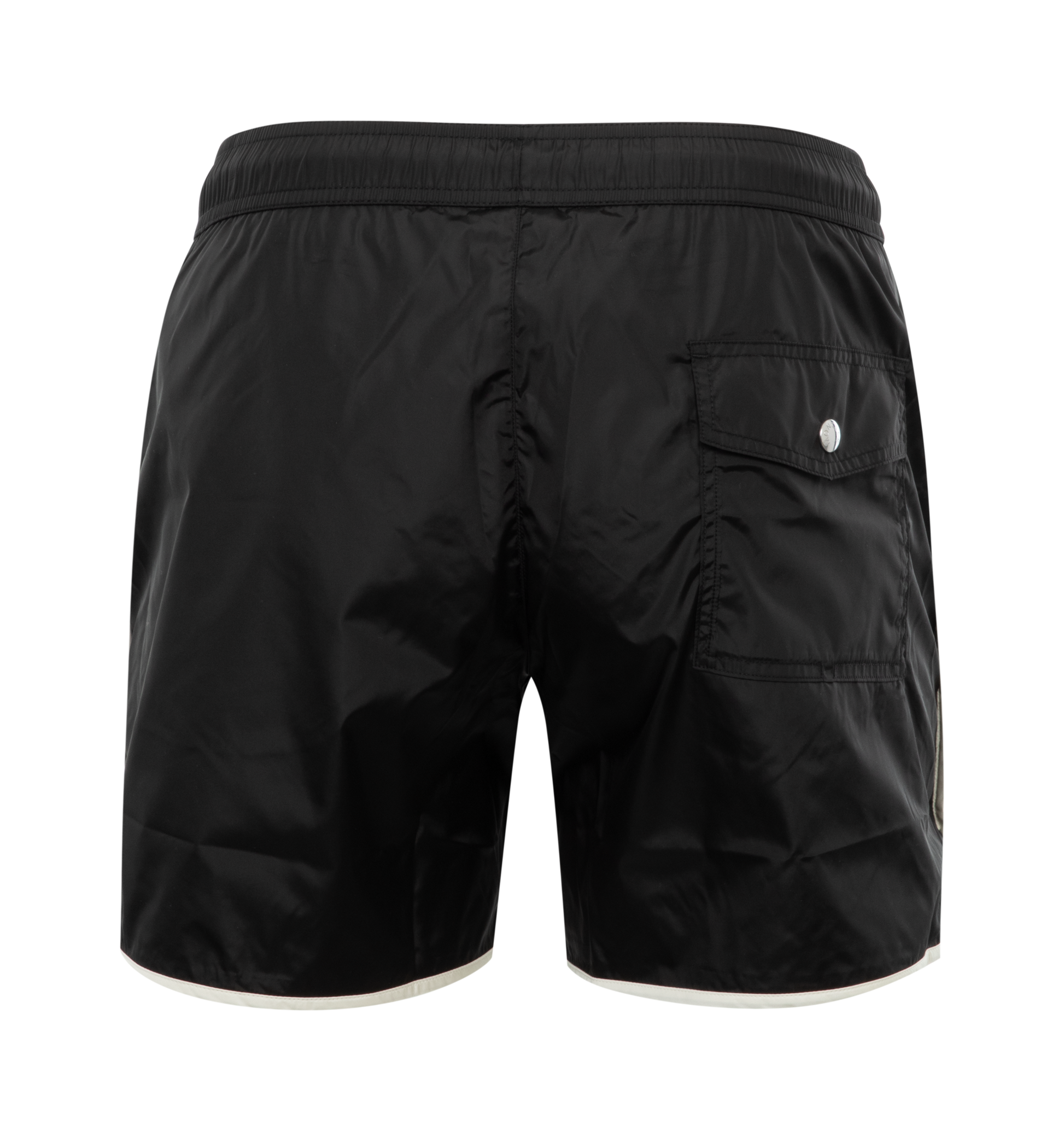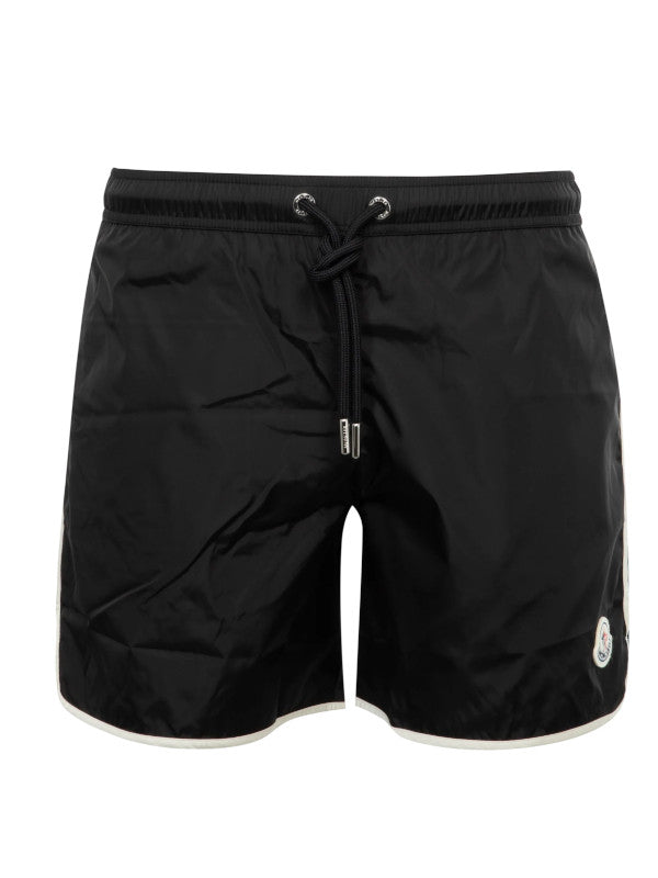 MONCLER Logo Swim Shorts featuring micro mesh lining, waistband with drawstring fastening, side pockets, back pocket and logo patch. Length (from waist to knee): 35 cm. 100% polyamide/nylon.