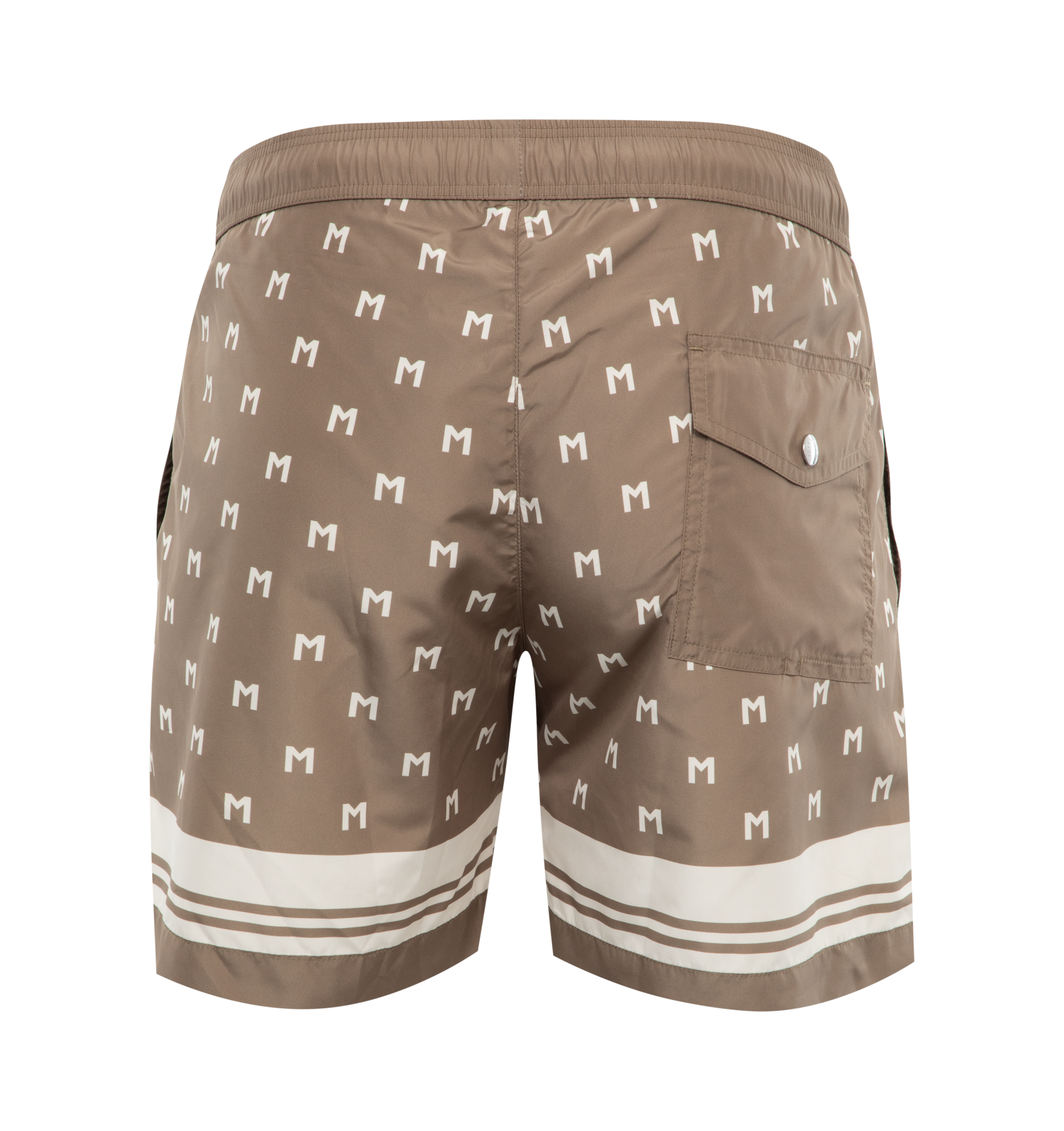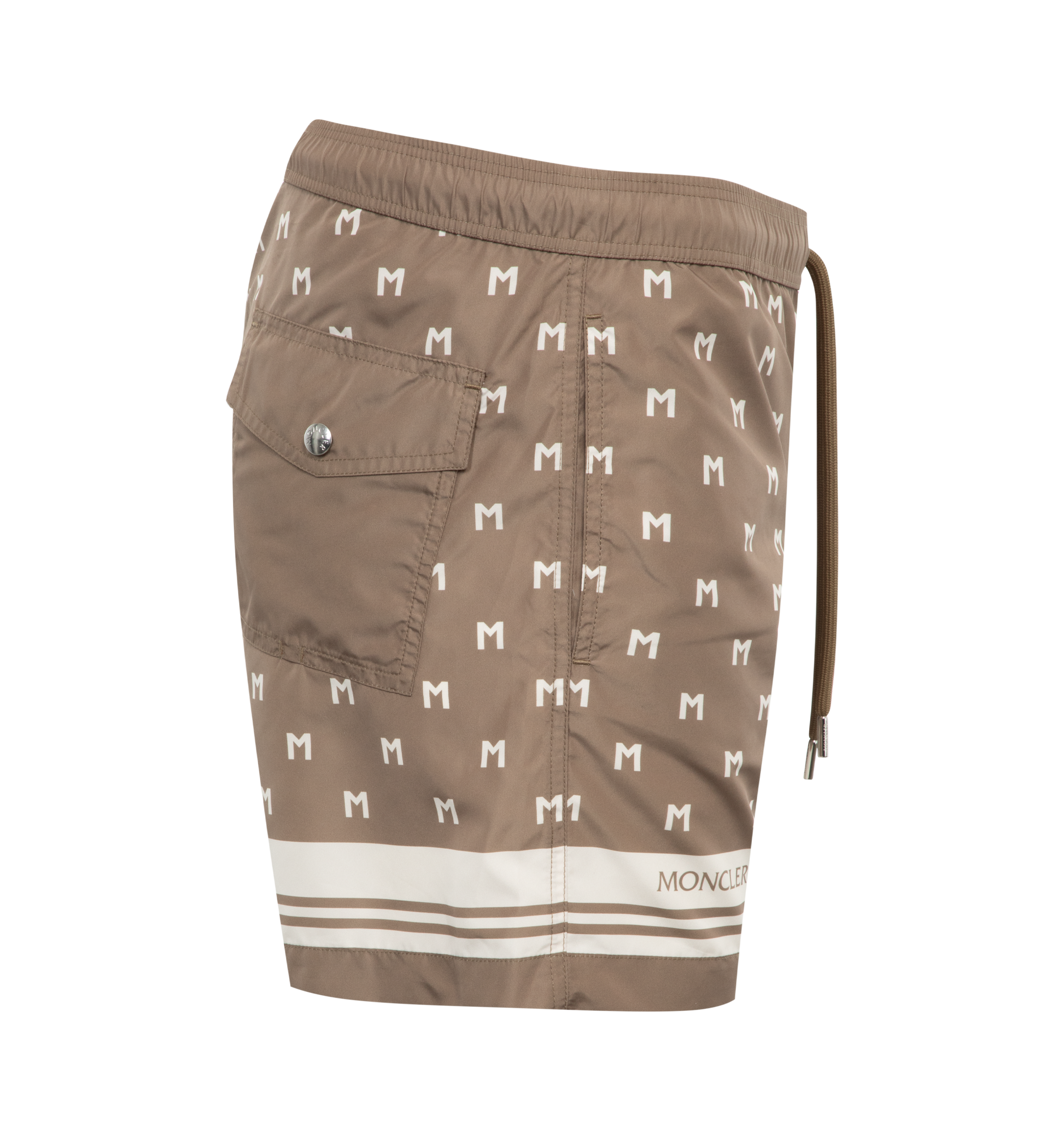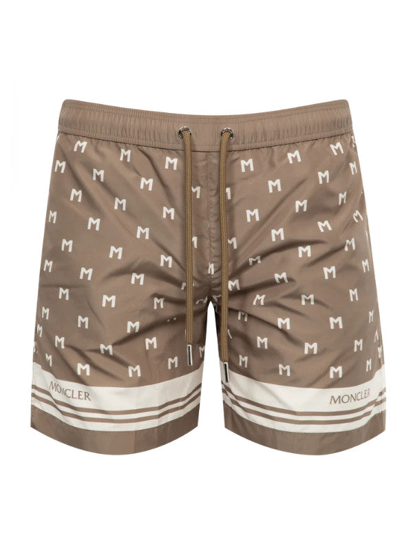 MONCLER Monogram Print Swim Shorts featuring micro mesh lining, waistband with drawstring fastening, side pockets and back pocket. 100% polyester. Lining: 100% polyamide/nylon. Made in Albania.