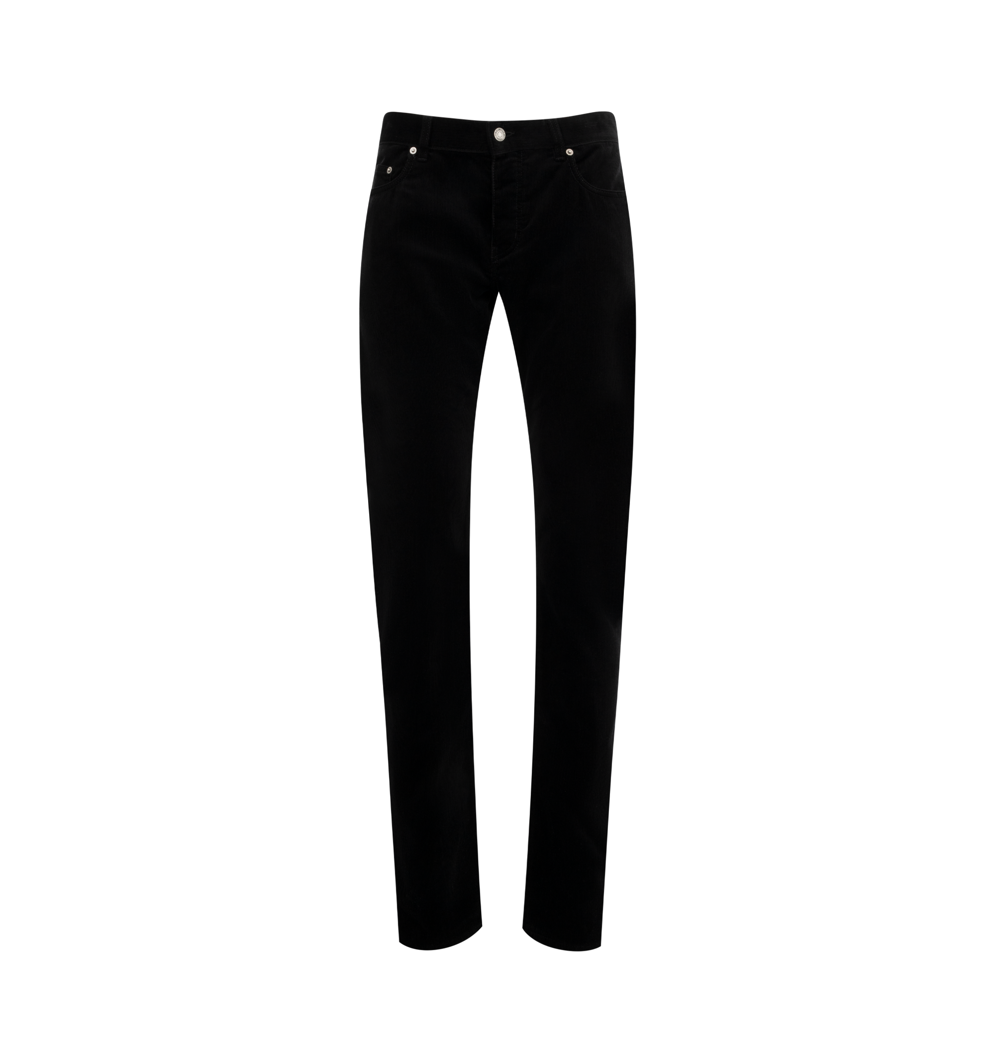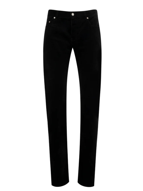 SAINT LAURENT Relaxed Slim Jean featuring mid rise, five pocket styling, button closure with fly, relaxed slim fit and Saint Laurent Jacron. 100% cotton. Made in Italy.