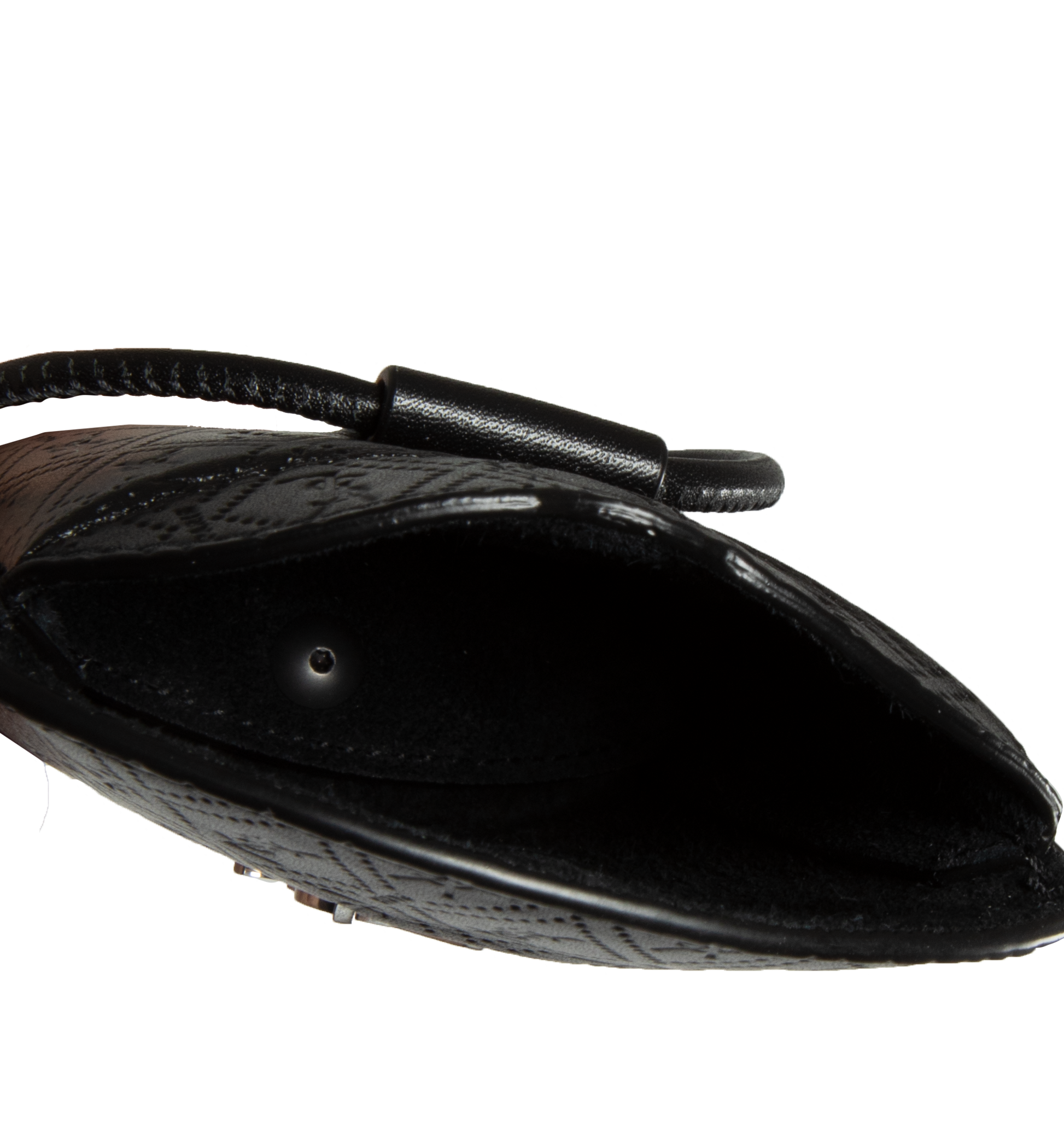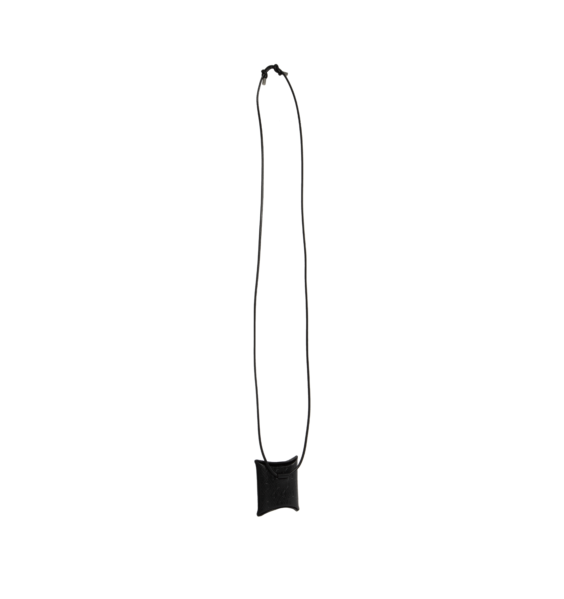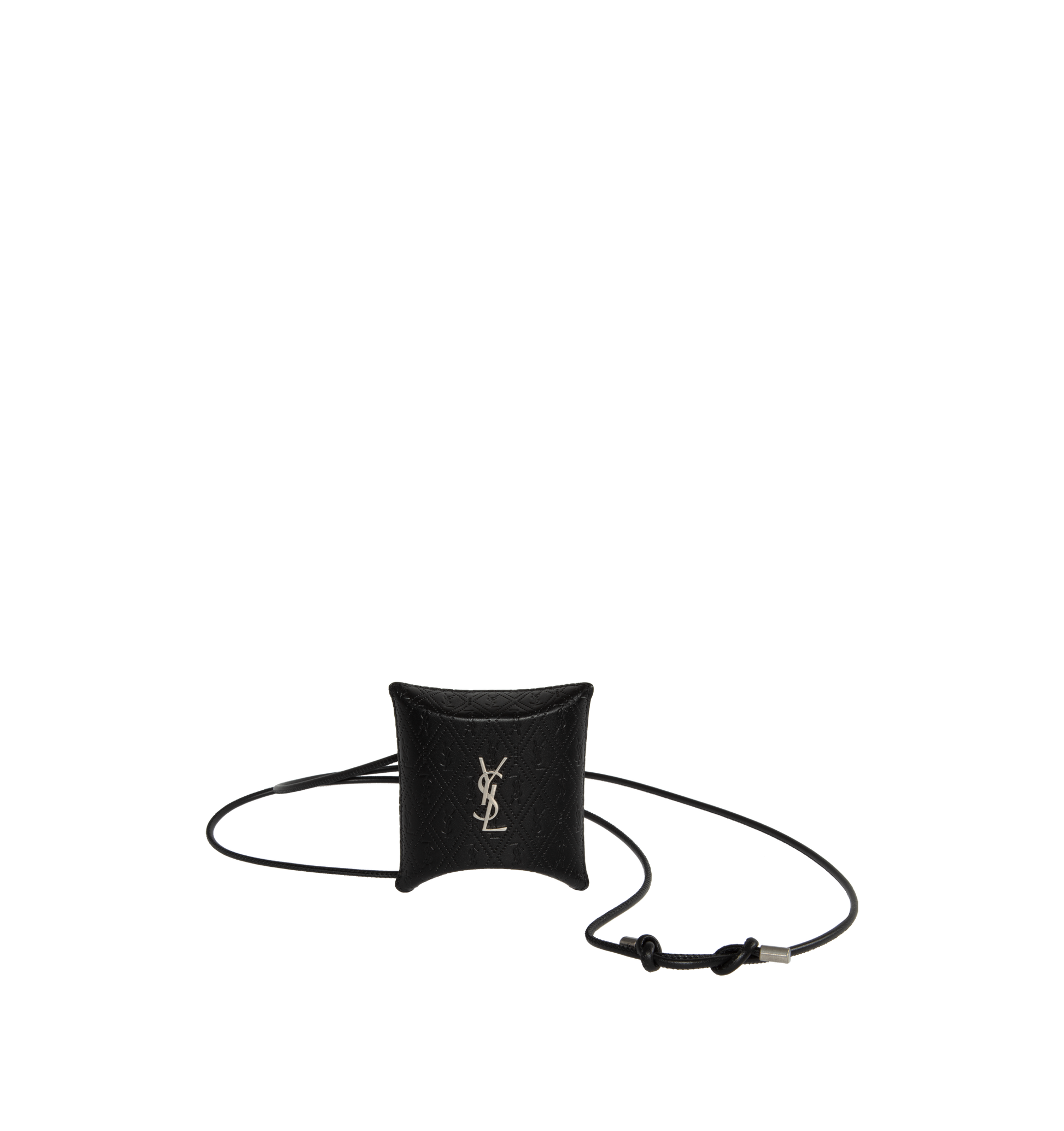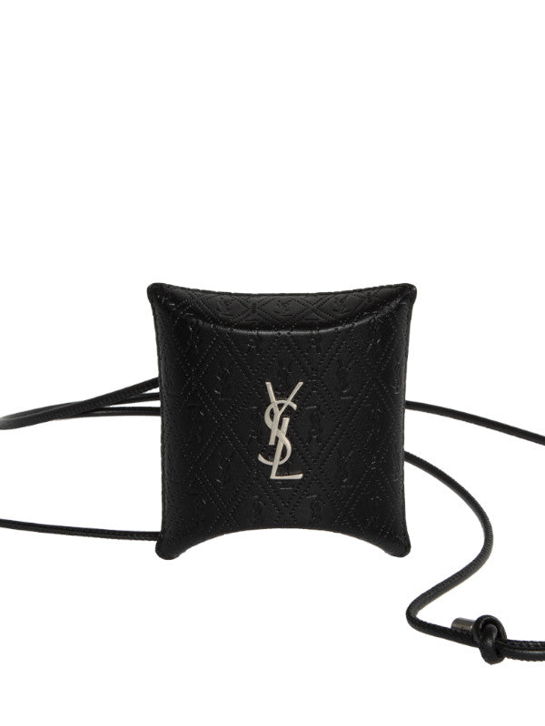 SAINT LAURENT Take Away Airpods Case featuring adjustable lanyard necklace, silver toned hardware, fold down closure and leather lining. 3" X 3.3" X 1.2". 95% calfskin leather, 5% brass.