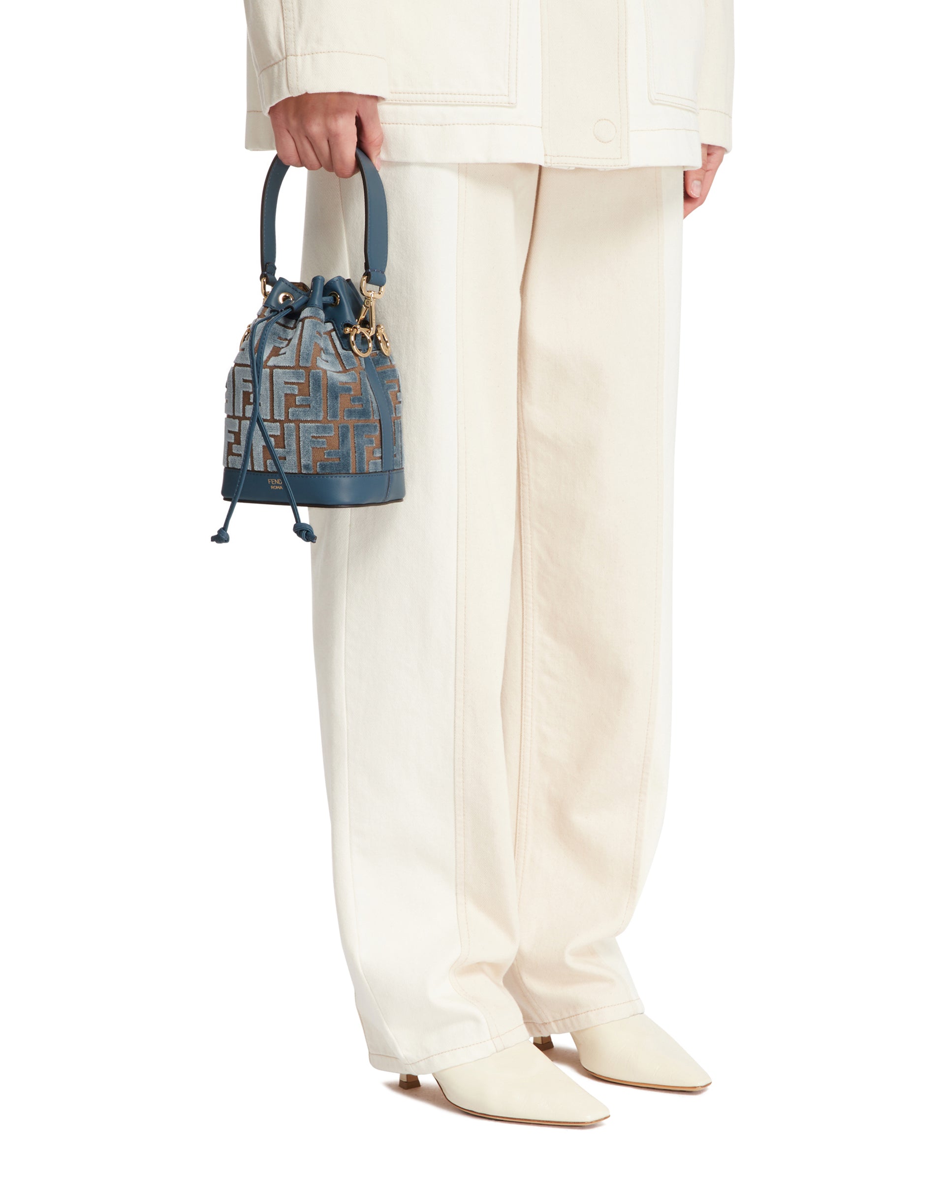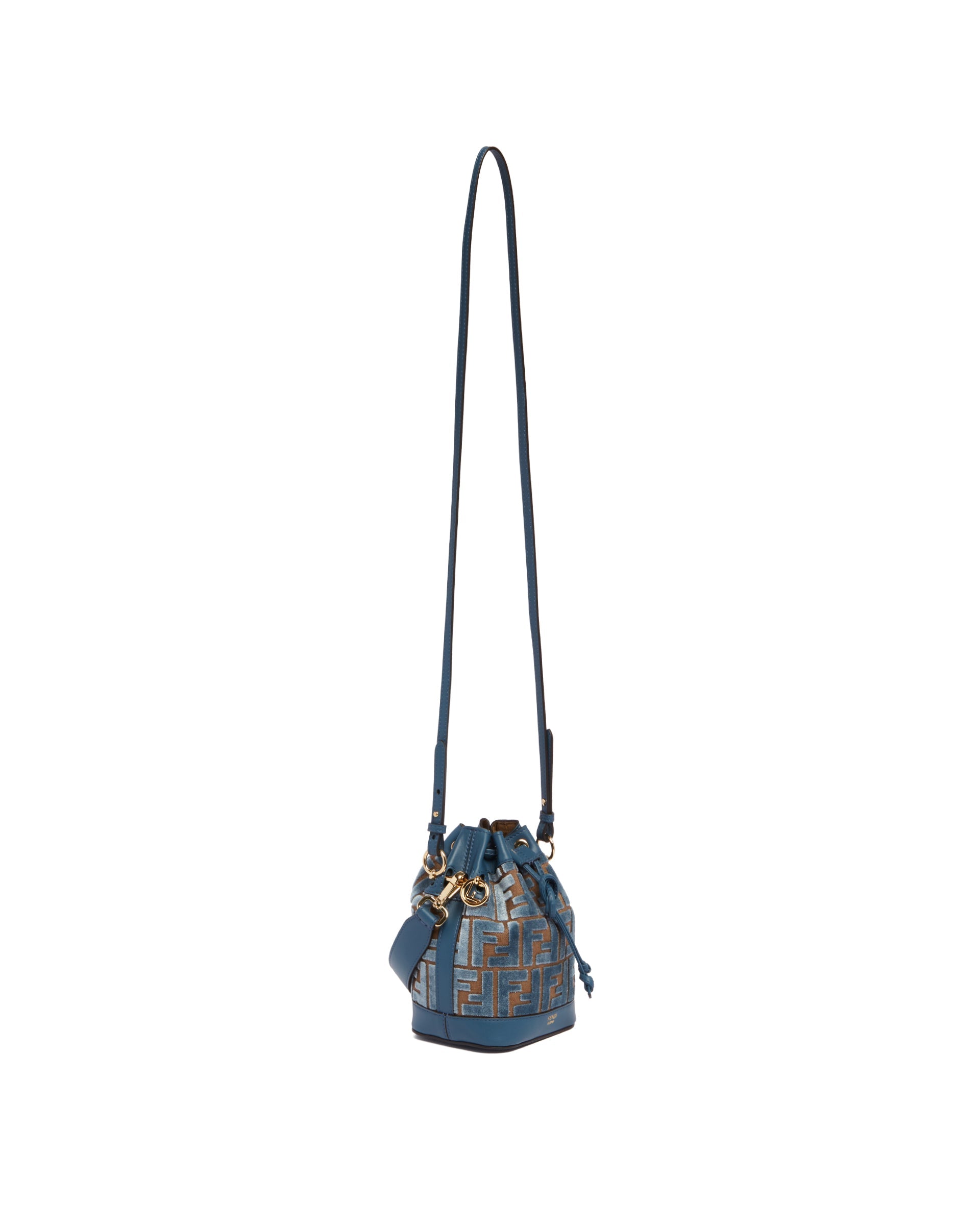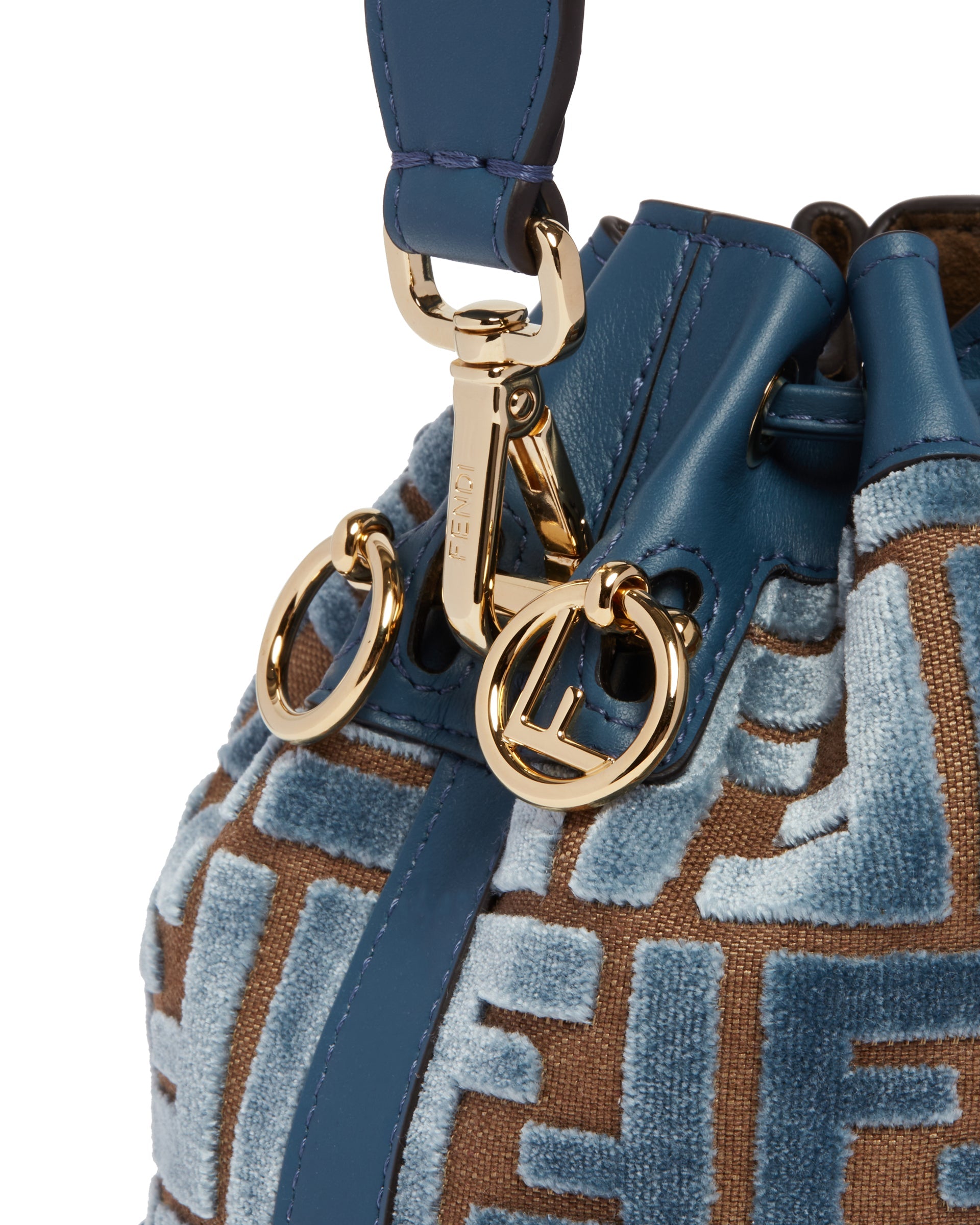 Fendi Multicolor Mon Tresor Minibag. Multicolor jacquard velvet with a raised FF pattern in blue on a beige base. Two removable straps, drawstring closure, gold-colored hardware, bucket bag design, lined interior and gold-tone metallic accessories. Size (