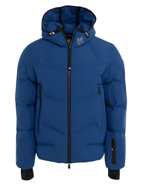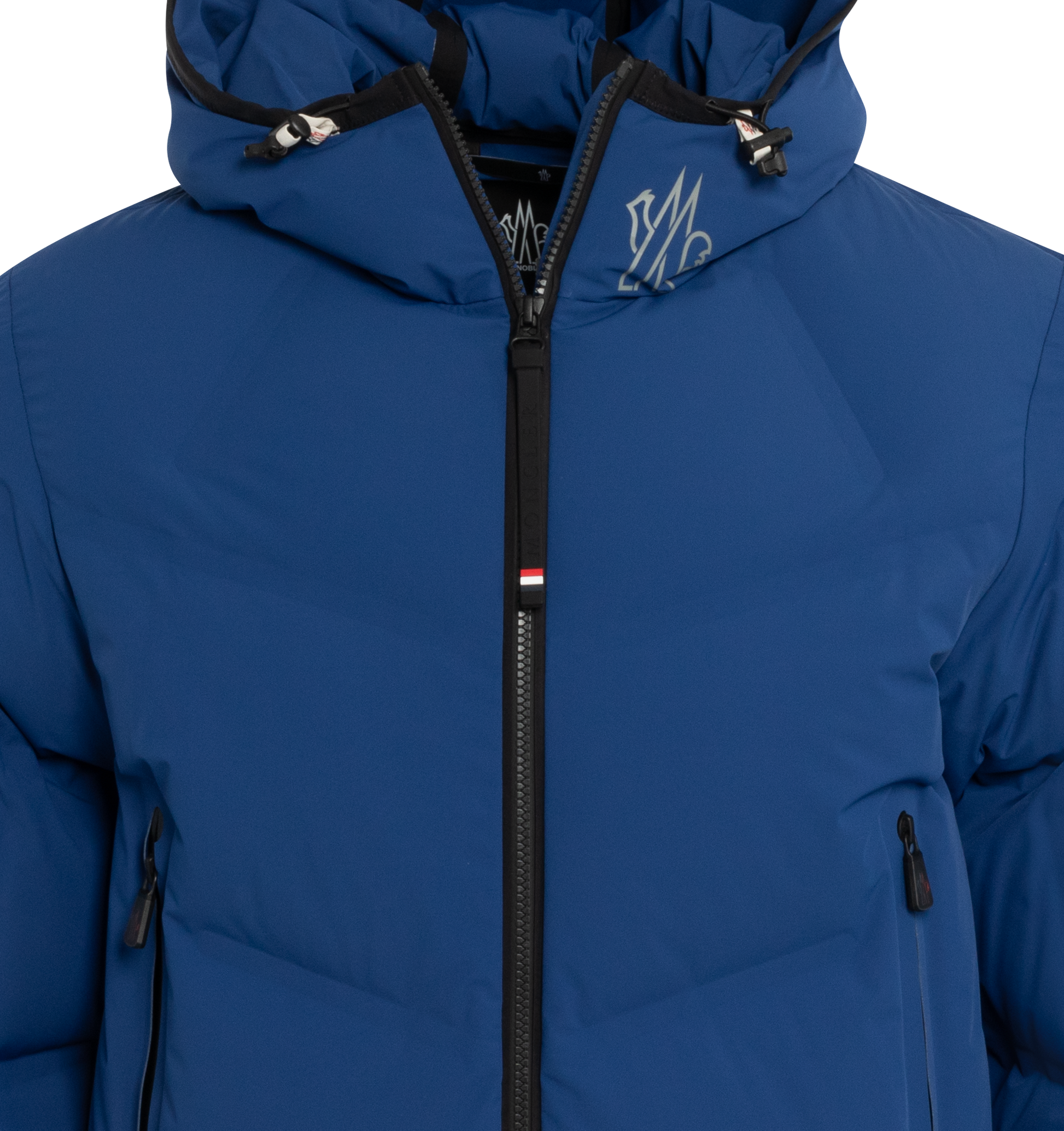 MONCLER GRENOBLE ACRESAZ JACKET is made with 2L 4-way, stretch tech poplin, stretch nylon lining, down-filled, has heat-sealed seams, adjustable hood with drawstring fastening, DAY-NAMIC" transfer, "MONCLER" lettering, YKK® Aquaguard® Highly Water Resistant zipper closure, exterior pockets with interior media pocket, stretch jersey wrist gaiters, ski pass pocket with YKK® Aquaguard® Highly Water Resistant zipper closure, hem with elastic drawstring fastening and embossed silicone logo.
