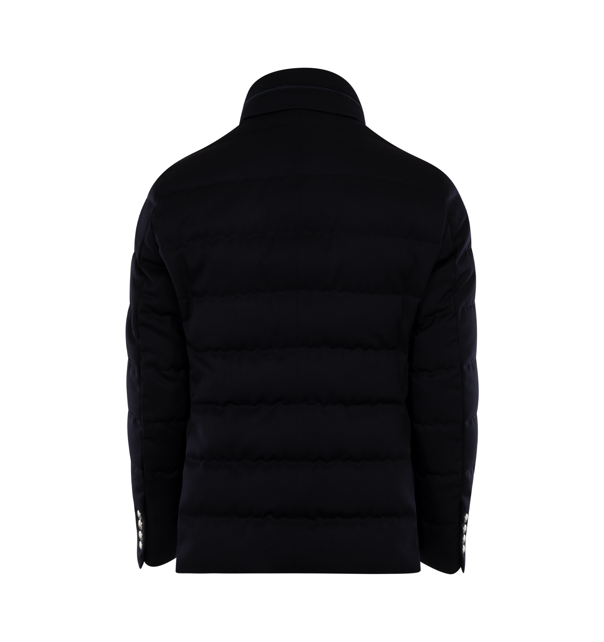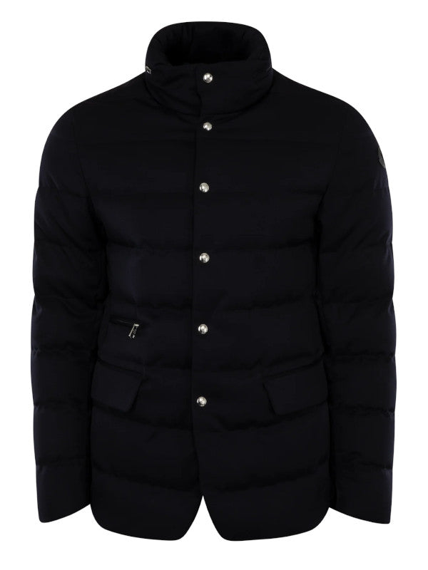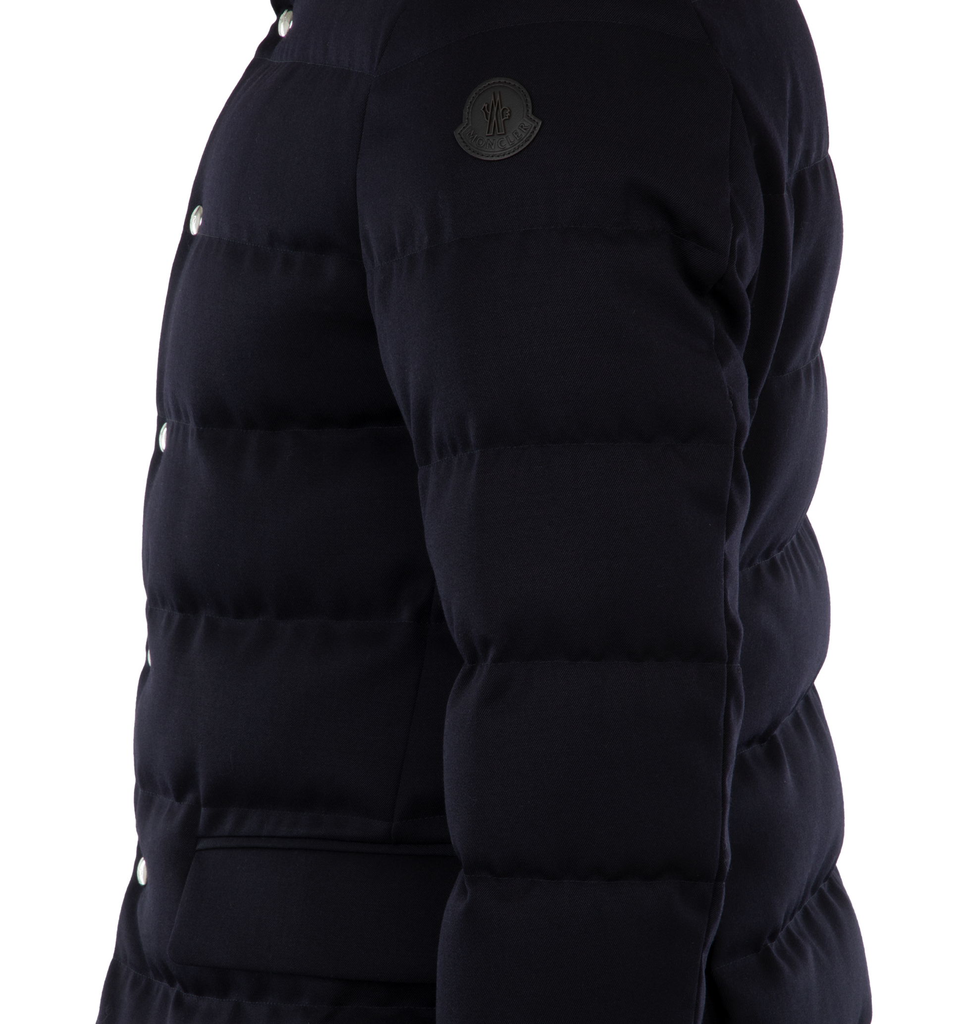 MONCLER Bess Short Down Jacket featuring woven wool gabardine, nylon léger lining, down-filled, pull-out, adjustable rainwear hood with elastic drawstring fastening and snap buttons, contrasting-colored interior piping, ribbed knit collar, inner front bottom with tricolored detailing, zipper and snap button closure, zipped external and internal pockets and leather logo. 100% virgin wool. Lining: 100% polyamide/nylon. Padding: 90% down, 10% feather.