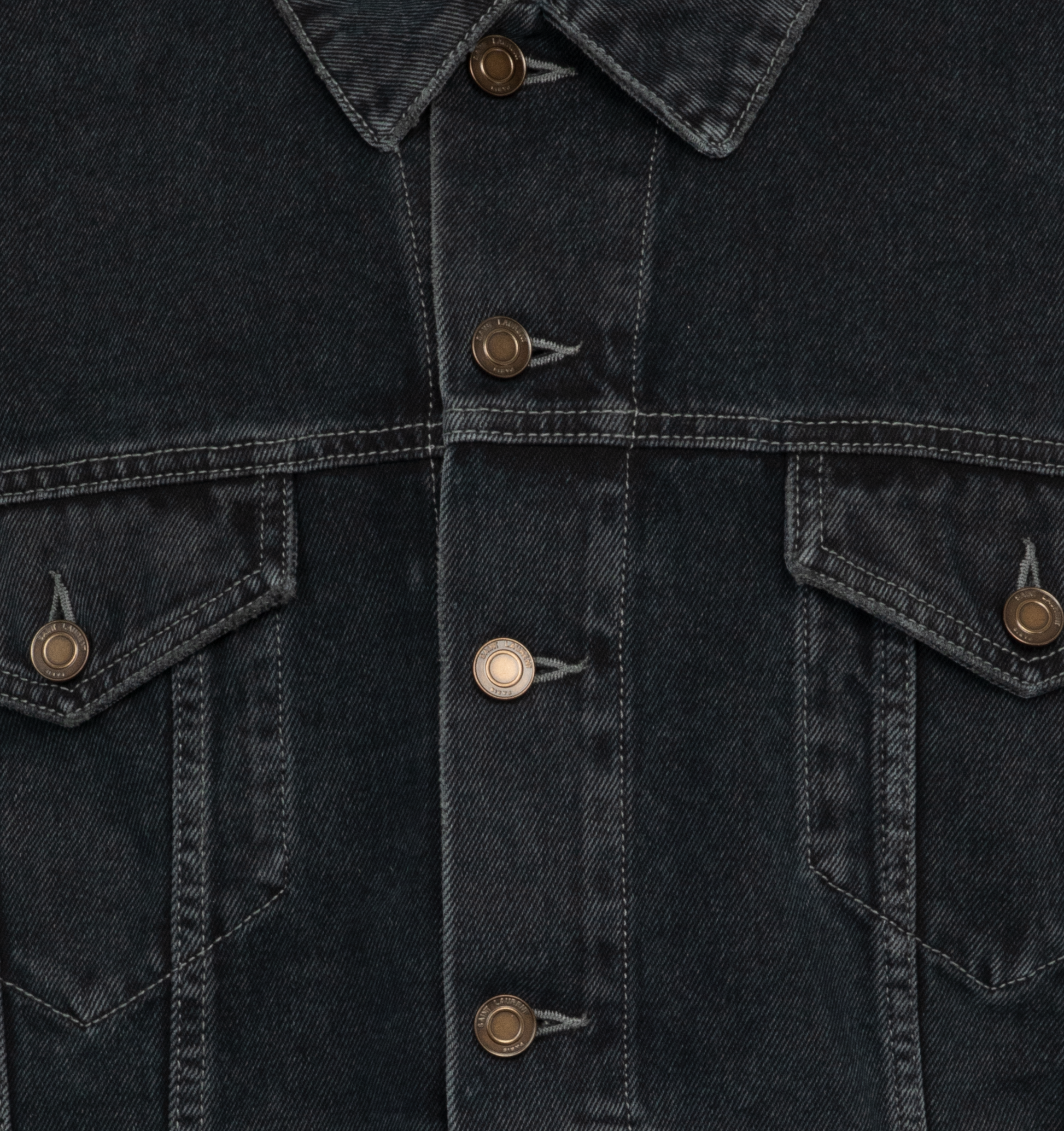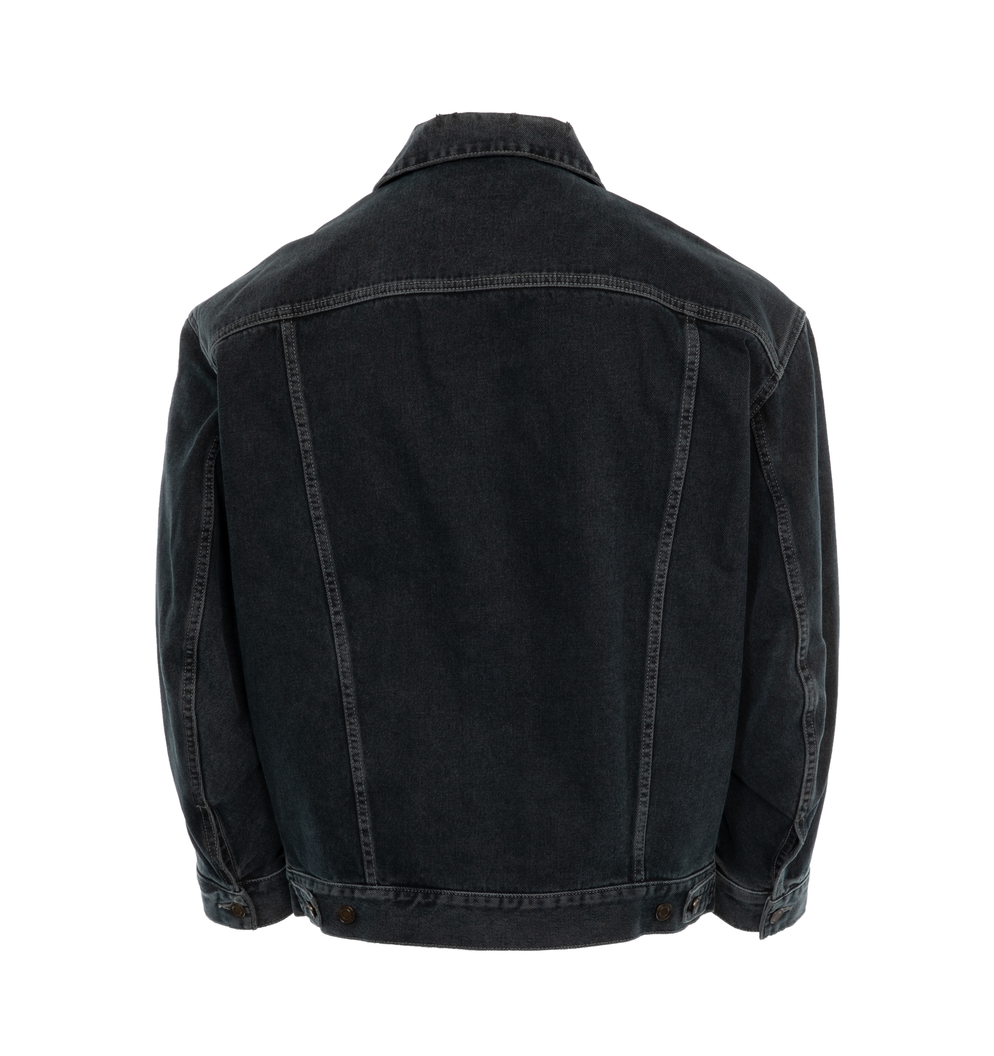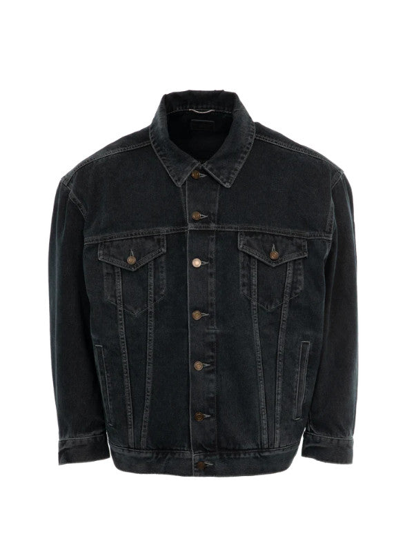SAINT LAURENT Egg Shape Denim Jacket featuring front button closure, oversized fit, two welt pockets at front, two patch pockets with button flaps, pointed collar and one button cuffs. 100% cotton.