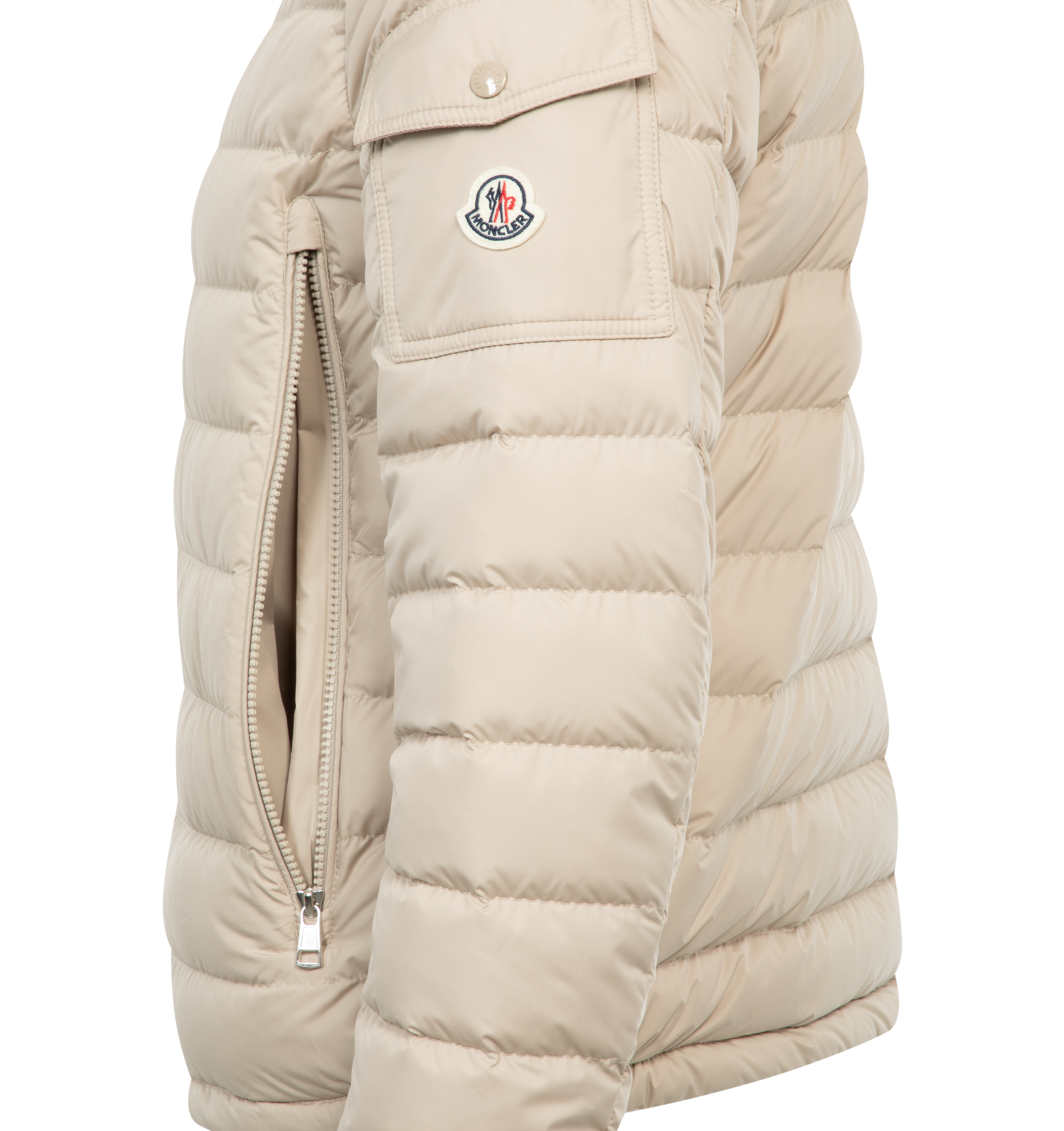 MONCLER Galion Jacket featuring lightweight micro chic, lightweight micro chic lining, down-filled, hood with recycled nylon laqué lining, zipper closure, zipped pockets, chest pocket with snap button closure and adjustable cuffs. 100% polyester. Padding: 90% down, 10% feather.