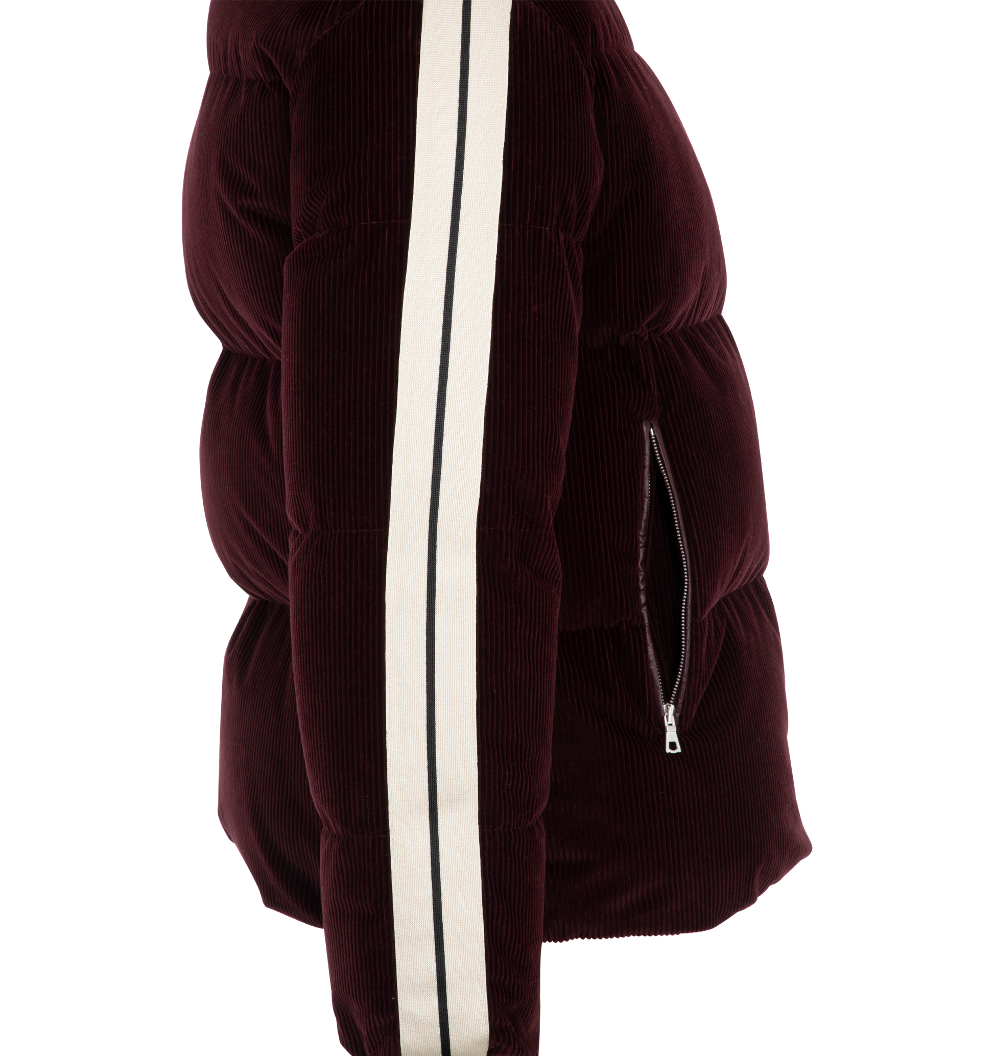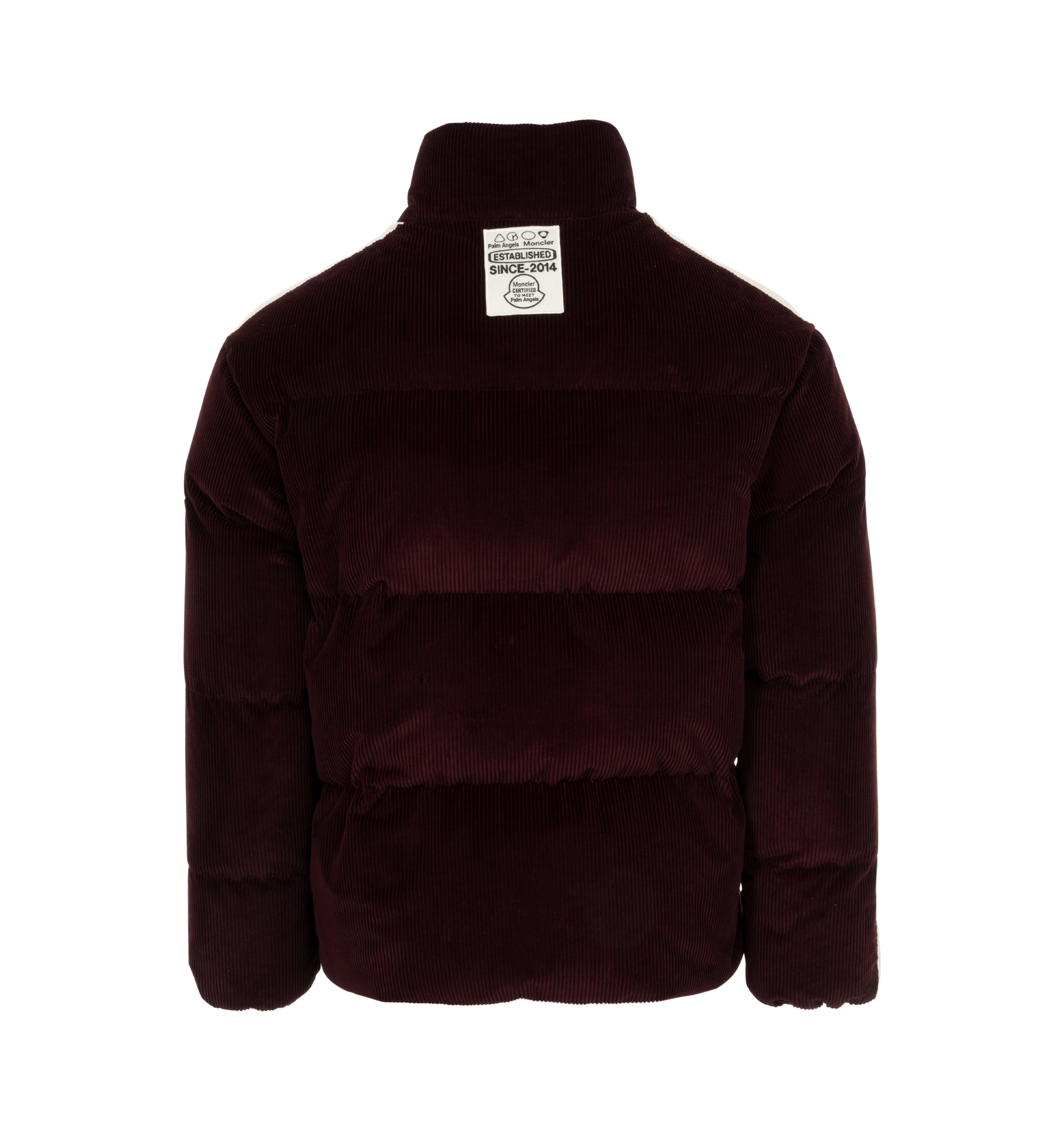 Moncler Genius X Palm Angels Abrolhos Jacket has a stand collar, a zipper closure, side zip pockets, logo patches, and a drawstring hem. Interior 90% down, 10% feather. Exterior 100% cotton. Made in Romania.