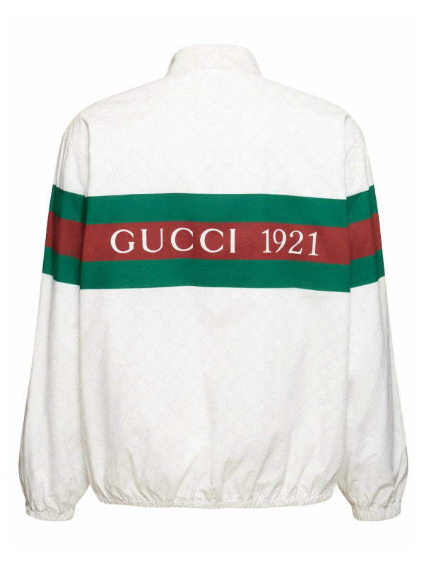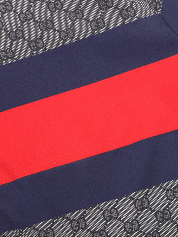 Showcases the signature Gucci monogram print with bold stripe detailing across the chest.