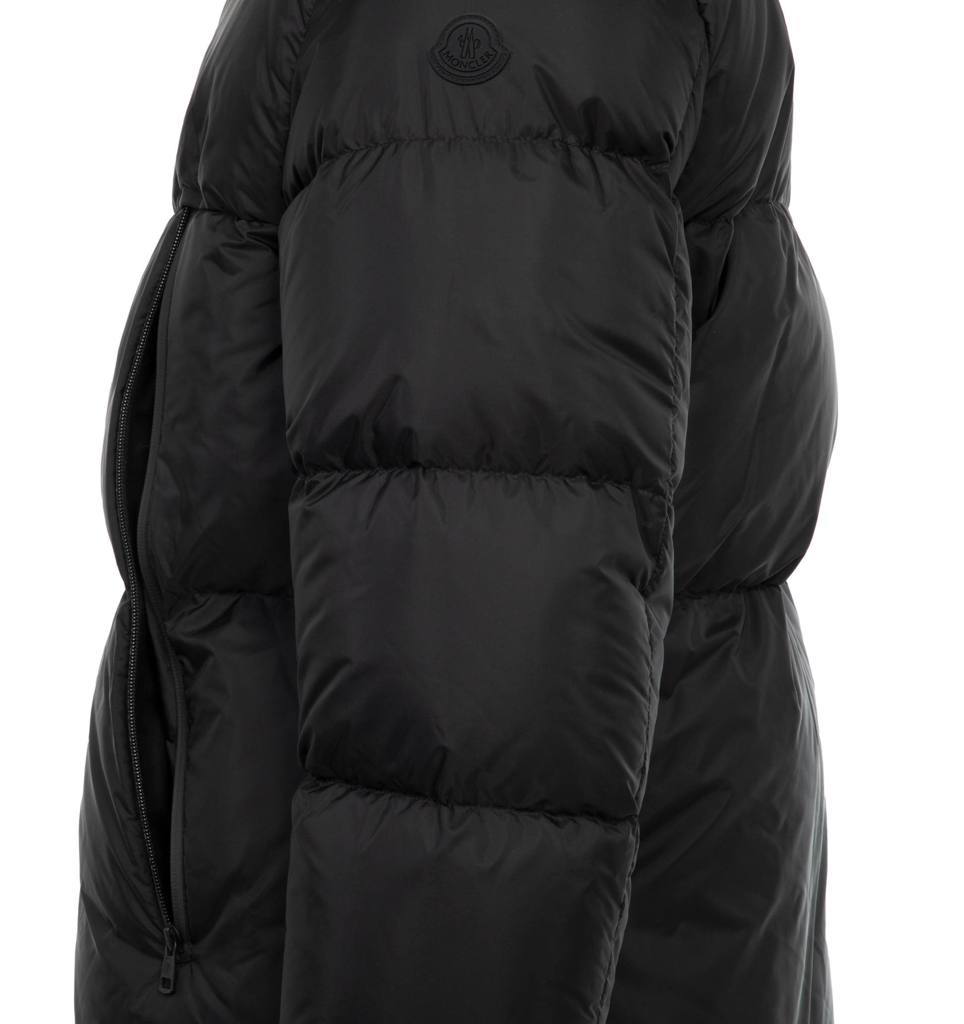 MONCLER Montcla Jacket has an adjustable drawstring hood, signature ribbon trim, front zipper closure, and zip pockets. 100% polyamide and nylon.
