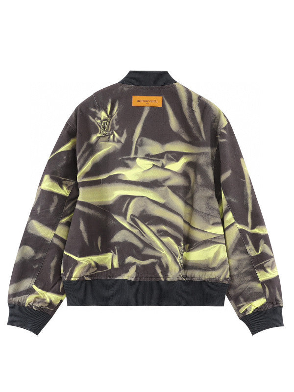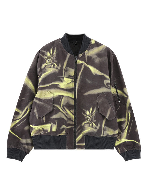 Make a bold statement with this unique Louis Vuitton Satin-Effect Bomber Jacket. Featuring a striking green and black abstract satin pattern, this jacket combines the iconic style of Louis Vuitton with a modern twist.