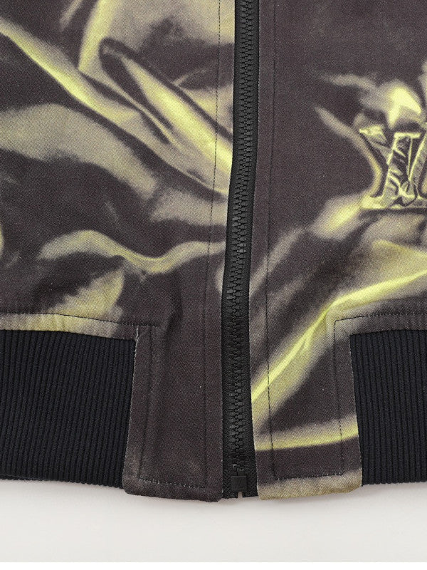 - Satin-Effect Print: The standout feature of this jacket is its glossy satin-effect print in shades of green and black, giving the fabric a luxurious, dynamic look that catches the light.