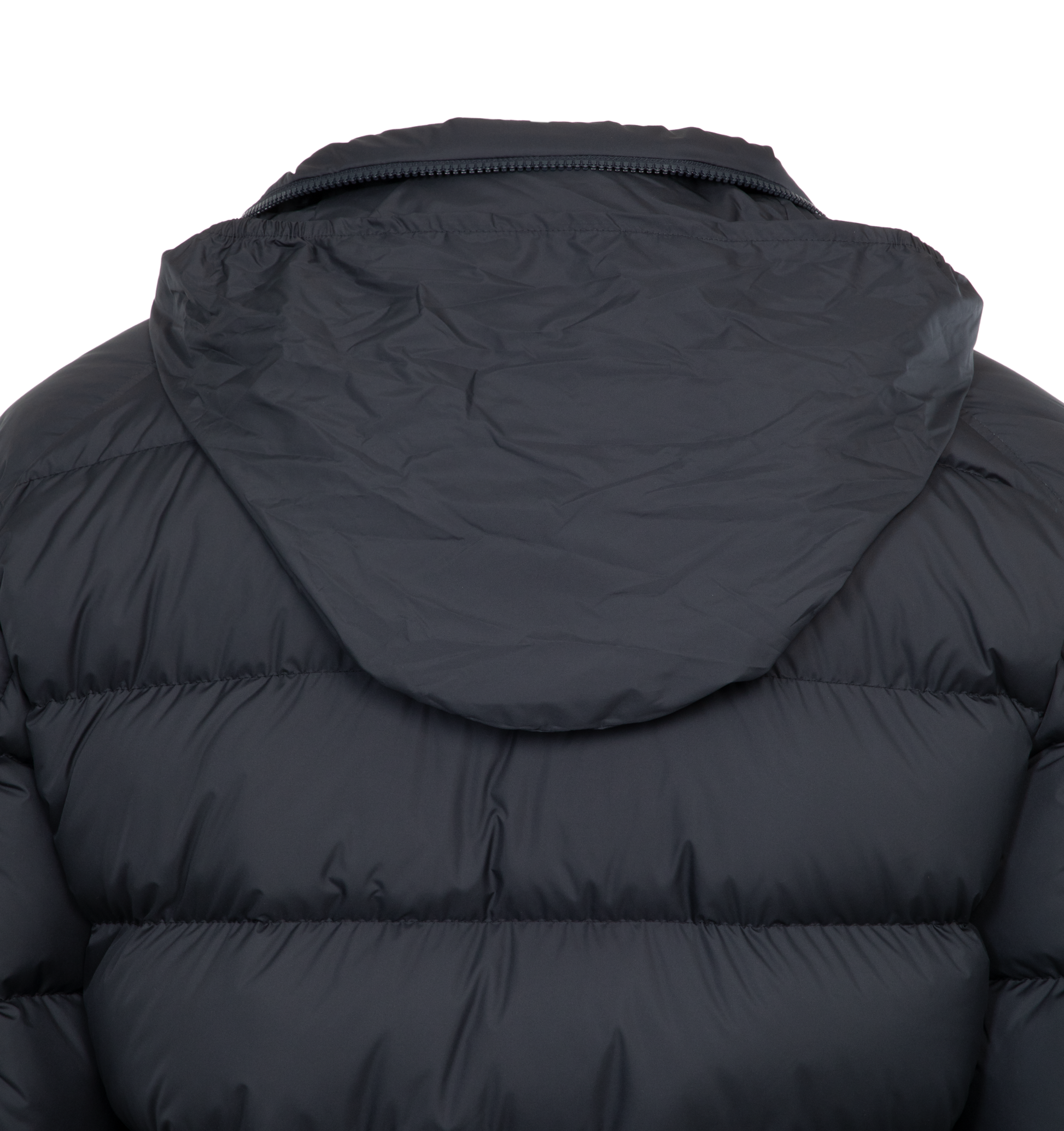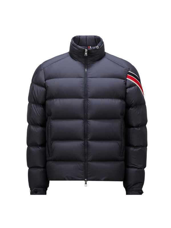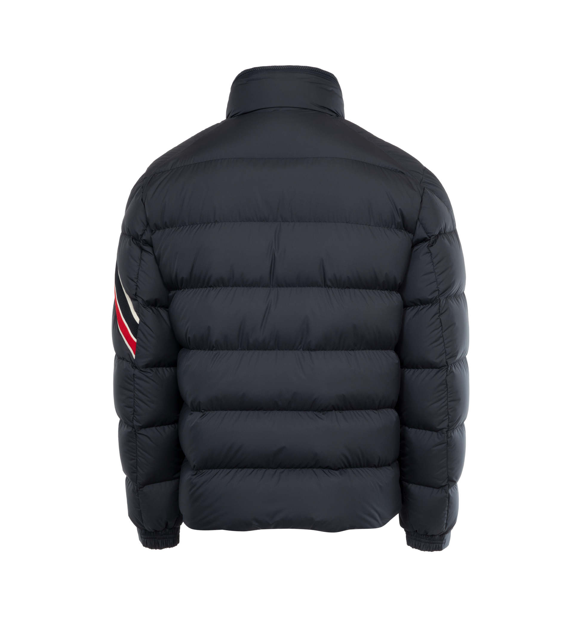 MONCLER Solayan Jacket featuring down-filled, stand collar with collapsable hood, zipper closure, zipped pockets, adjustable cuffs with snap button closure and stripes on sleeve. 100% polyester. Padding: 90% down, 10% feather.