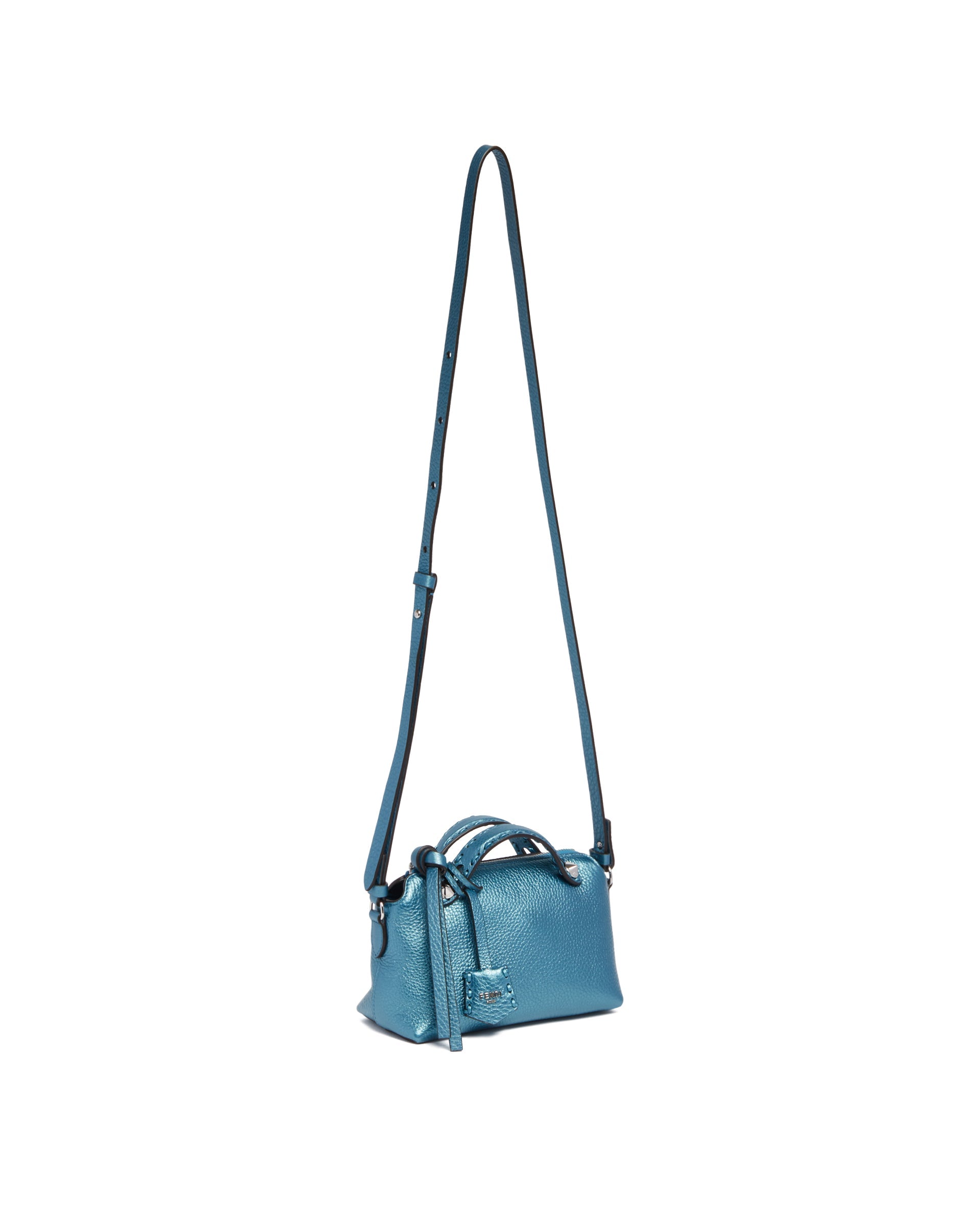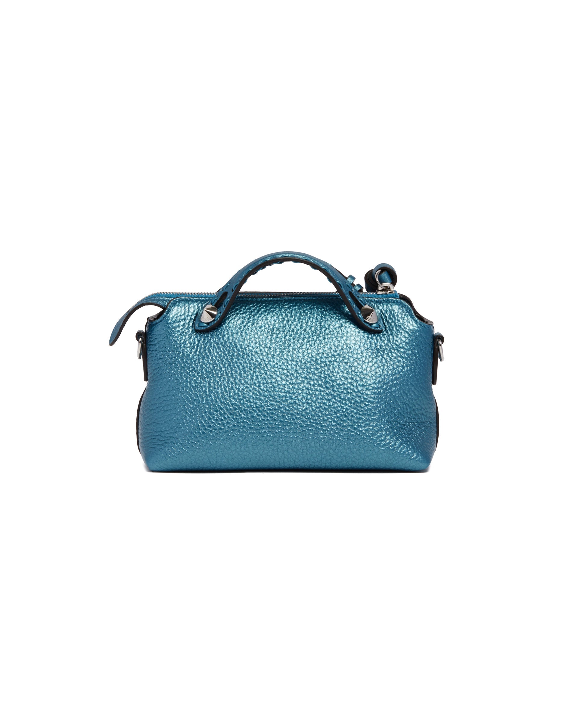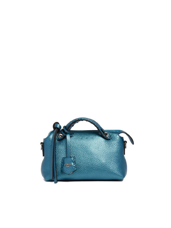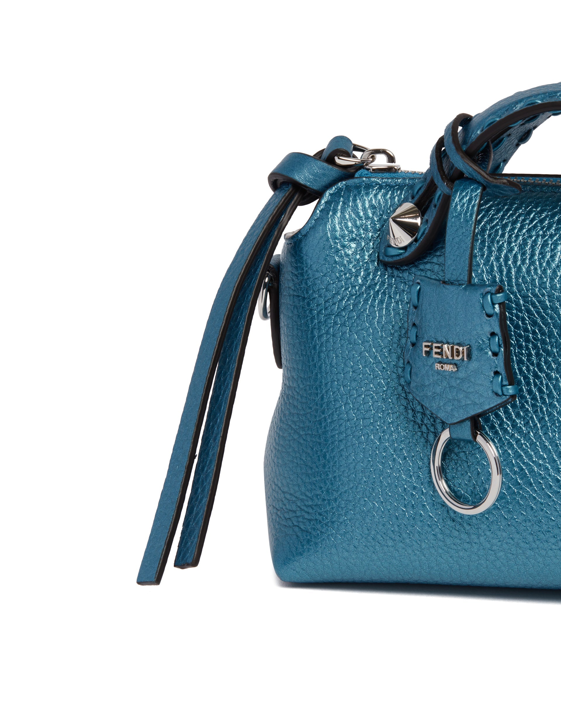 Fendi Blue By The Way Selleria Mini Bag. Blue leather with a metallic finish, 156 hand-stitched tone-on-tone macro stitches, iconic Selleria craftsmanship. Tone-on-tone handles, adjustable and removable shoulder strap, customizable charm and long zipper p