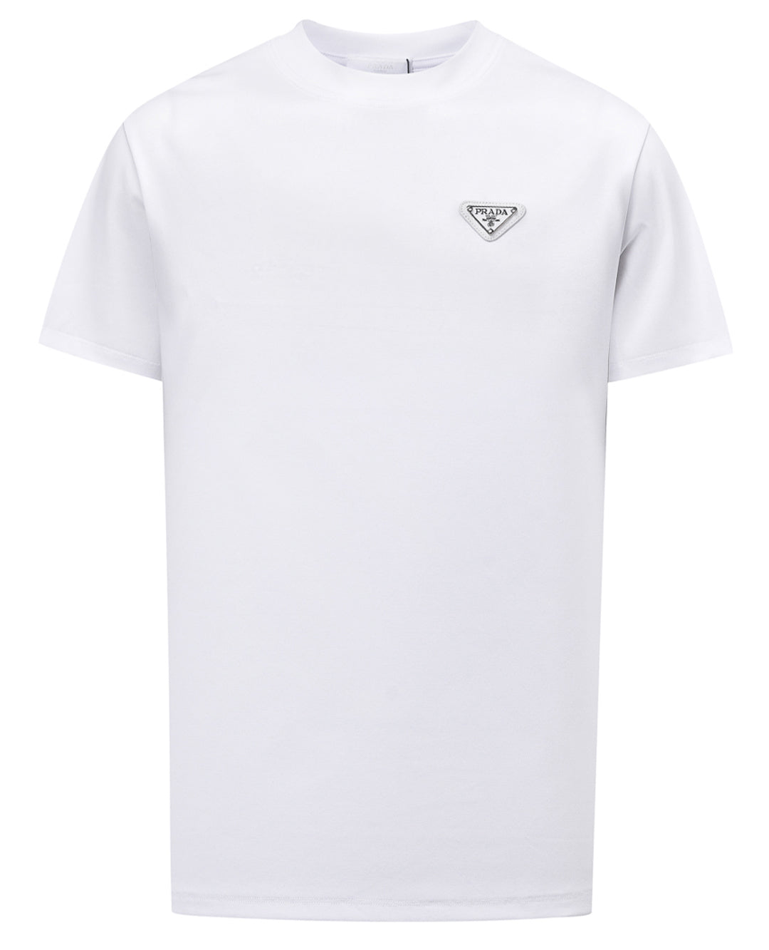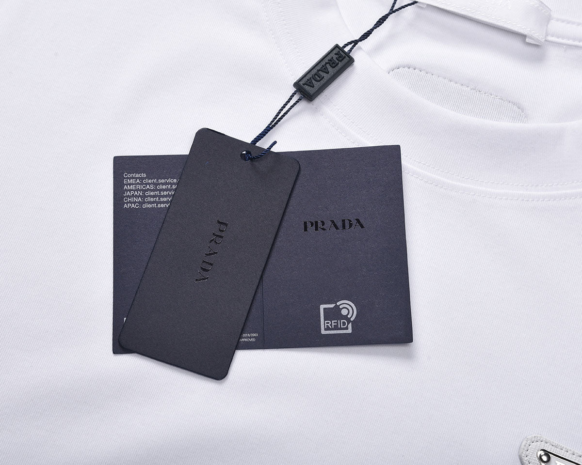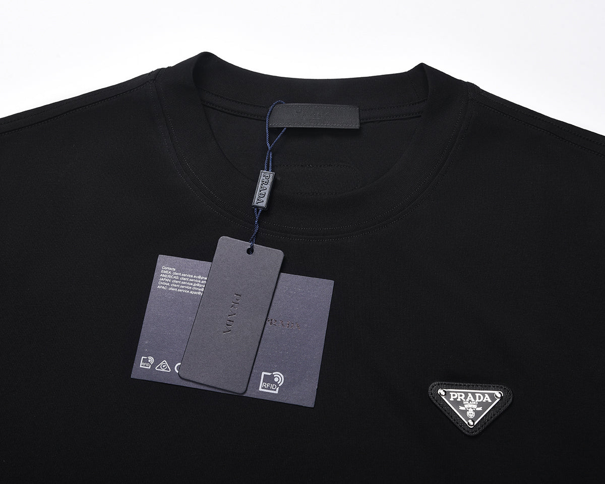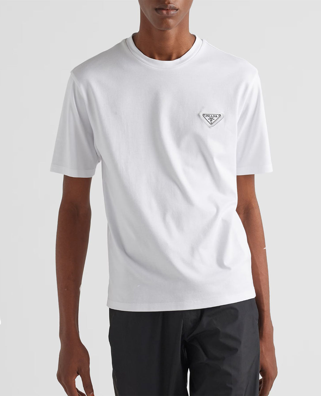 Elevate your essentials with this premium Prada Milano t-shirt, crafted in Italy from 100% high-quality cotton for exceptional comfort and breathability. The design features a minimalist silhouette enhanced by Prada’s iconic rubber triangle logo patch on the chest and branded neckline detailing for a refined finish.