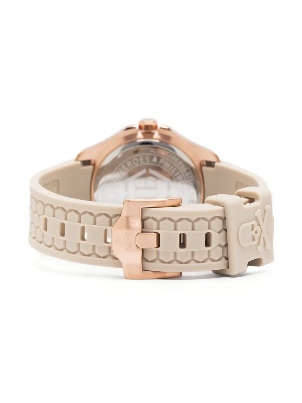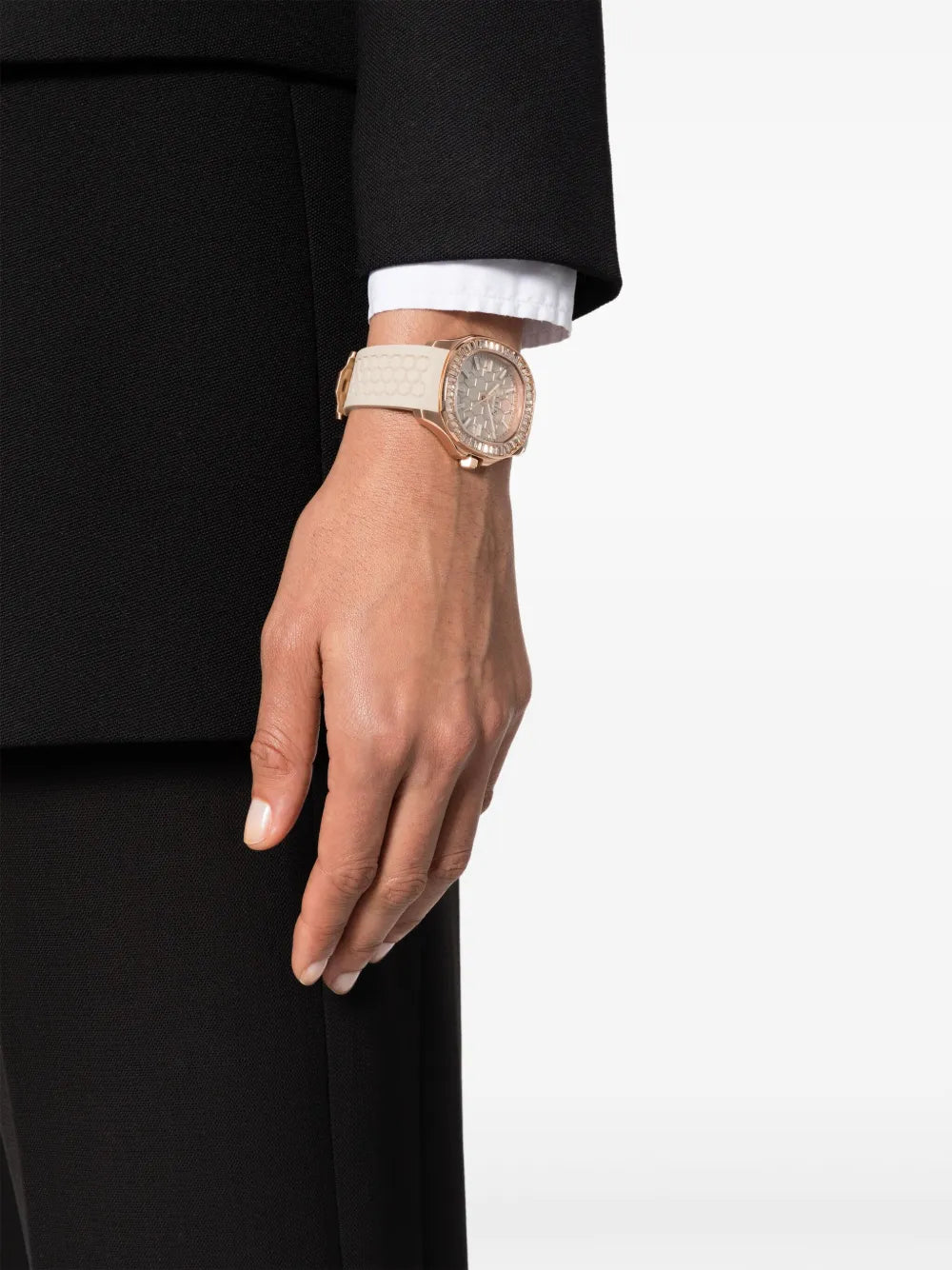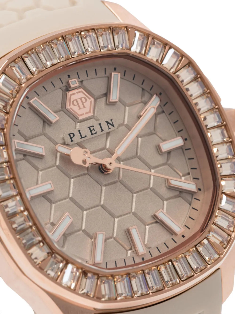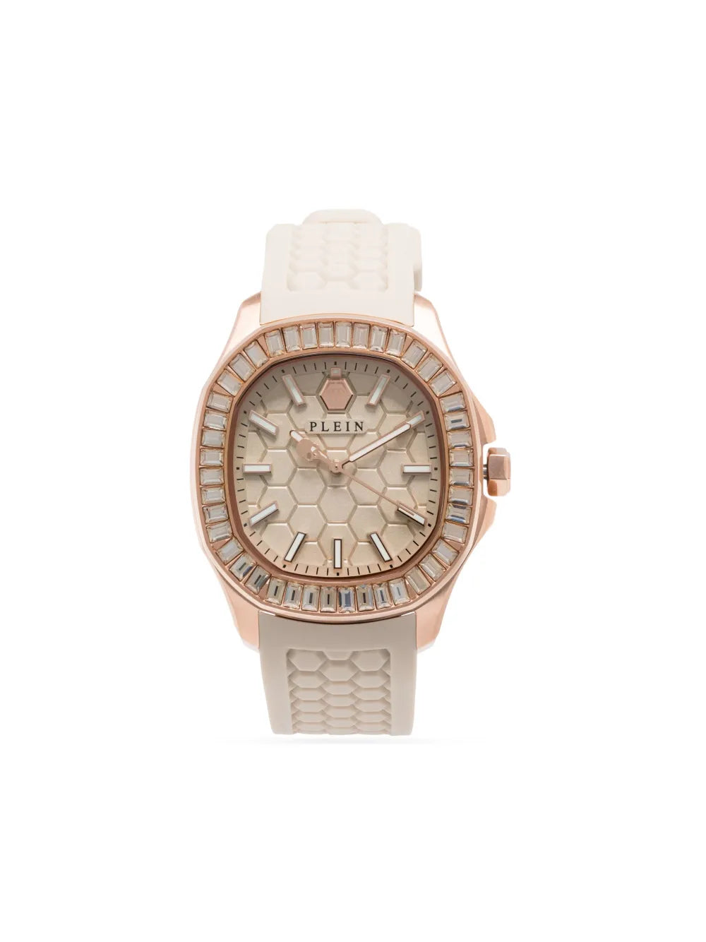 Philipp Plein showcases its affinity for precise silhouettes in the design of this Spectre Lady 38mm. The cushion-shaped case houses a taupe dial with a hexagonal pattern, which continues across the strap. The bezel is framed with coordinating faceted crystals.