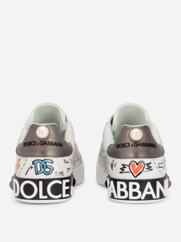 Make a bold statement with the Dolce & Gabbana Graffiti Portofino Sneakers. These unique sneakers feature vibrant, hand-drawn graffiti designs that bring a playful and artistic touch to your footwear collection. Crafted from premium materials, they ensure both style and comfort.