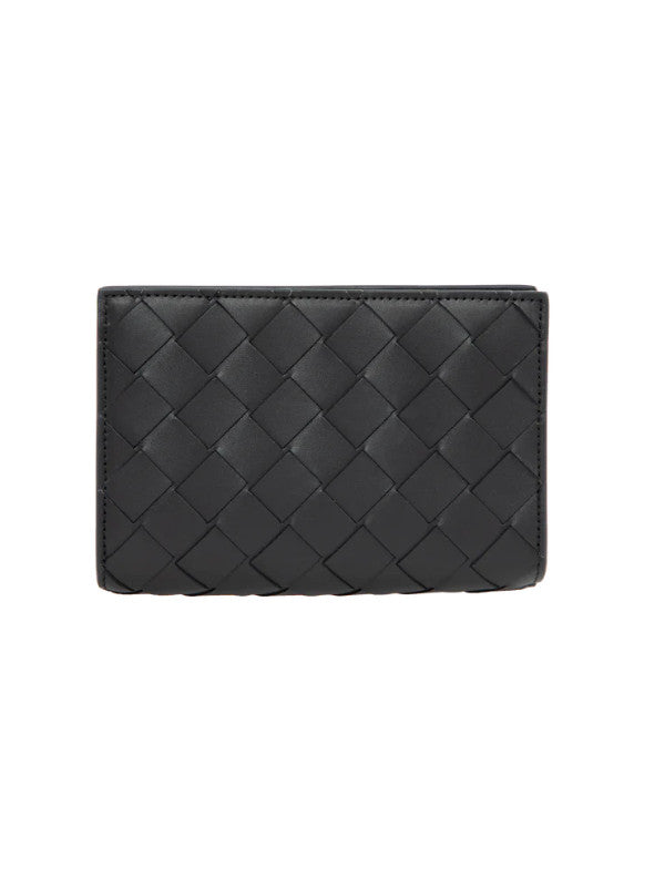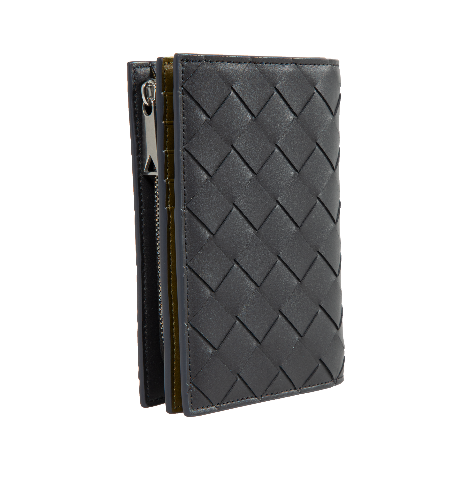 BOTTEGA VENETA Intrecciato Medium Bi-Fold Wallet With L-Zip featuring intrecciato calfskin leather wallet with contrasted interior, ten card slots, two note compartments, one L-zipped coin purse and snap button closure. 5.4" x 3.7" x 1.2". Calfskin.