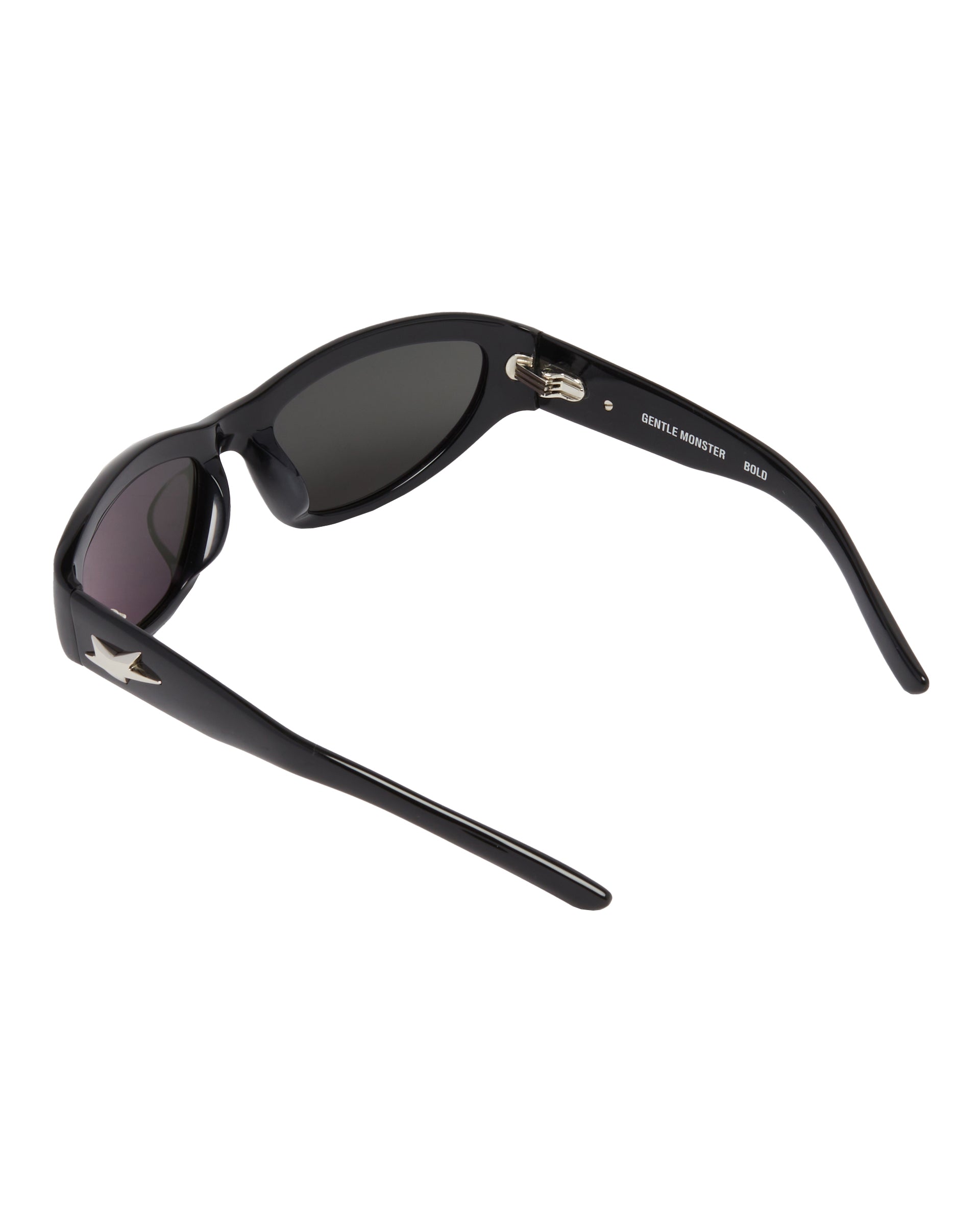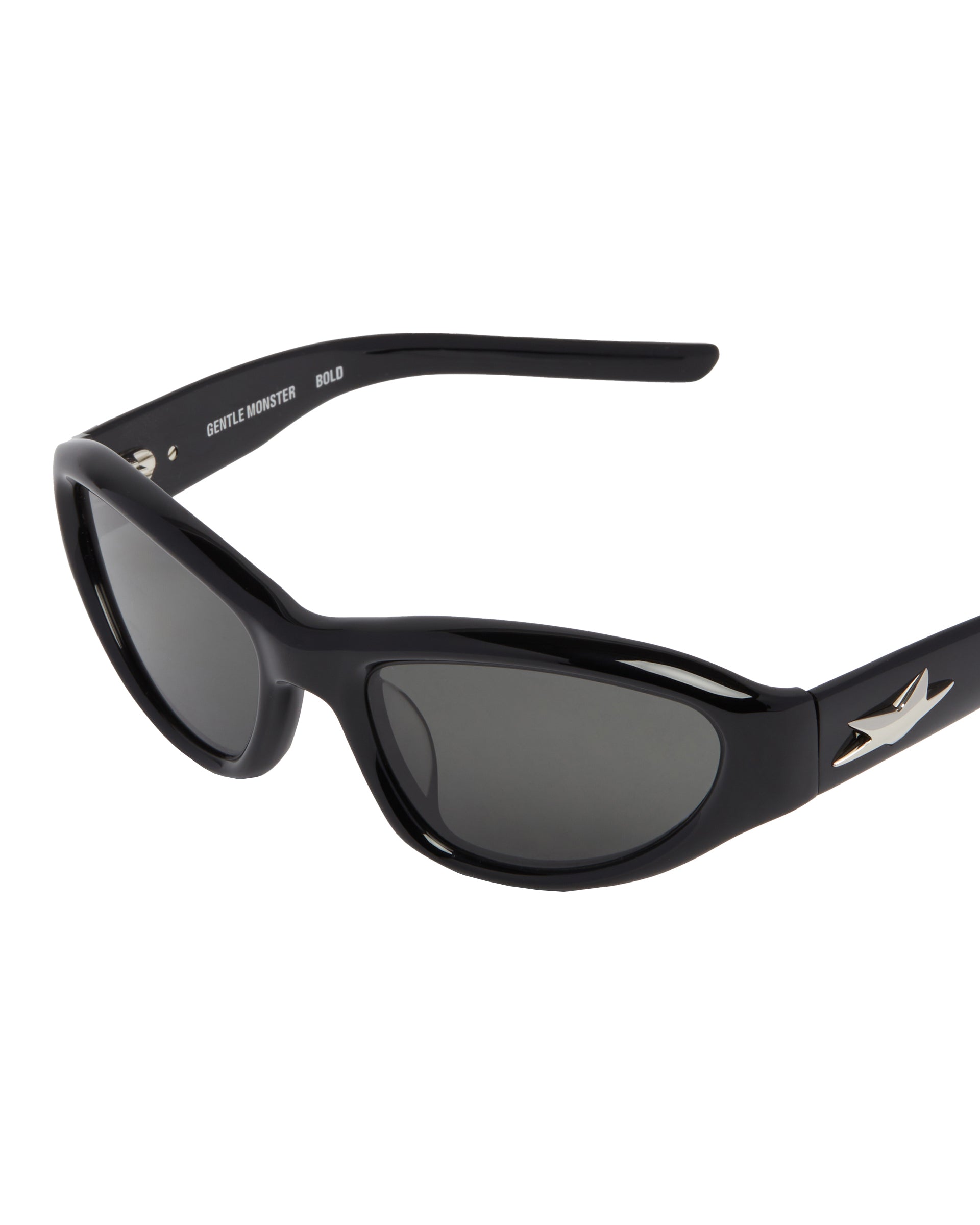 Gentle Monster Black R.E.A.T 01 Sunglasses. Black acetate frame, futuristic aviator silhouette. Temples featuring the Bold Collection's signature logo. Black lenses.