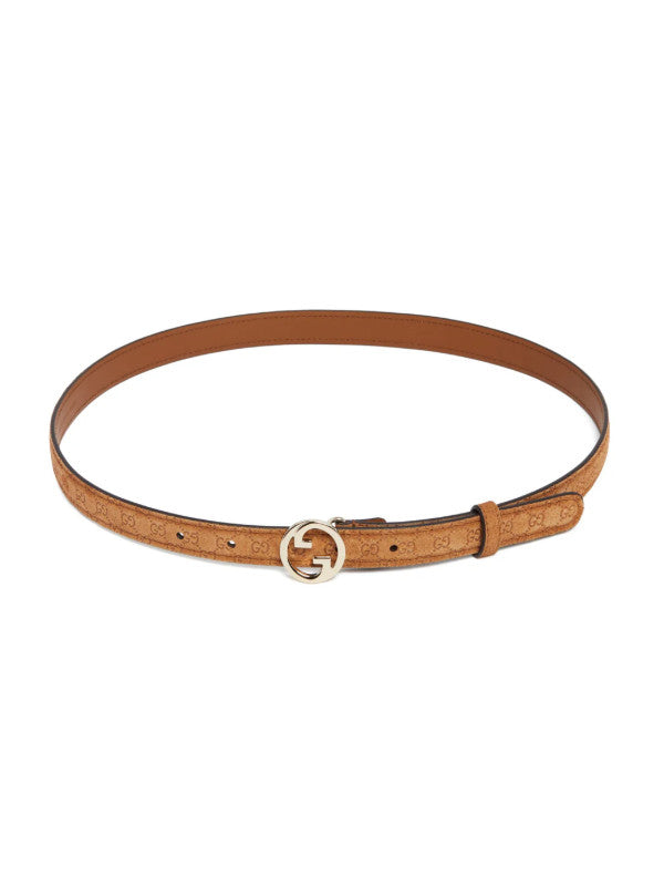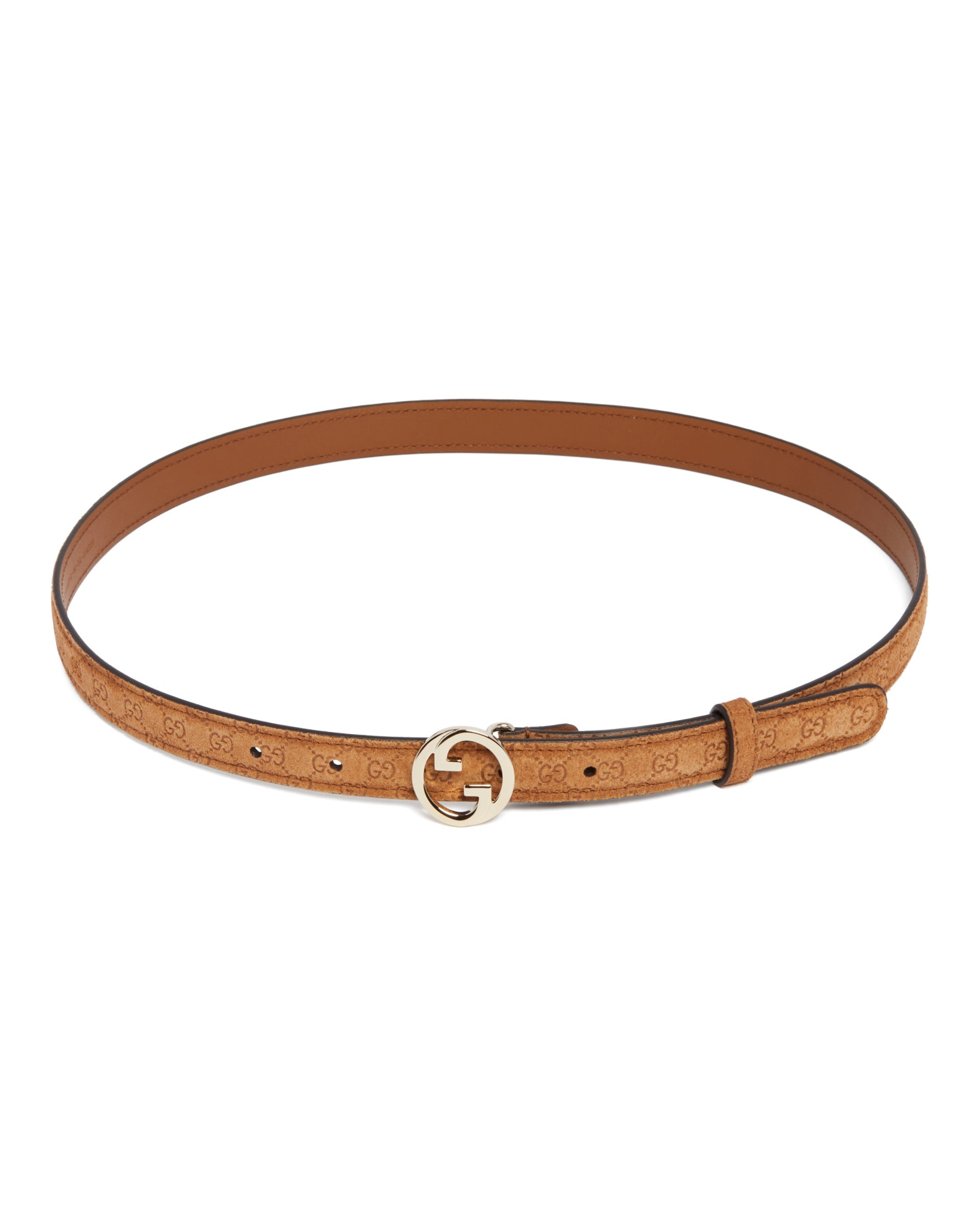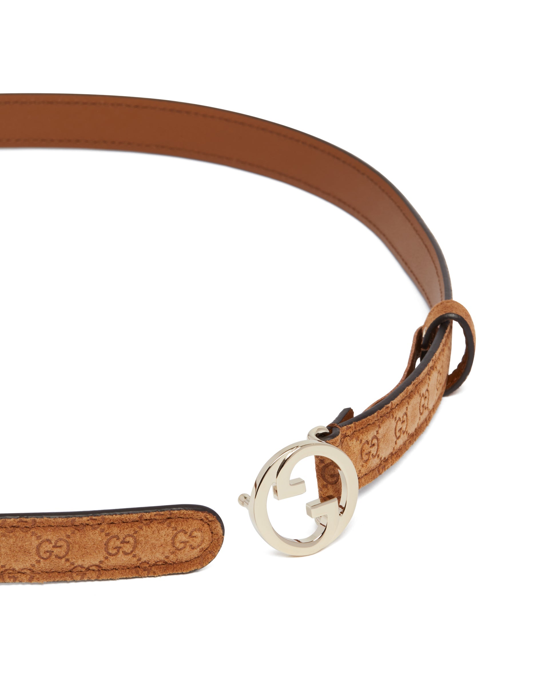 Gucci Blondie Slim Belt. Brown mini GG suede leather, light gold-tone finishes and round buckle featuring the GG crossover.