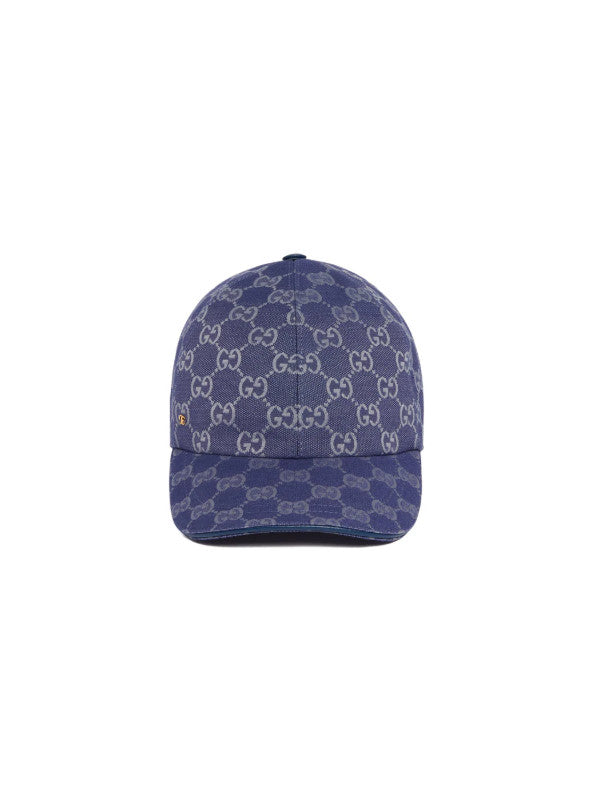 Gucci Blue GG Cotton Cap. Blue and gray GG cotton fabric, blue leather trims, adjustable Velcro closure at the back, gold-tone hardware.