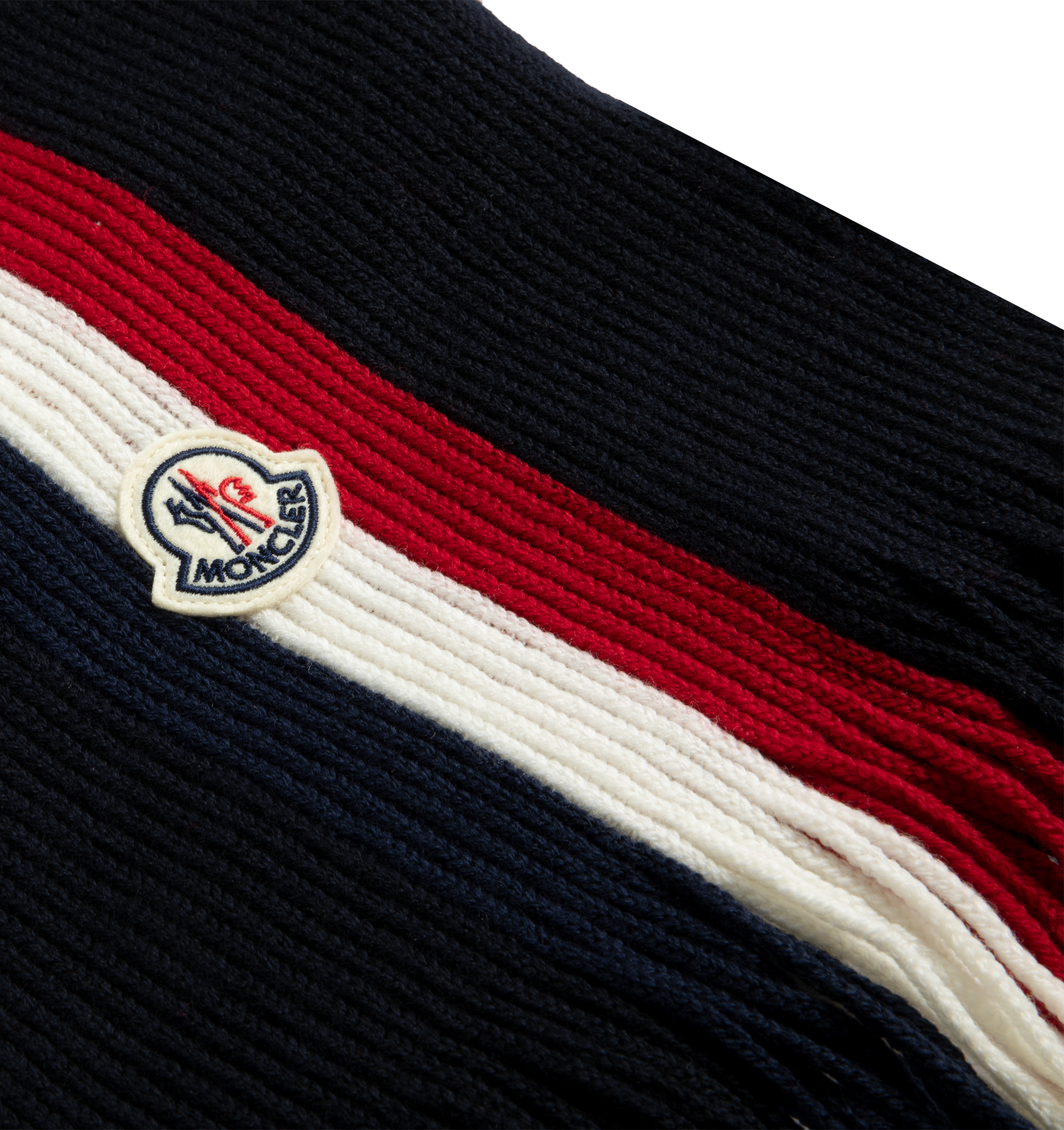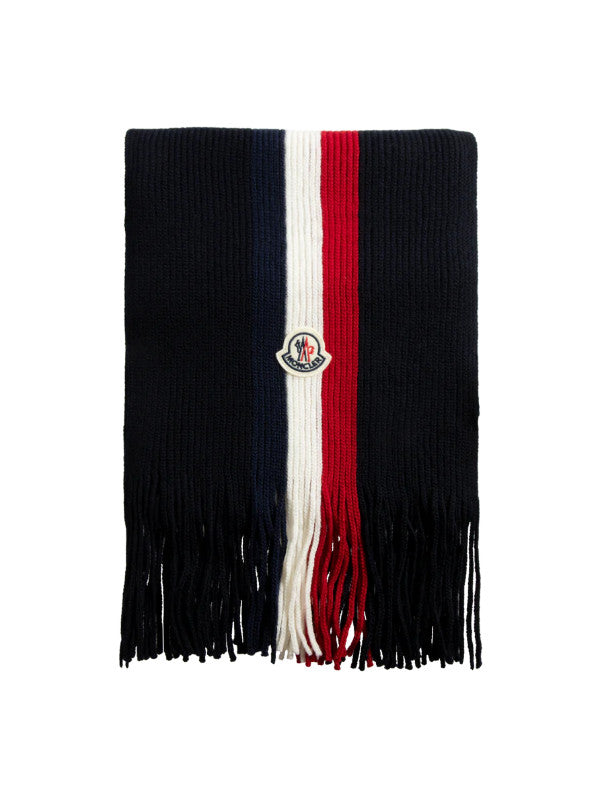 MONCLER Tricolor Wool Scarf featuring ultra-fine wool, english rib knit, gauge 5 and logo patch. 100% virgin wool.