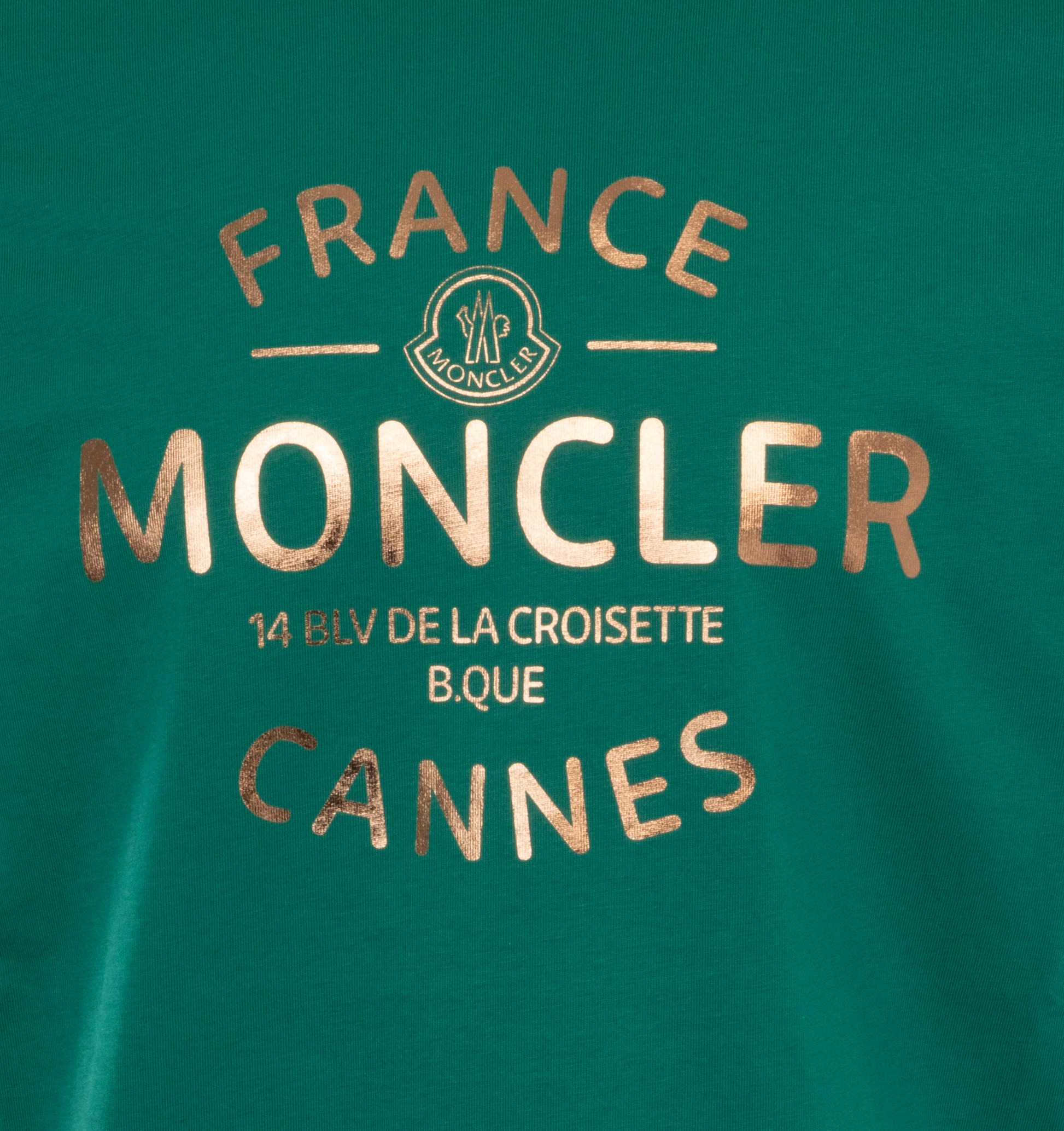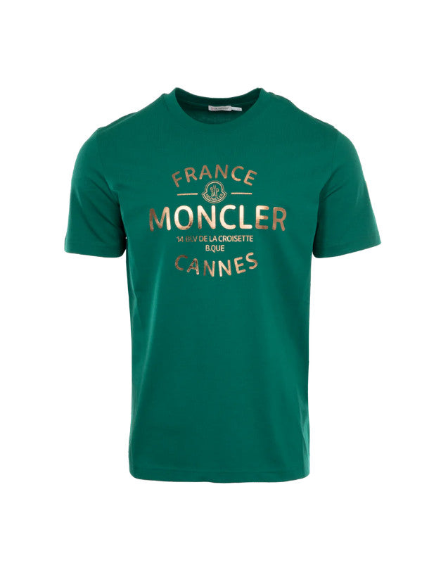 MONCLER Metallic Logo T-Shirt featuring cotton jersey, crew neck, short sleeves and laminated print. 100% cotton.