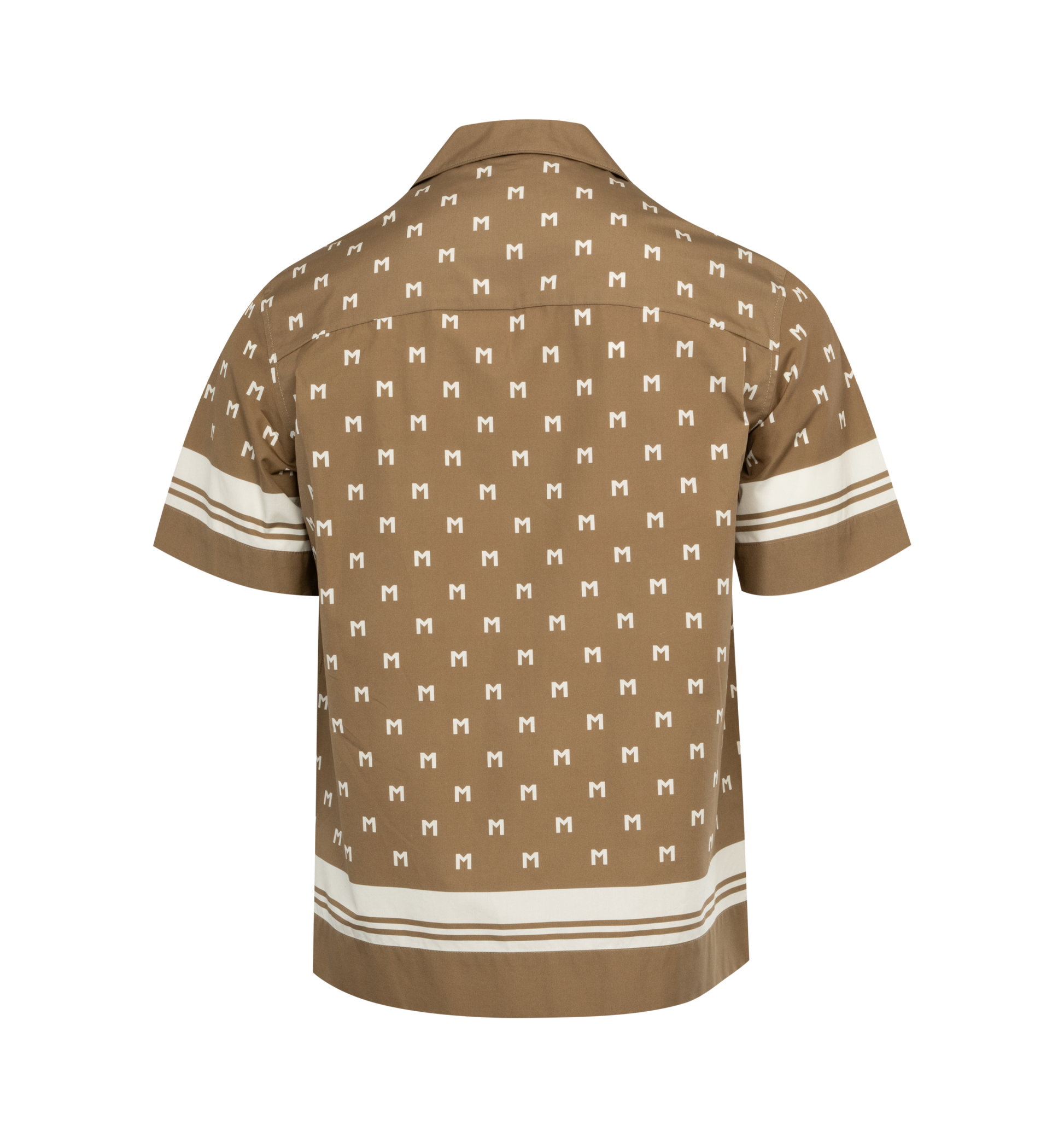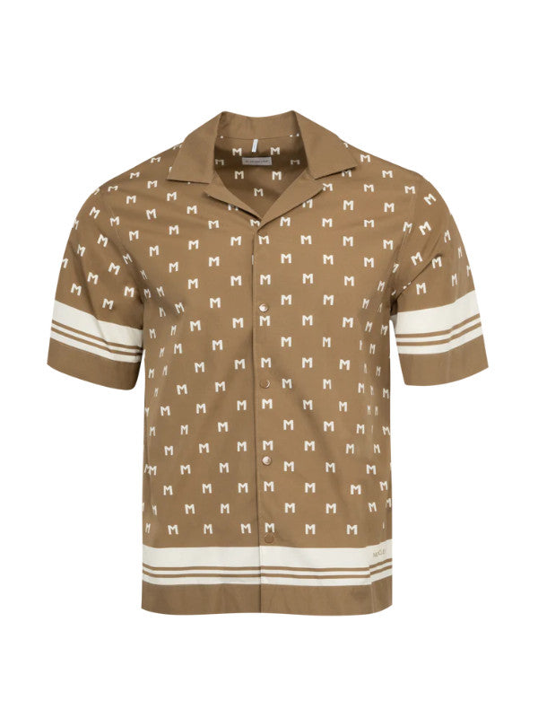 MONCLER Monogram Print Shirt featuring cotton poplin, collar, short sleeves, snap button closure and logo patch. 100% cotton. Made in Romania.