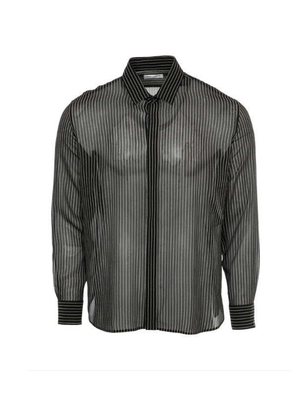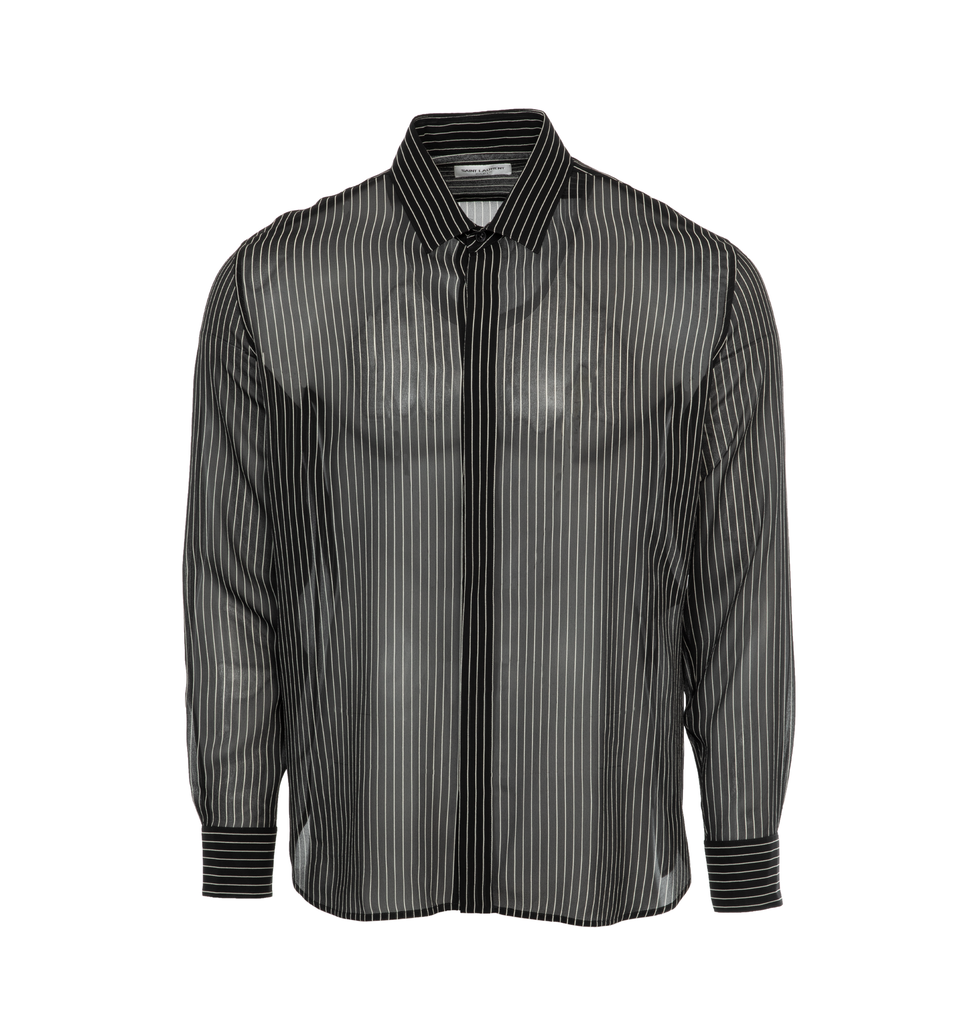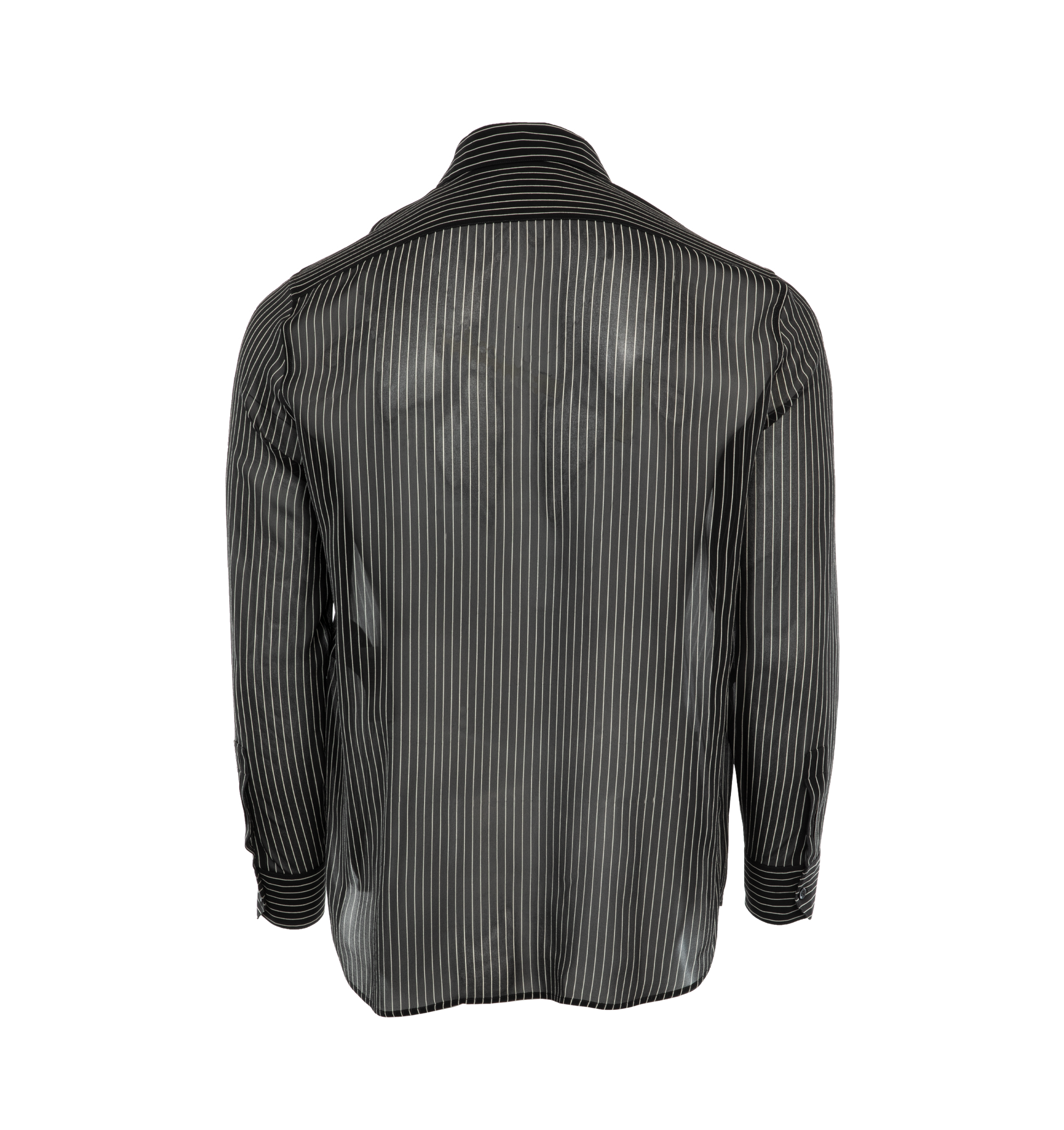 SAINT LAURENT Pinstripe Silk Shirt featuring pointed collar, concealed button placket, one button mitered cuff and curved hem. 100% silk.