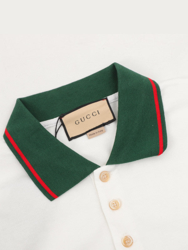 Crafted in Italy from 100% premium cotton, this white polo shirt features Gucci's signature Web-stripe trim in forest green and red, adding a touch of iconic sophistication. The jersey knit fabric ensures a comfortable fit, making it perfect for any occasion.