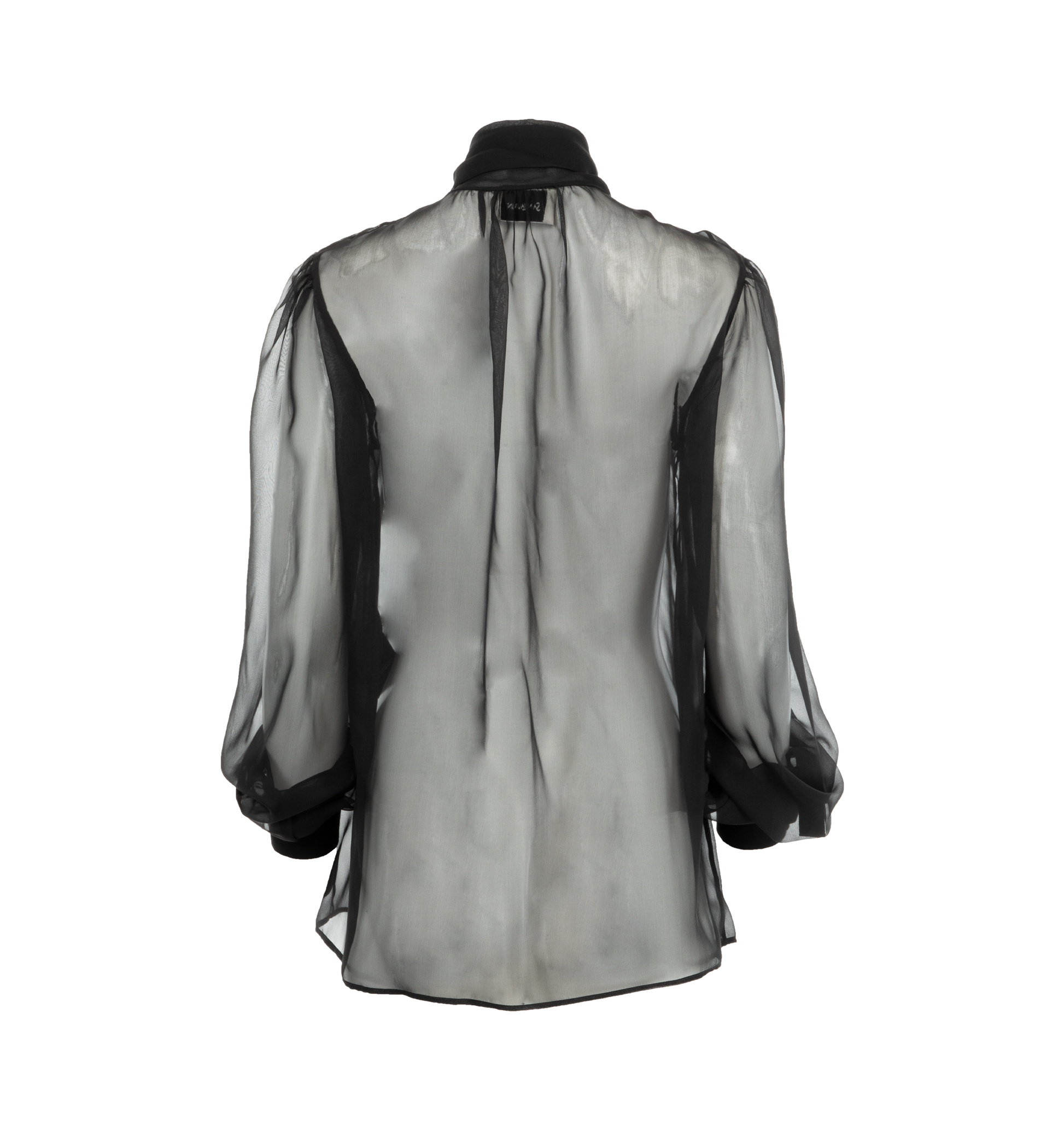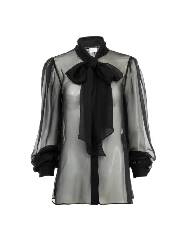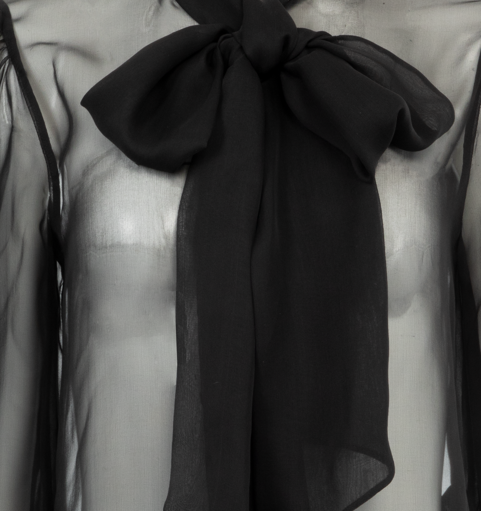 Saint Laurent Bow Neck Chiffon Blouse is a pullover style with a round neckline, bow, and button cuffs. 100% silk. Made in Italy.