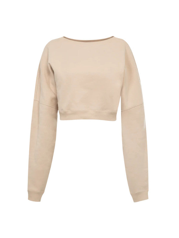 SAINT LAURENT Cropped Sweater featuring wide round neck, ribbed trims, drop shoulder and tonal logo embroidery on sleeve. 100% cotton. Made in France.