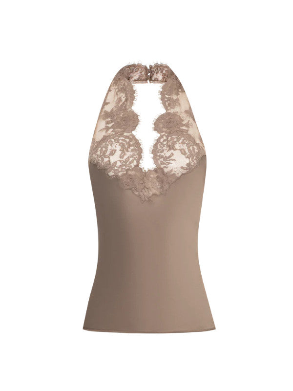 SAINT LAURENT Halter Top featuring V neckline with scalloped lace décolleté, button closure at the back neck and backless. 100% silk.