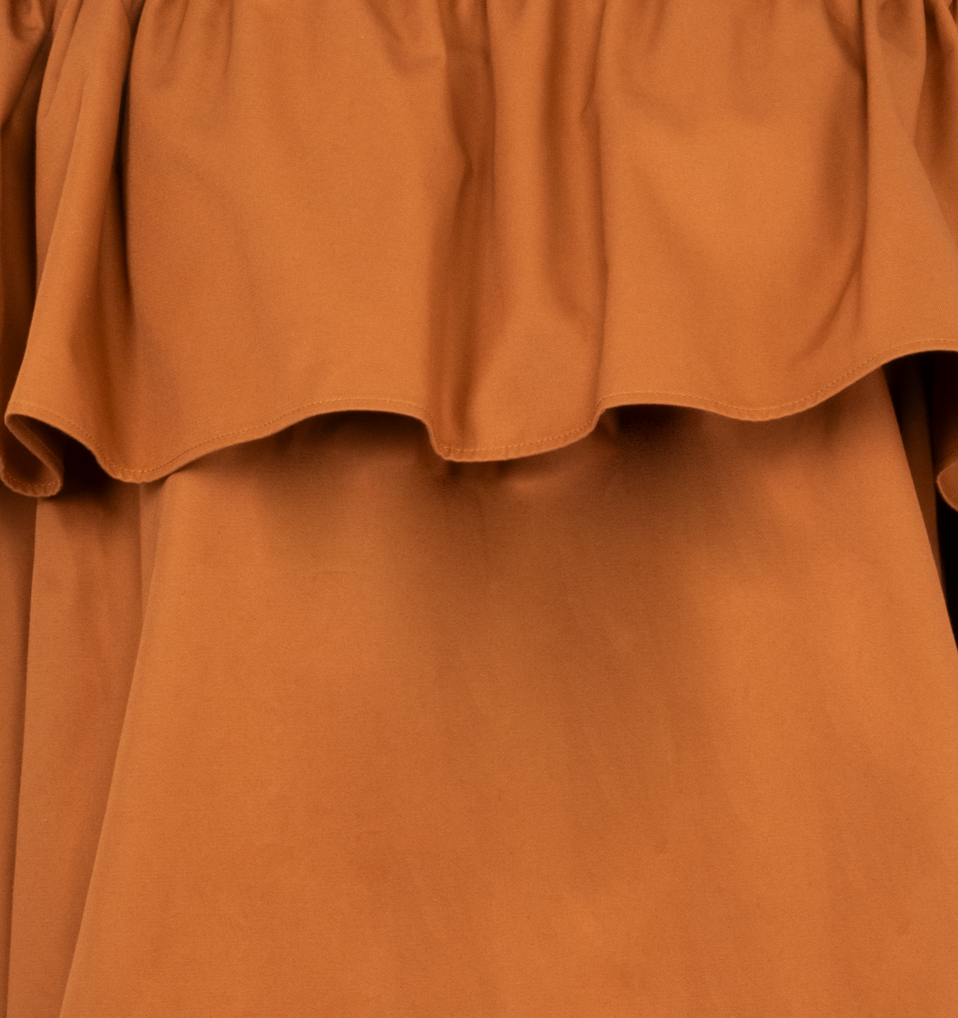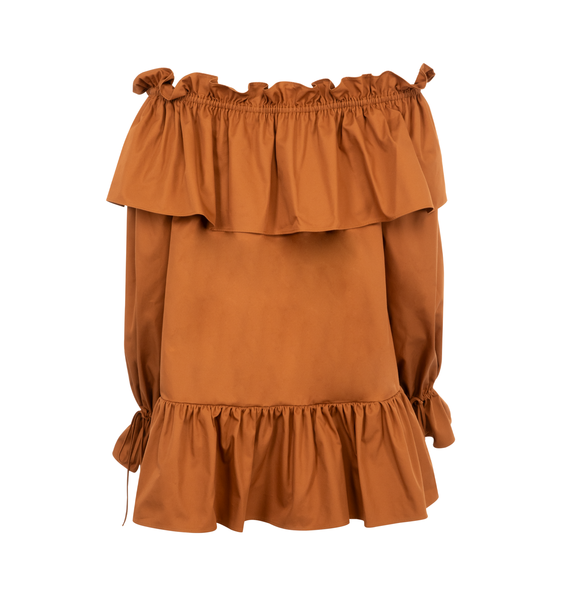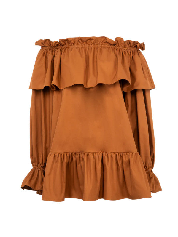 Saint Laurent off-the-shoulder dress made with certified cotton, featuring an oversized ruffle neckline and hem, drawstring poet sleeves, and concealed pockets. 100% COTTON. Made in France.