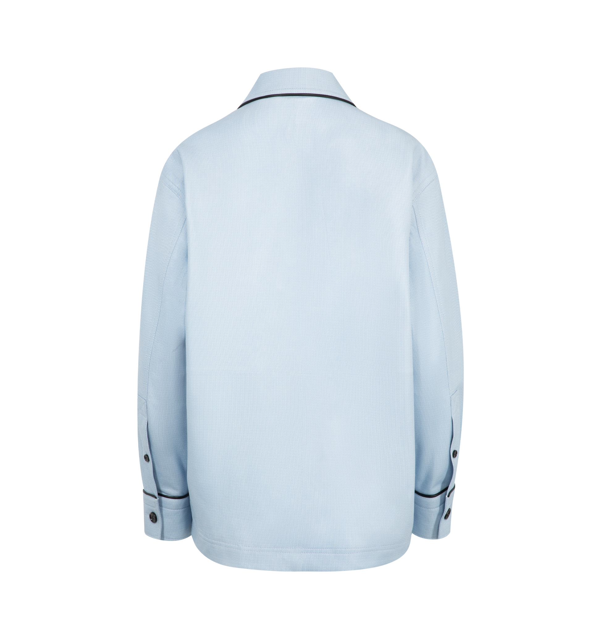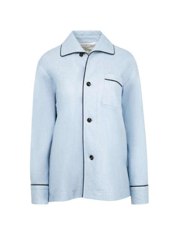 Bottega Veneta Printed Leather Shirt is a collared style with a front button closure, contrast piping, printed design on lambskin, contrast stitching, and a chest pocket. Fully lined. 100% lambskin. Made in Italy.
