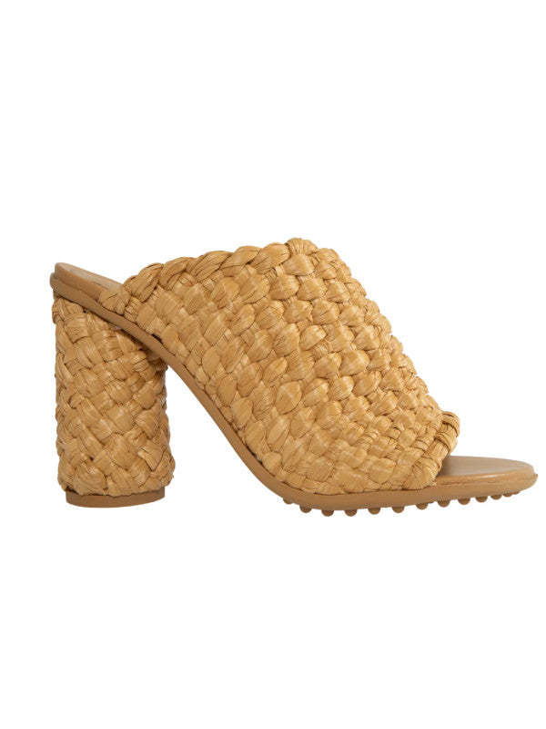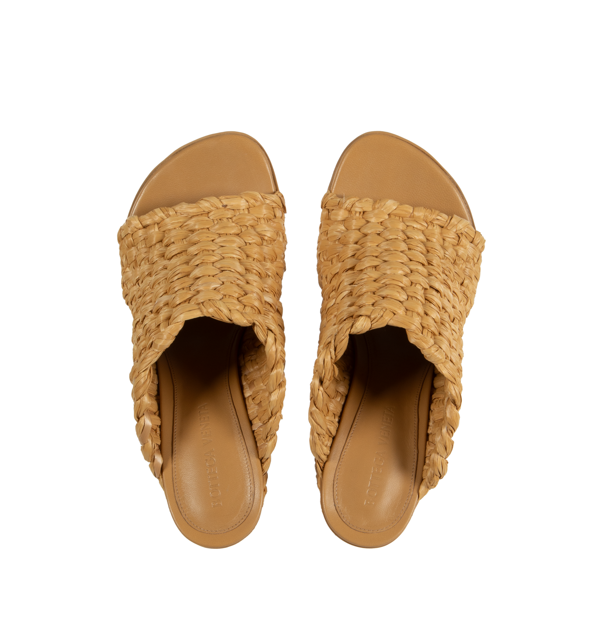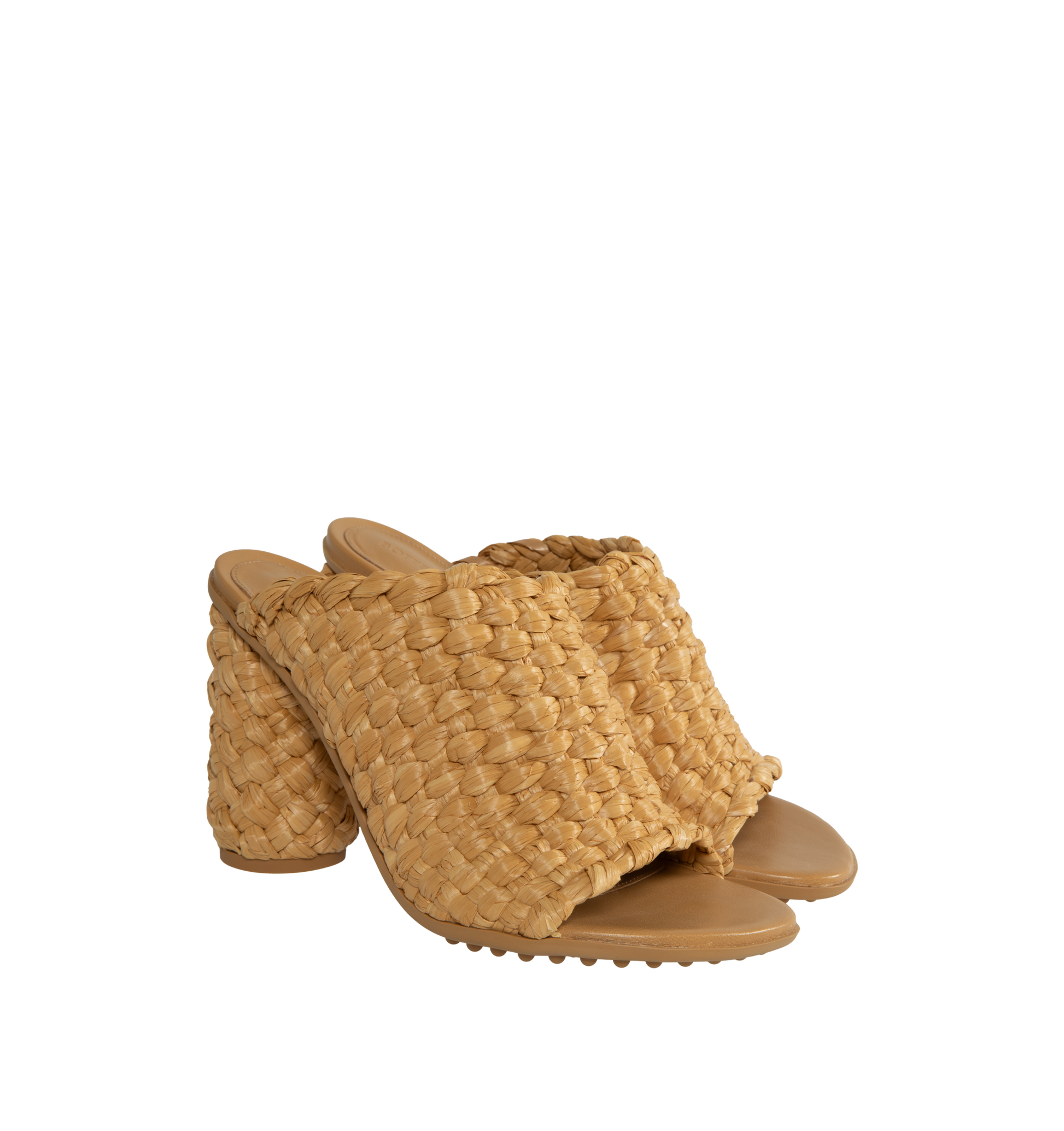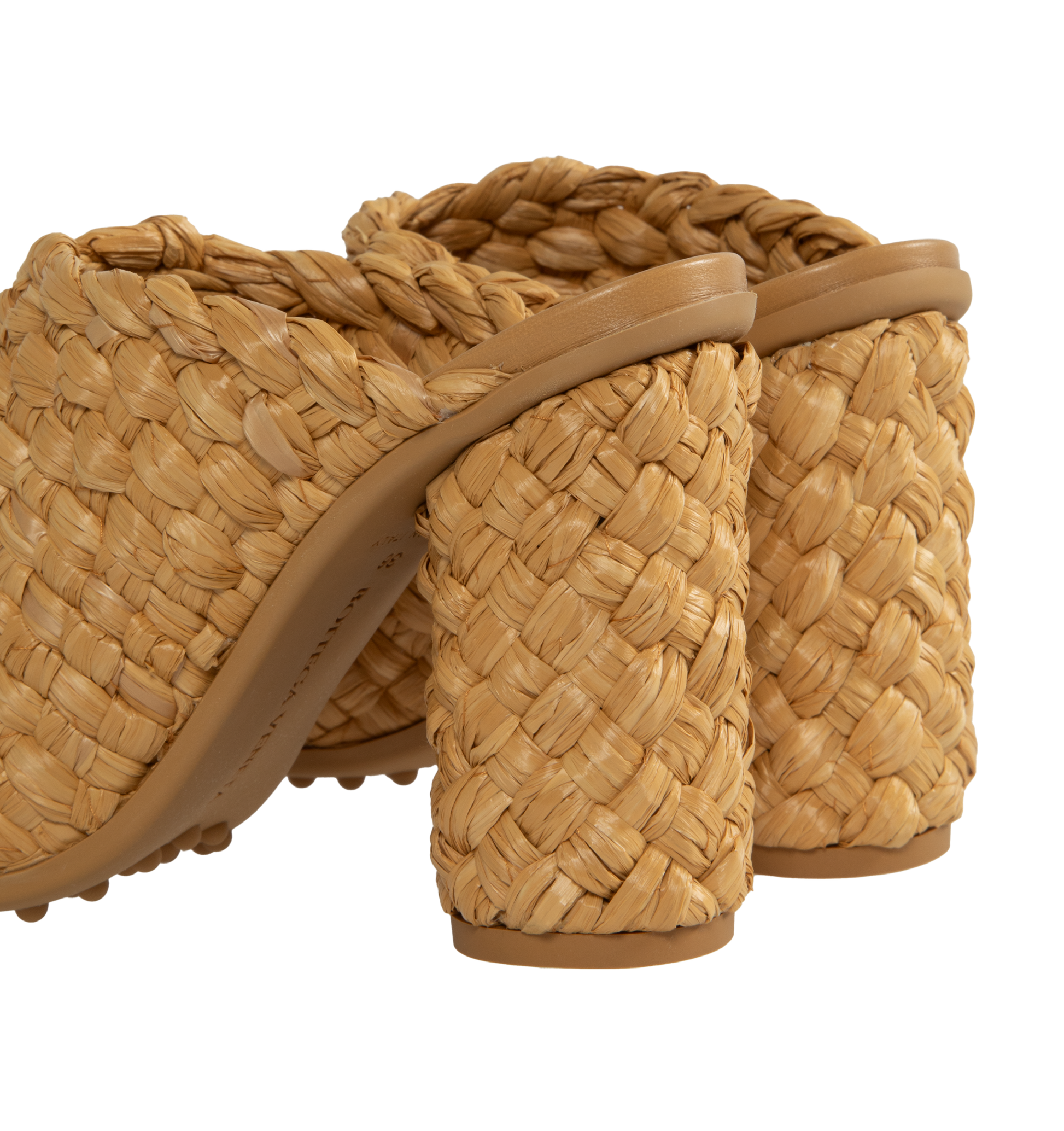 BOTTEGA VENETA Atomic Intrecciato Raffia Sandals featuring woven raffia into a towering silhouette set atop a thick cylindrical heel, rubber-gripped soles and slips on. 4" heel. Raffia. Made in Italy.