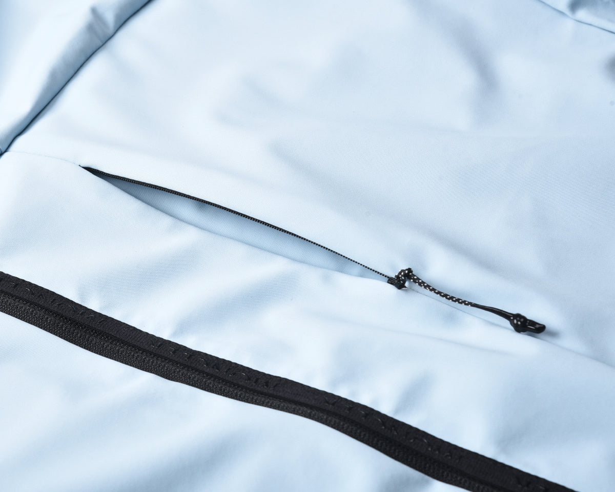 Crafted from a high-density water-repellent technical fabric, it’s ideal for transitional weather or layering over activewear. The bonded black zipper and trim provide a sharp contrast and modern edge, while the zip-secured chest pocket adds functionality without sacrificing aesthetics.