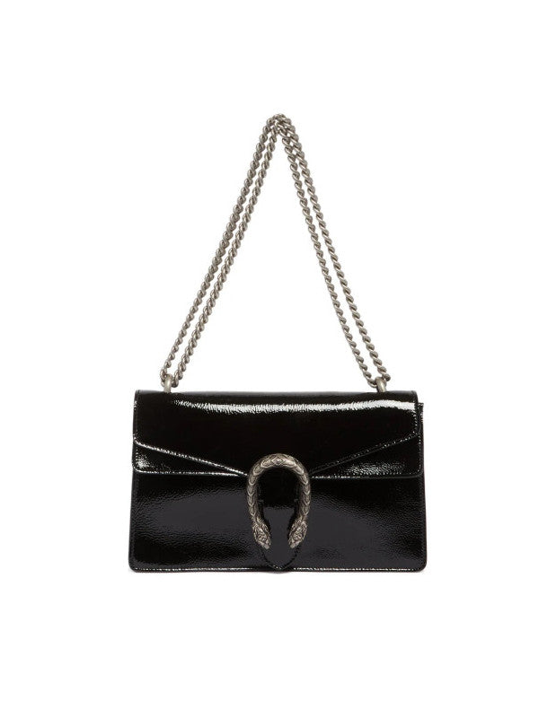 Gucci Black Dionysus Small Shoulder Bag. Black leather, patent finish, silver-tone hardware, pin fastening with side release. Iconic Tiger head fastening, interior zipped compartment. Pocket under the flap, double gussets construction, sliding chain strap. Size (cm): 28X16X10.5