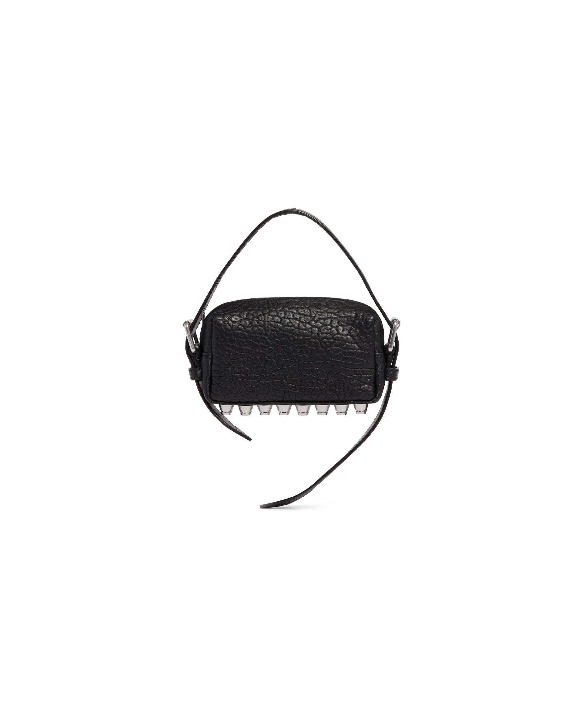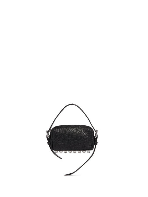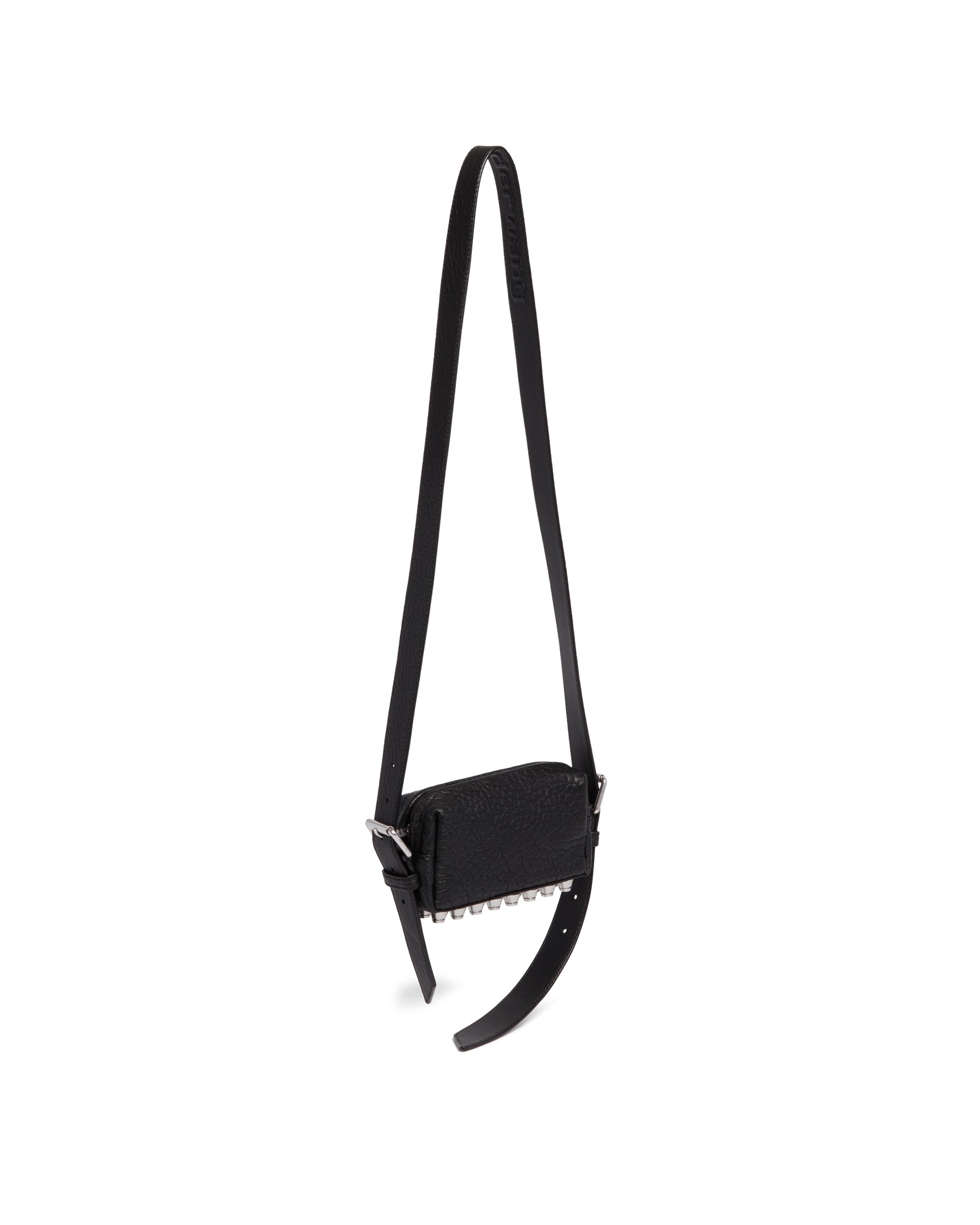 Alexander Wang Black Ricco Small Leather Bag. Black leather, top zip closure, adjustable shoulder strap featuring an embossed logo. Bottom with trap studs, main compartment lined with twill and an internal credit card pocket. Size (cm): 17X10X4