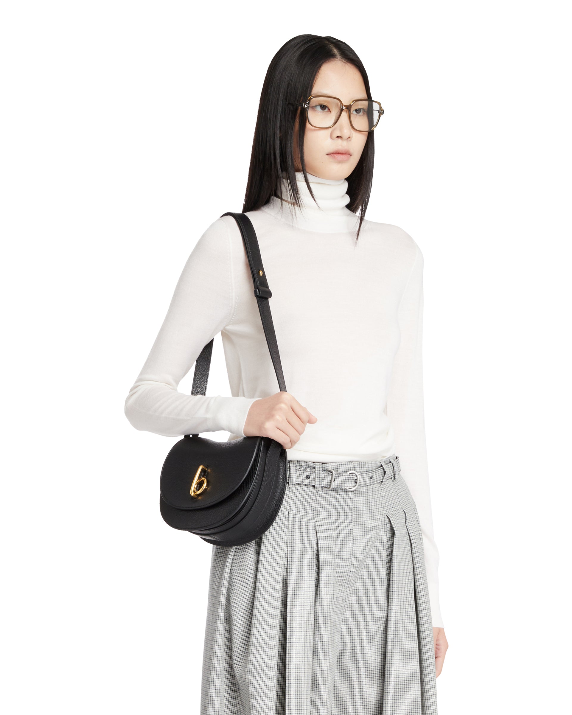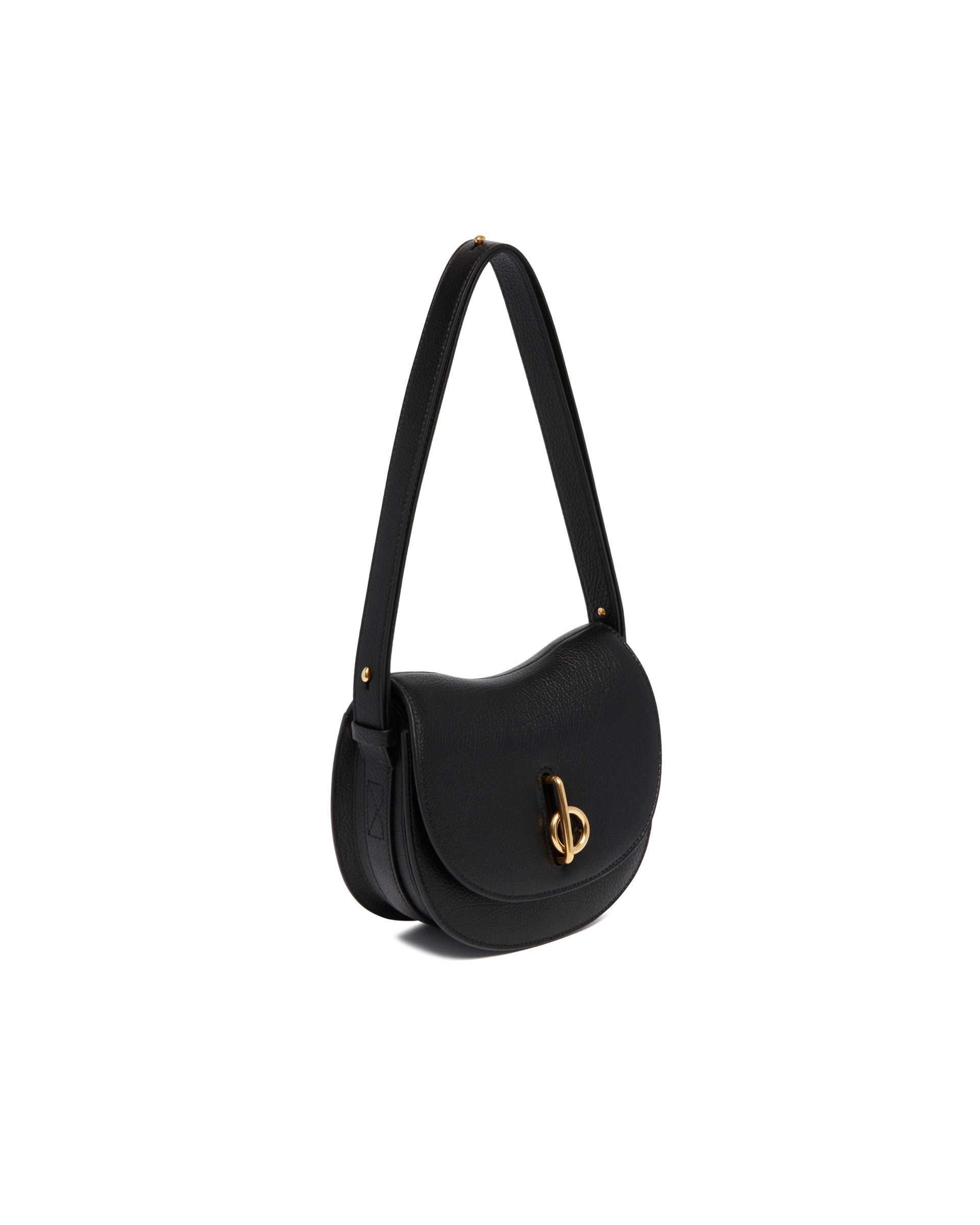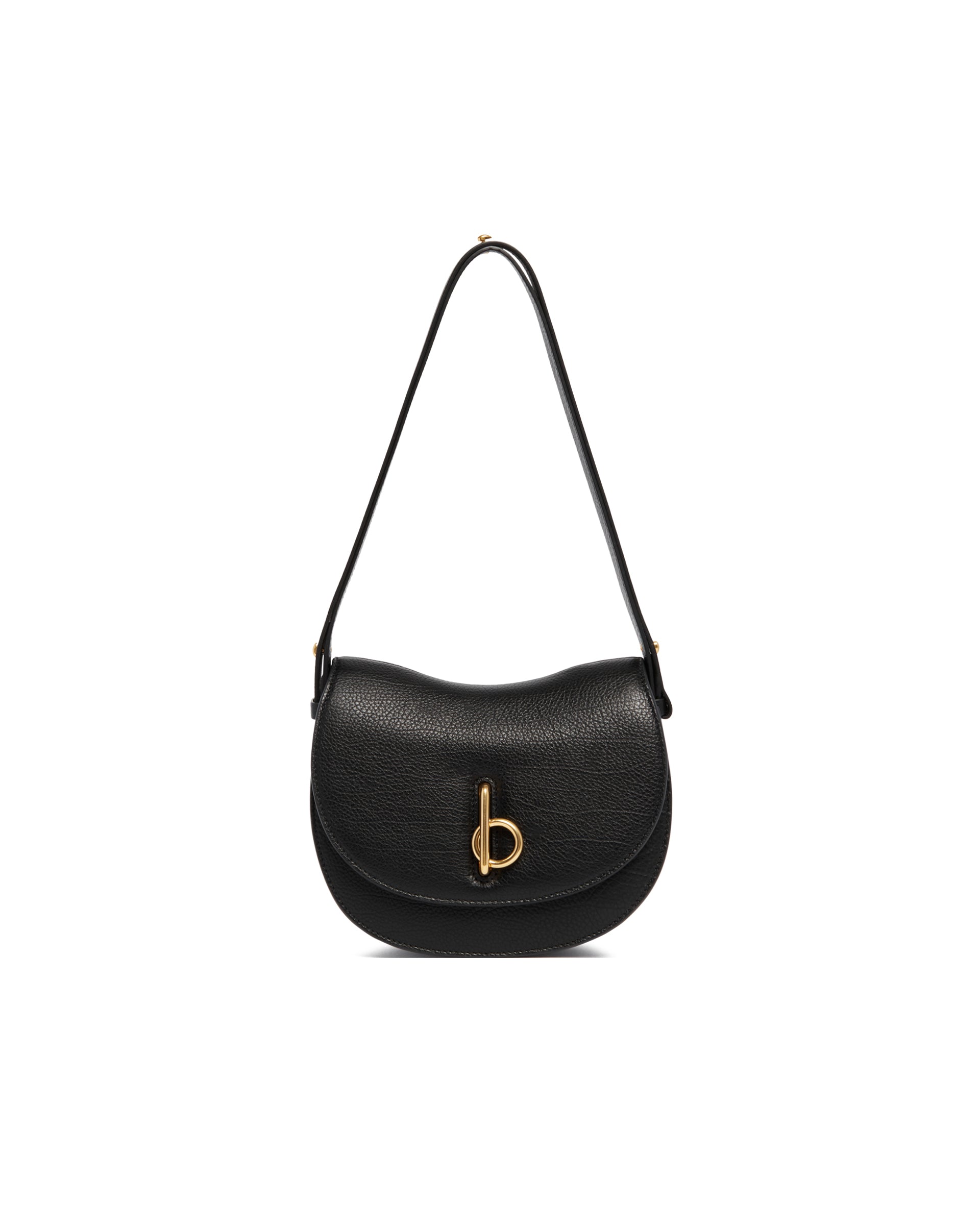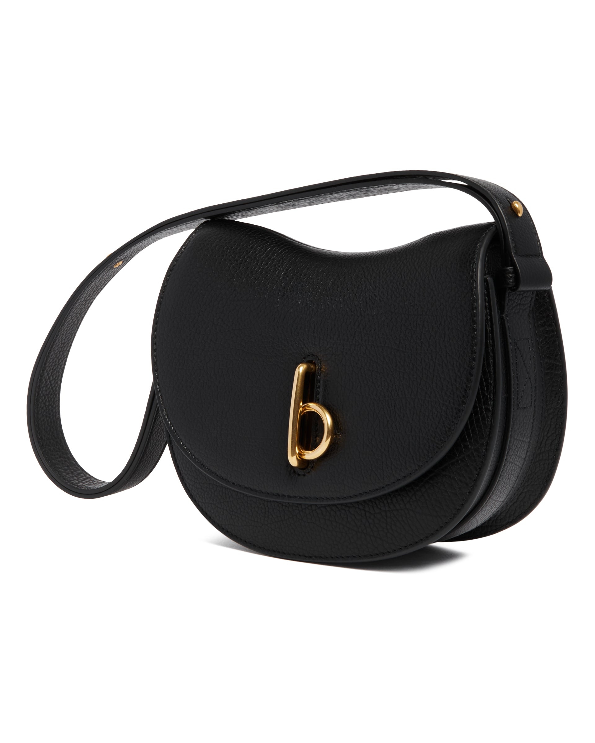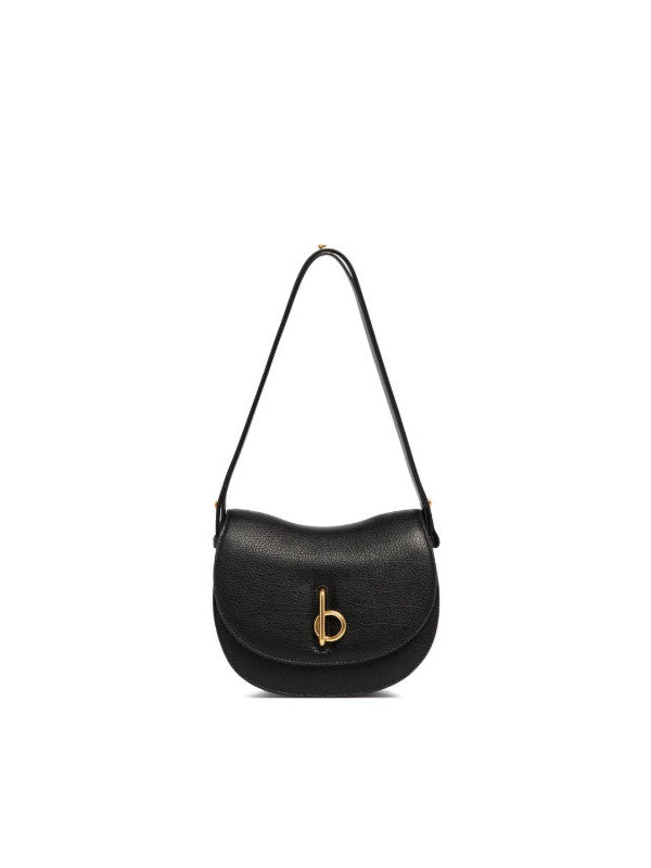 Burberry Black Rocking Horse Bag. Black leather, adjustable leather shoulder strap, front flap with B-shaped closure. Two internal slip pockets, external slip pocket with magnetic closure, brushed metal hardware. Equestrian Knight Design logo embossed on the back and leather interior with embossed Check pattern, brand signature.