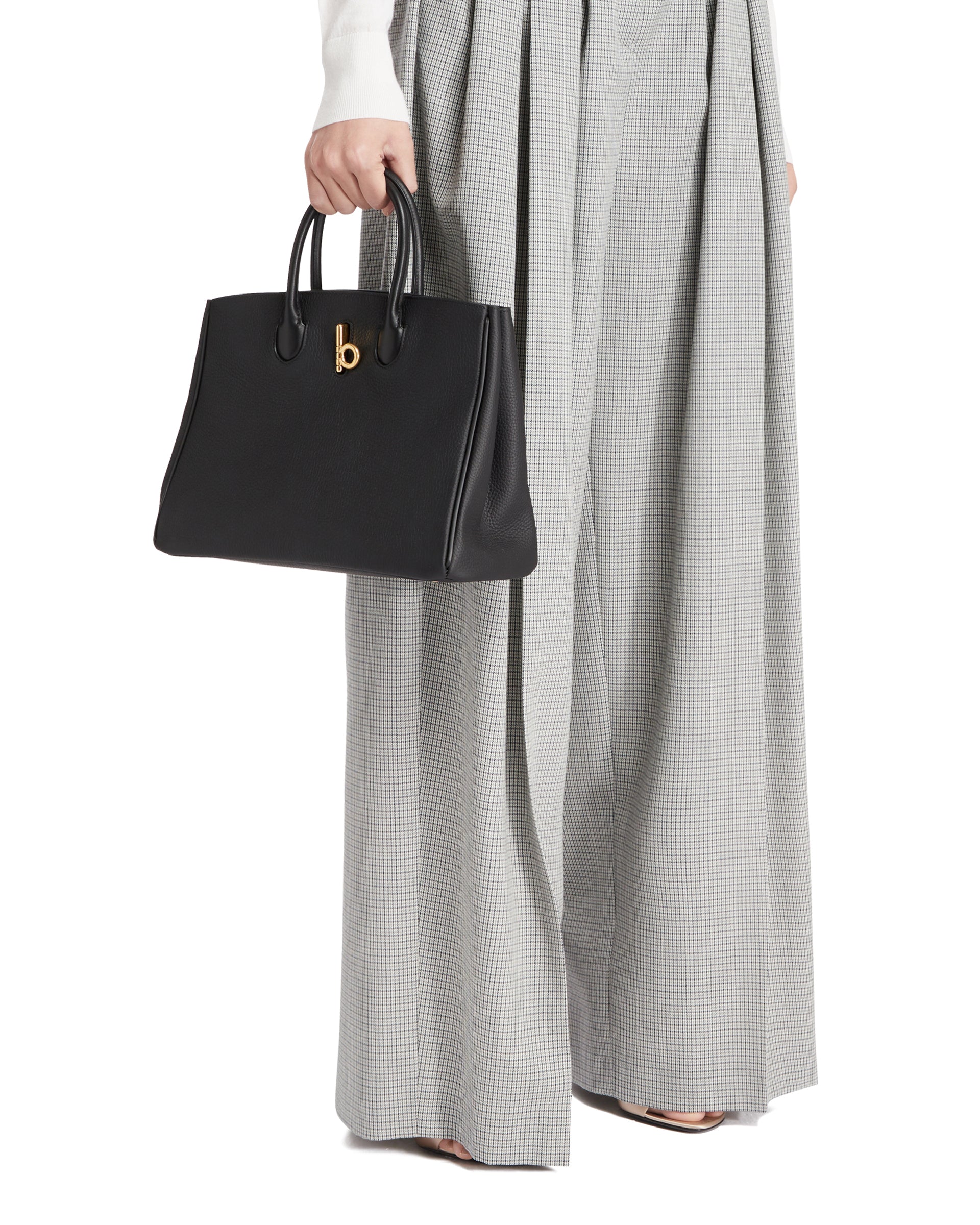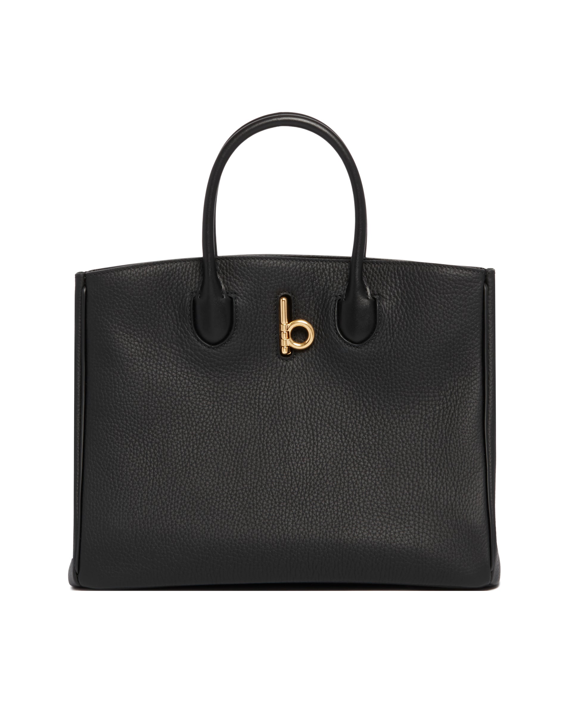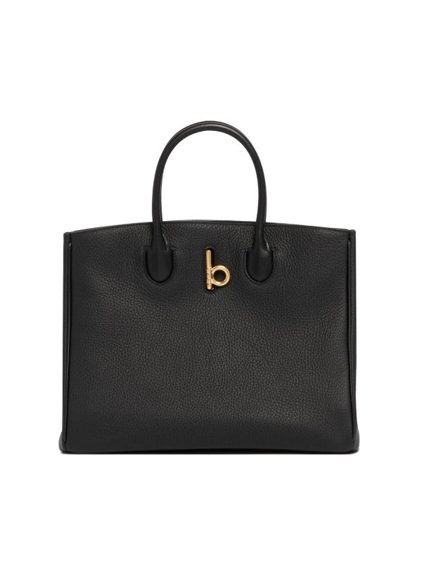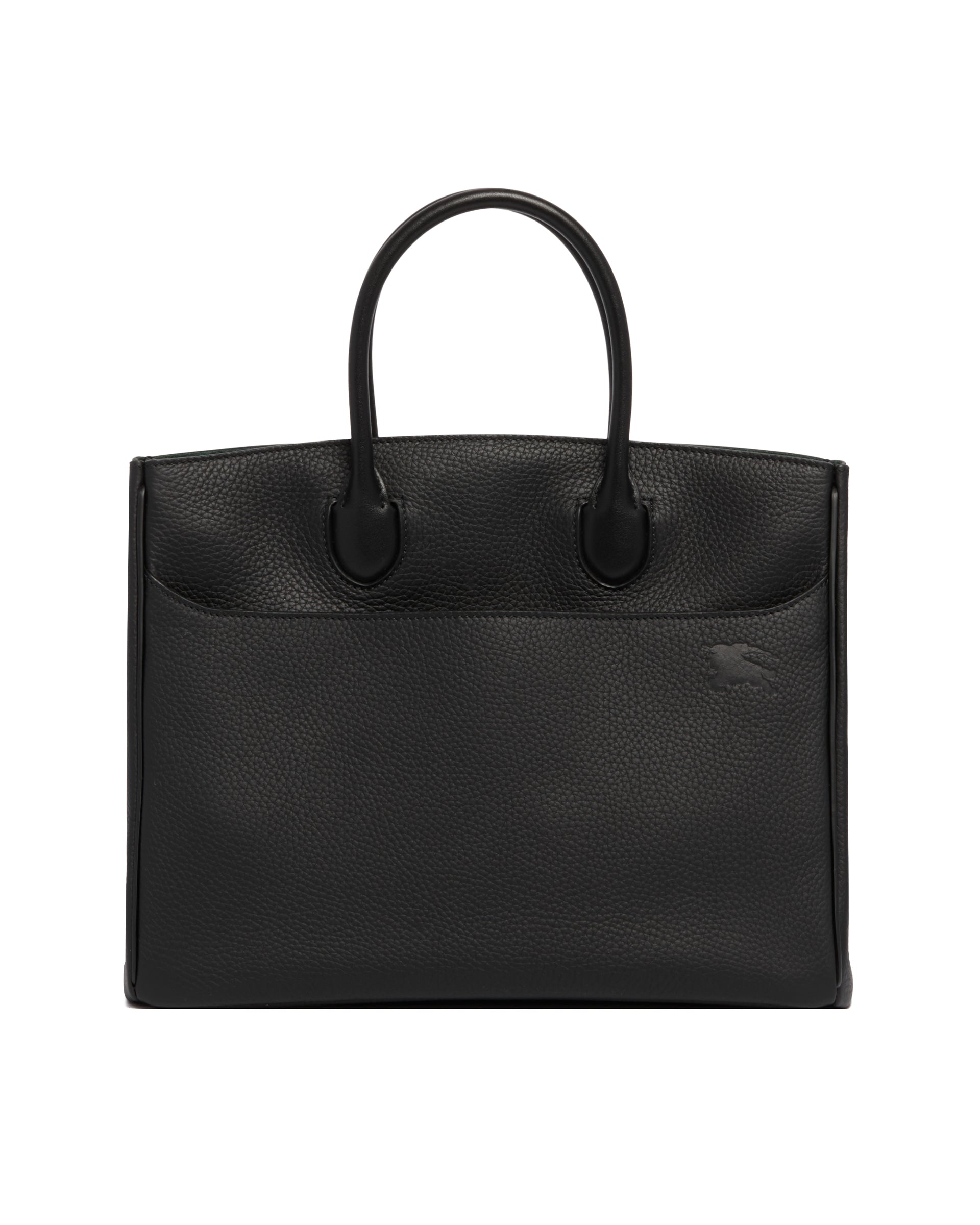 Burberry Black Small Rocking Horse Tote. Black leather, detachable shoulder strap and leather handles. B shaped clasp, external pouch pocket with magnetic closure, internal zip pocket and Equestrian Knight Design embossed detail on the back. Size (cm): 31X22X13