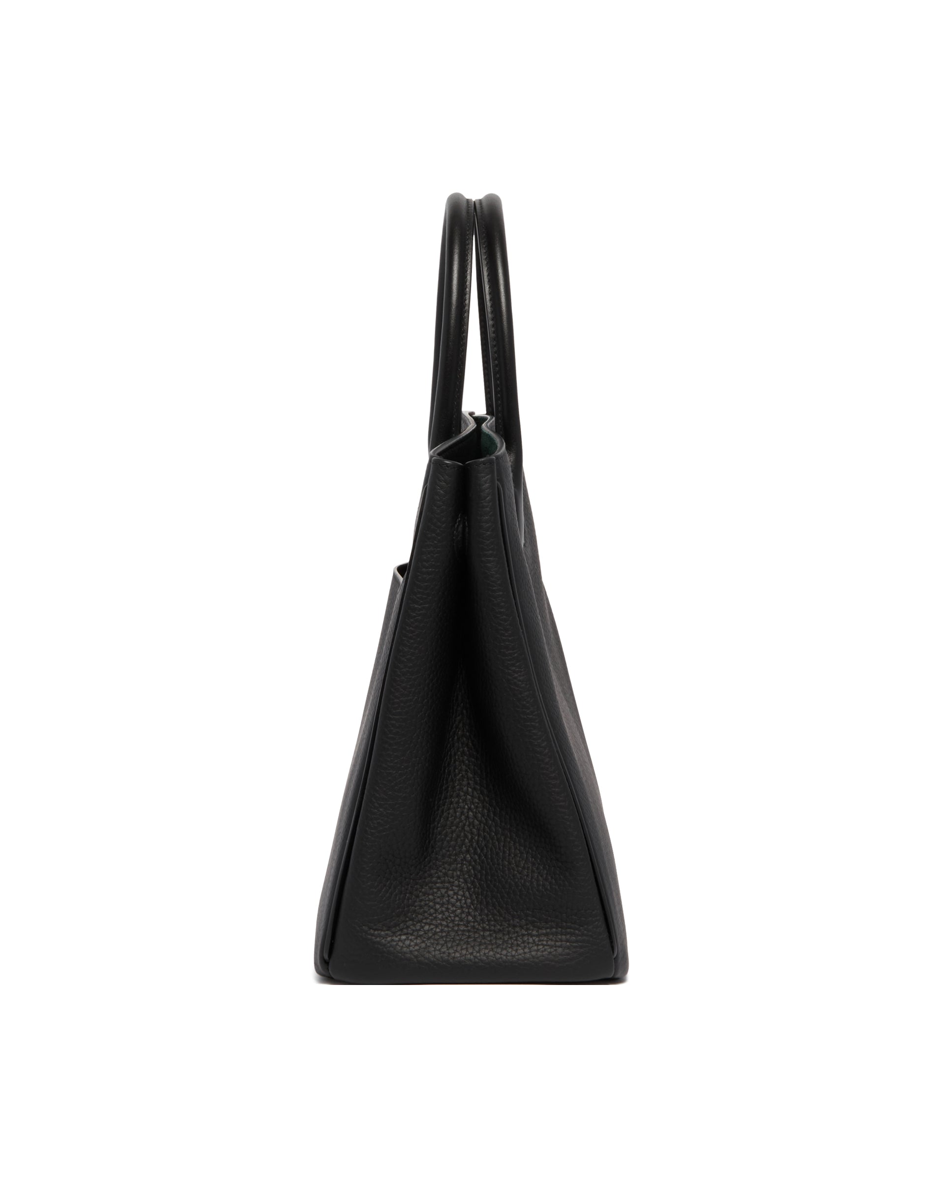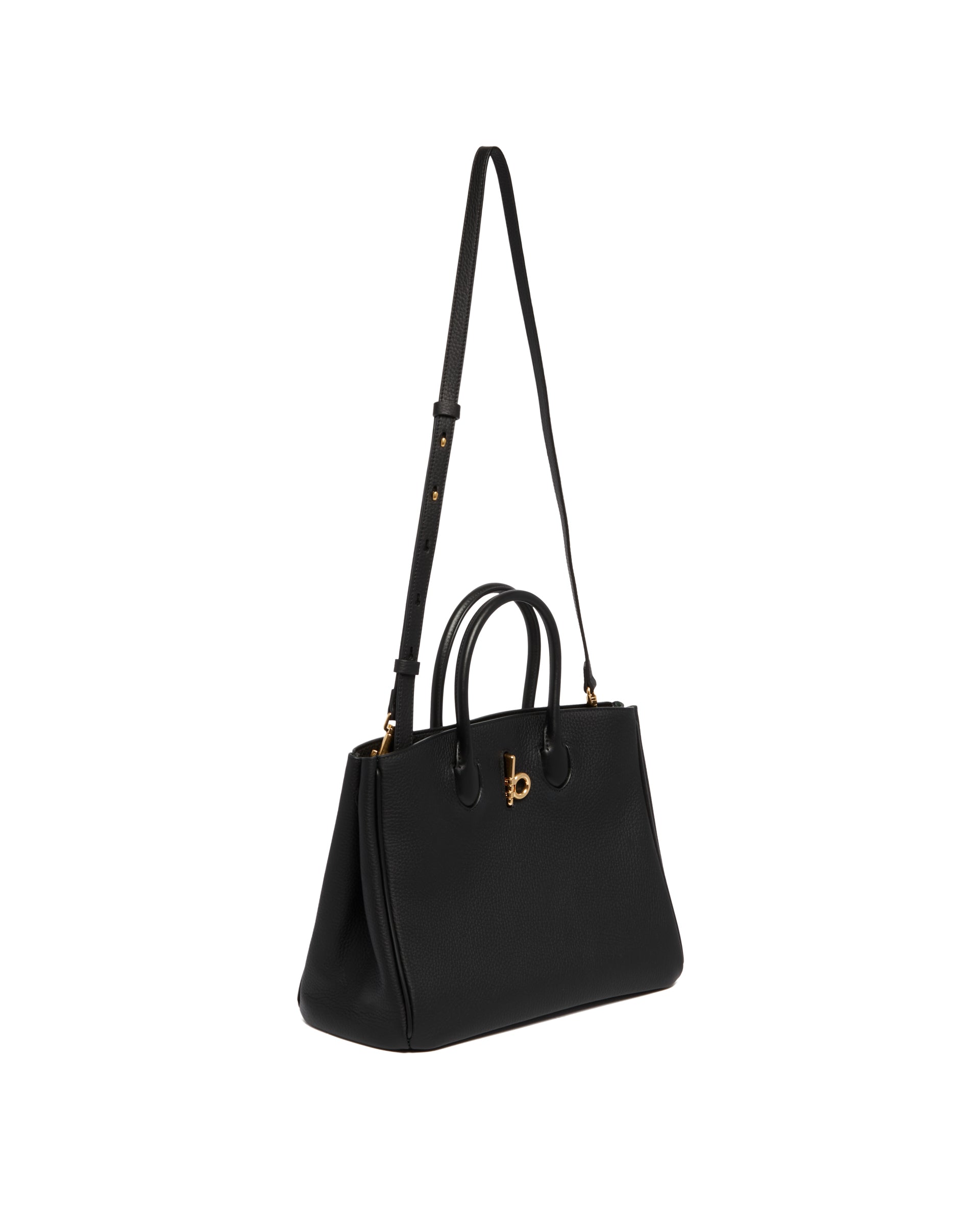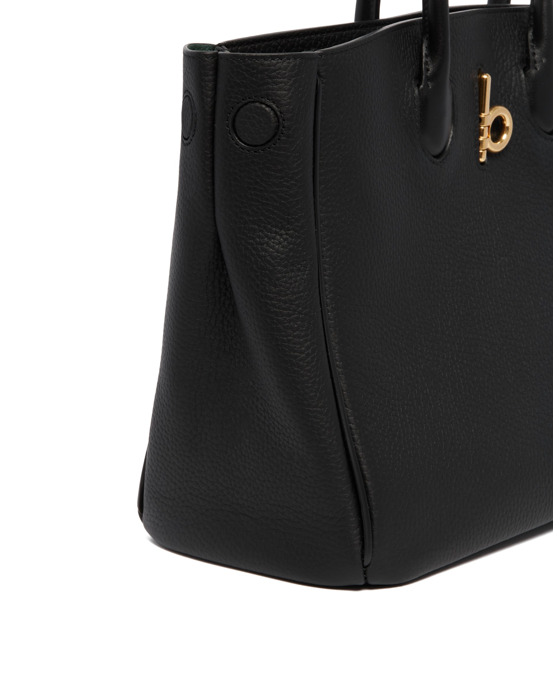 Burberry Black Small Rocking Horse Tote. Black leather, detachable shoulder strap and leather handles. B shaped clasp, external pouch pocket with magnetic closure, internal zip pocket and Equestrian Knight Design embossed detail on the back. Size (cm): 31X22X13