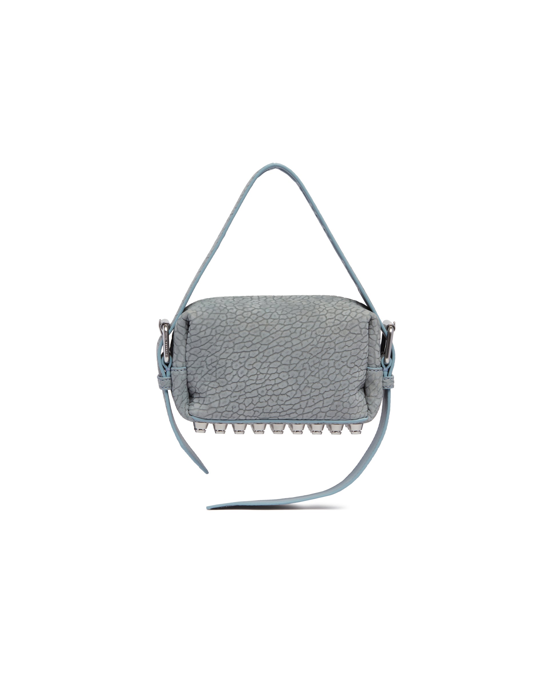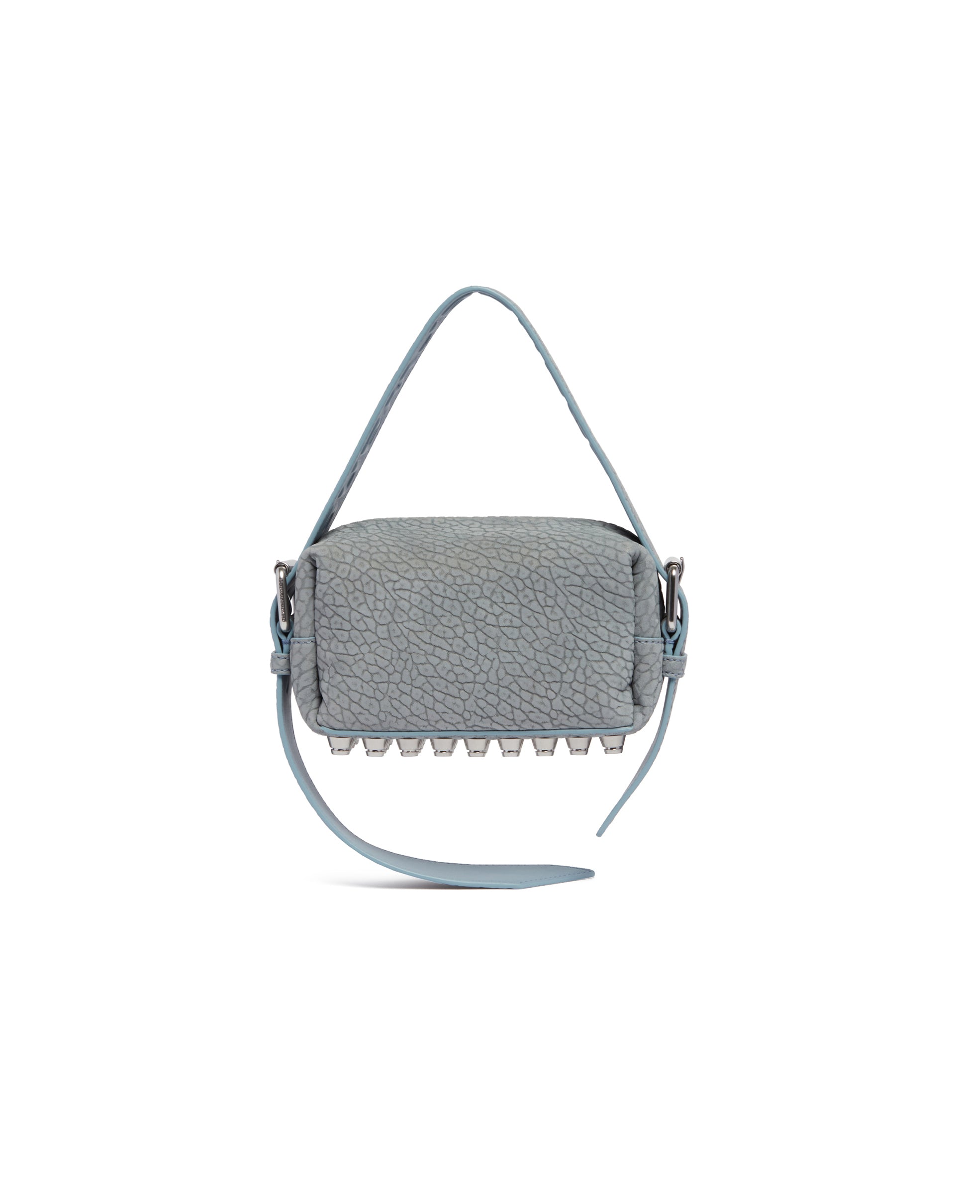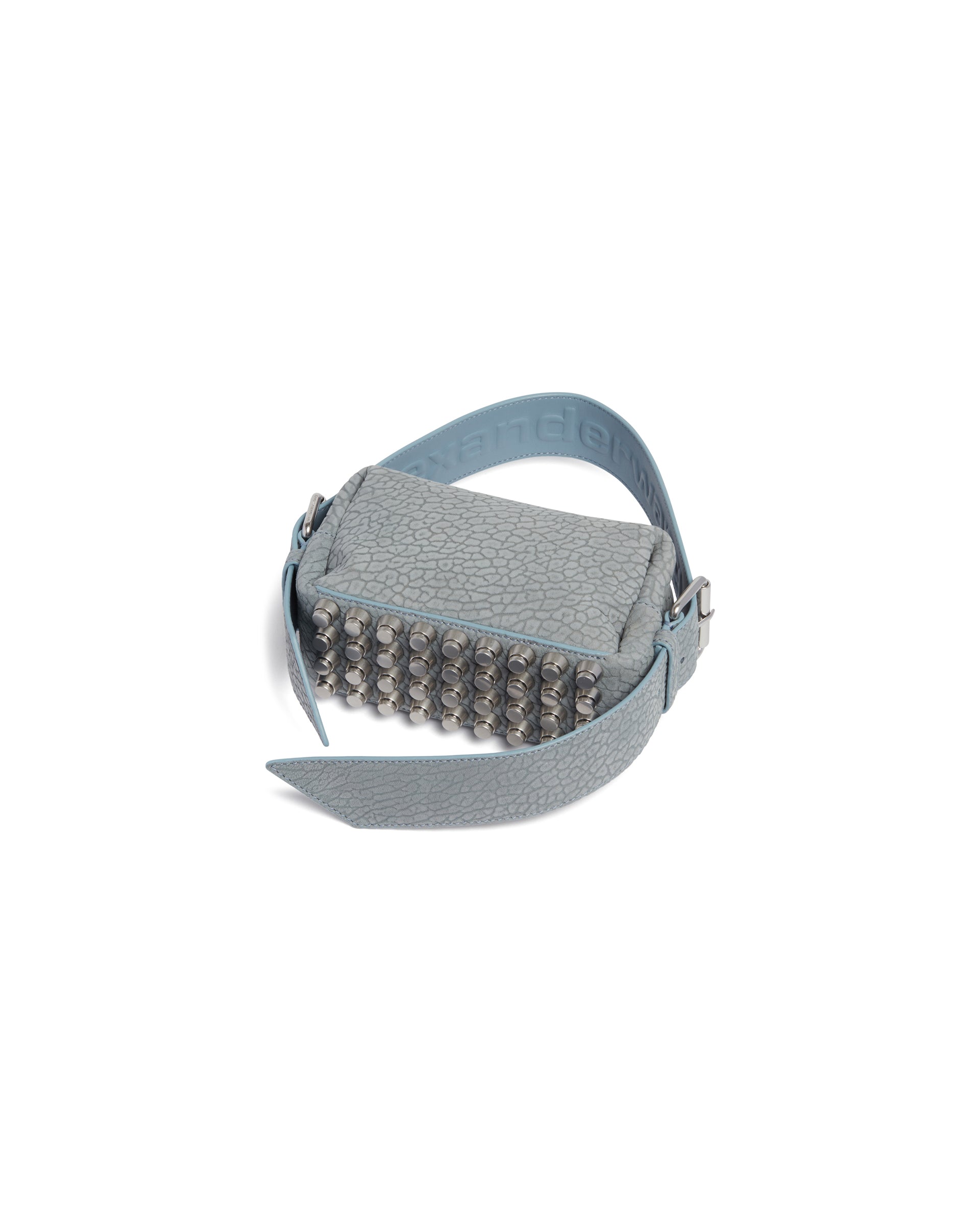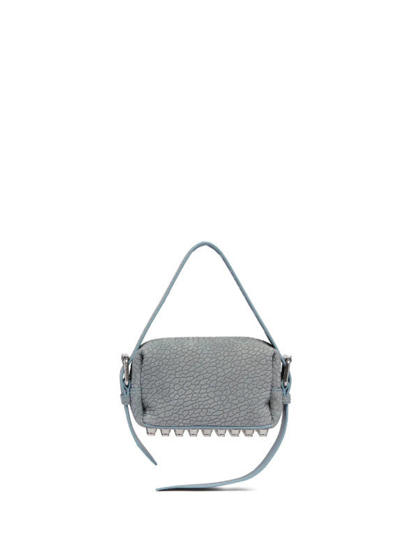 Alexander Wang Blue Ricco Small Leather Bag. Blue leather, top zip closure, adjustable shoulder strap featuring an embossed logo. The bottom is adorned with trap studs and the main compartment is lined in twill with an internal card slot pocket. Size (cm): 21X10X18