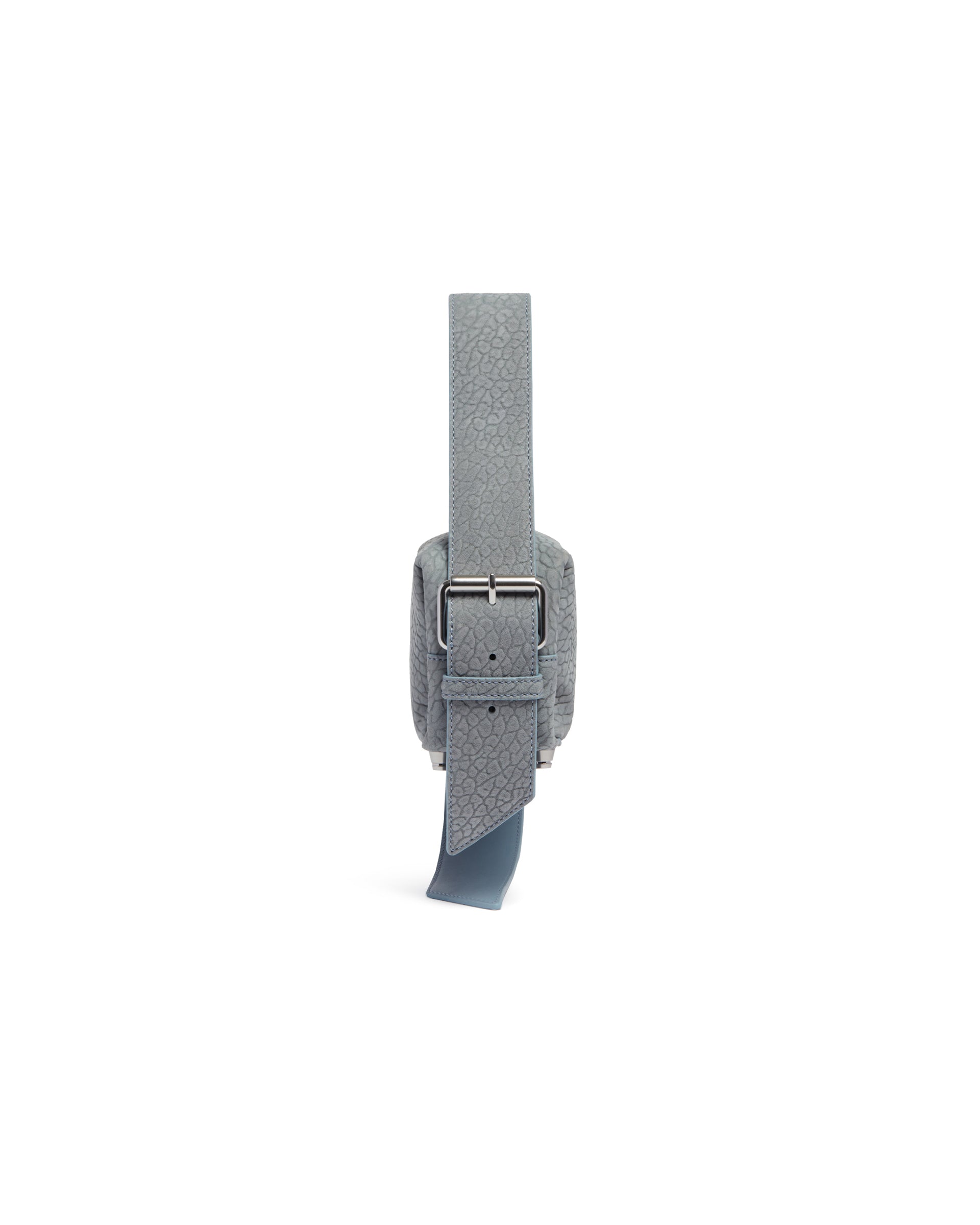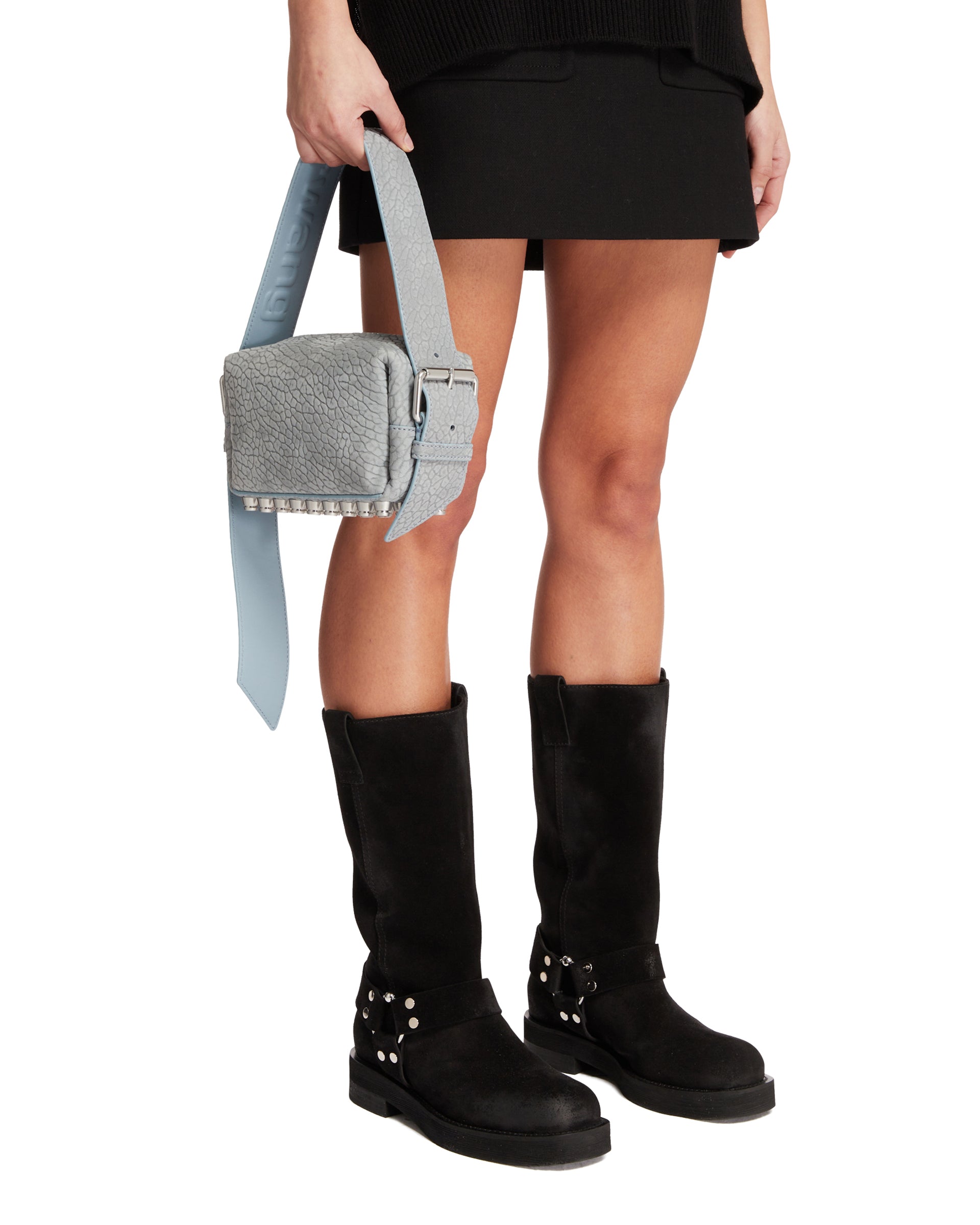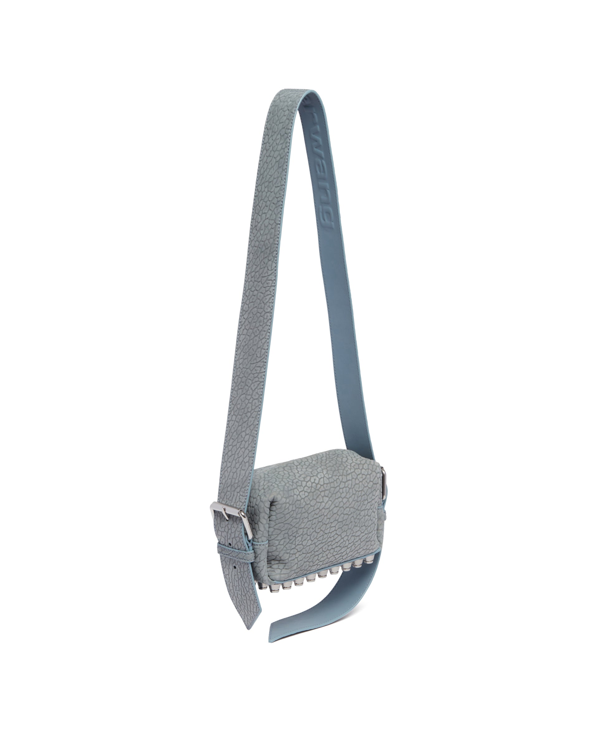 Alexander Wang Blue Ricco Small Leather Bag. Blue leather, top zip closure, adjustable shoulder strap featuring an embossed logo. The bottom is adorned with trap studs and the main compartment is lined in twill with an internal card slot pocket. Size (cm): 21X10X18