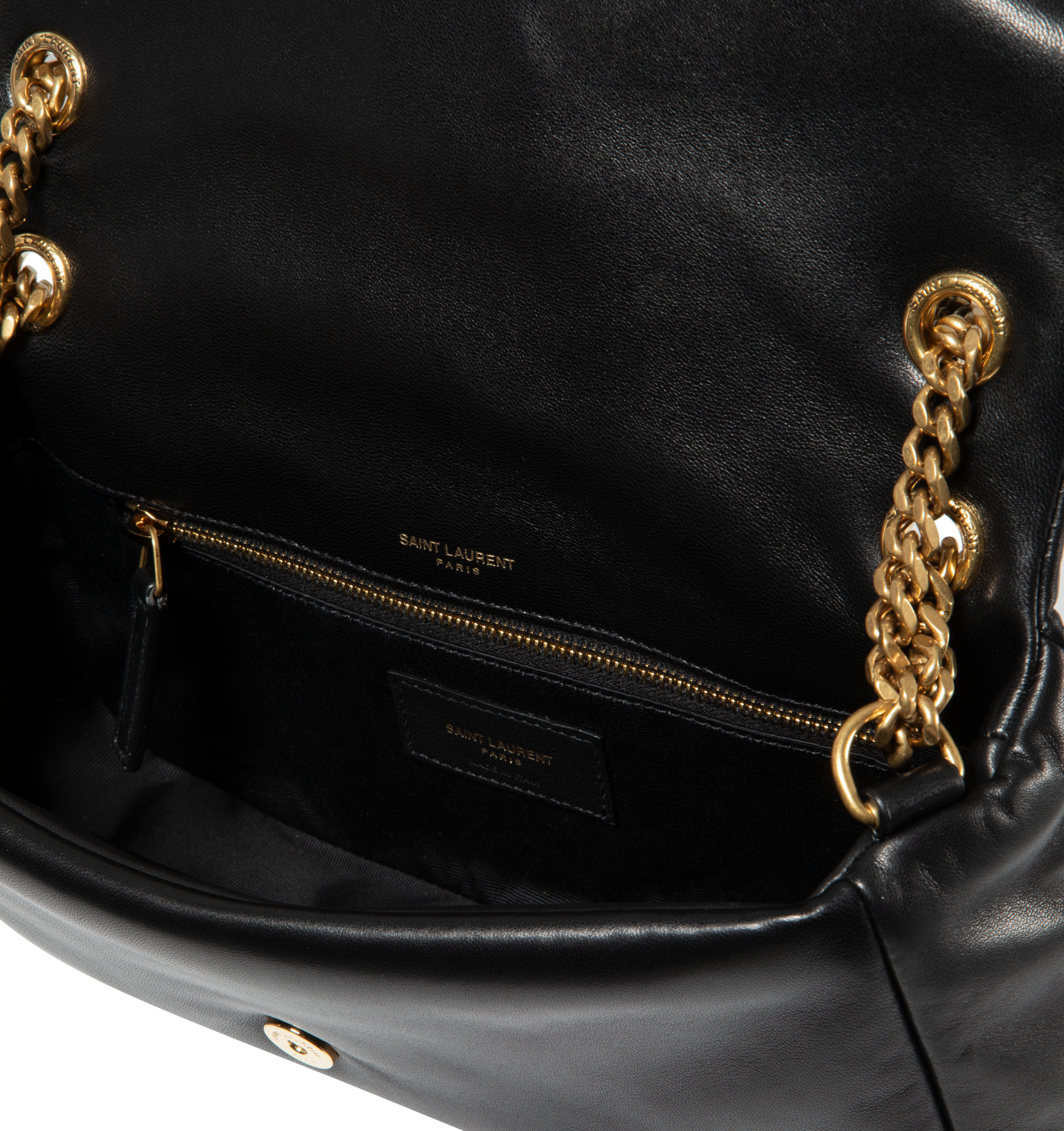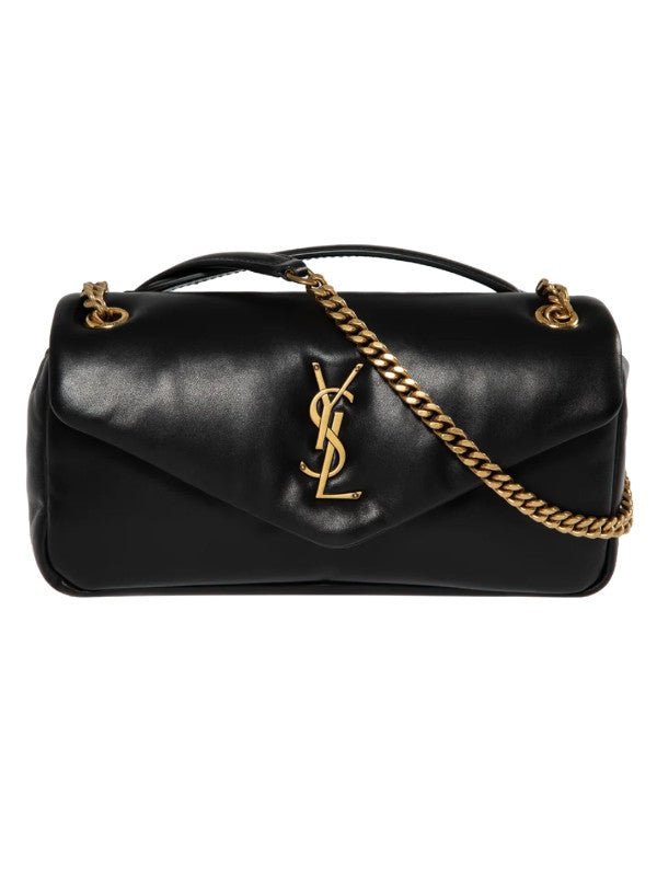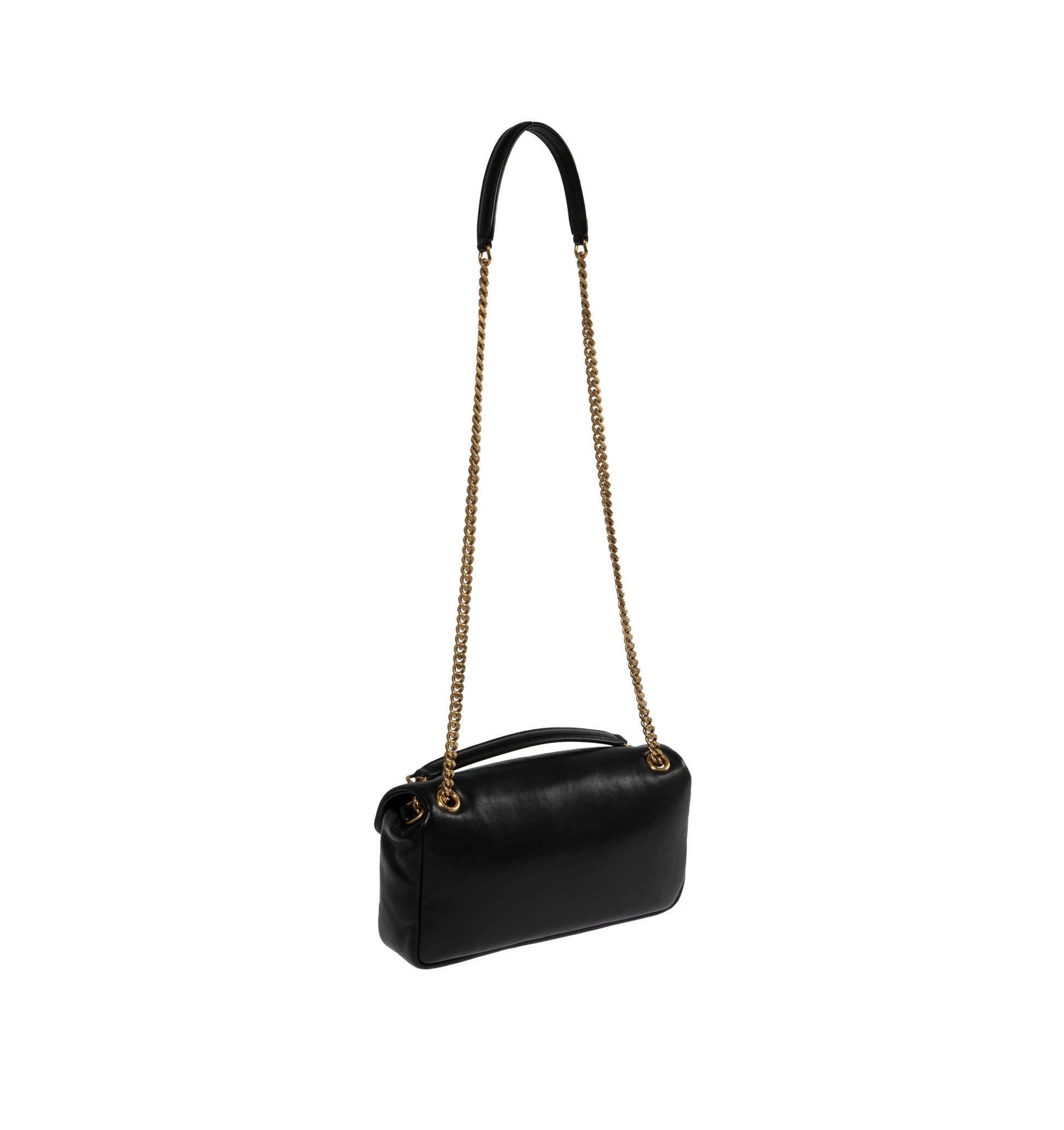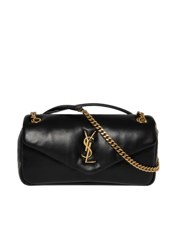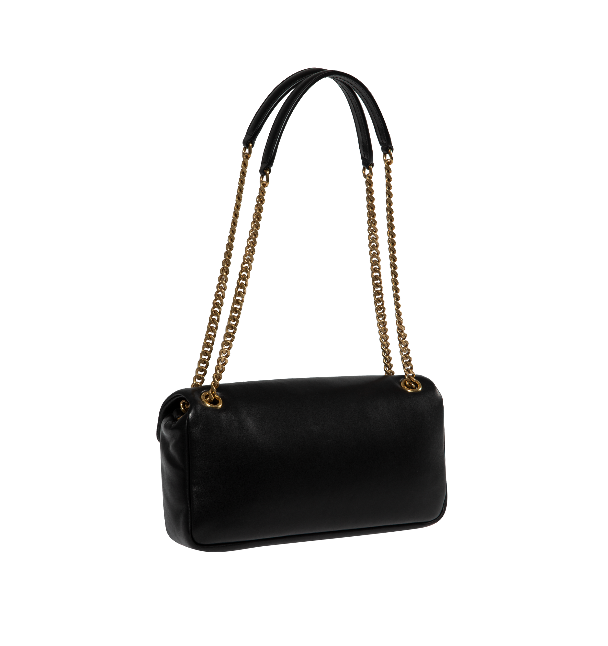 SAINT LAURENT Calypso padded shoulder bag featuring snap button closure and one zip pocket. Chain drop 9.4". Dimensions: 2.8 x 5.5 x 10.6 inches. 100% leather. Made in Italy.