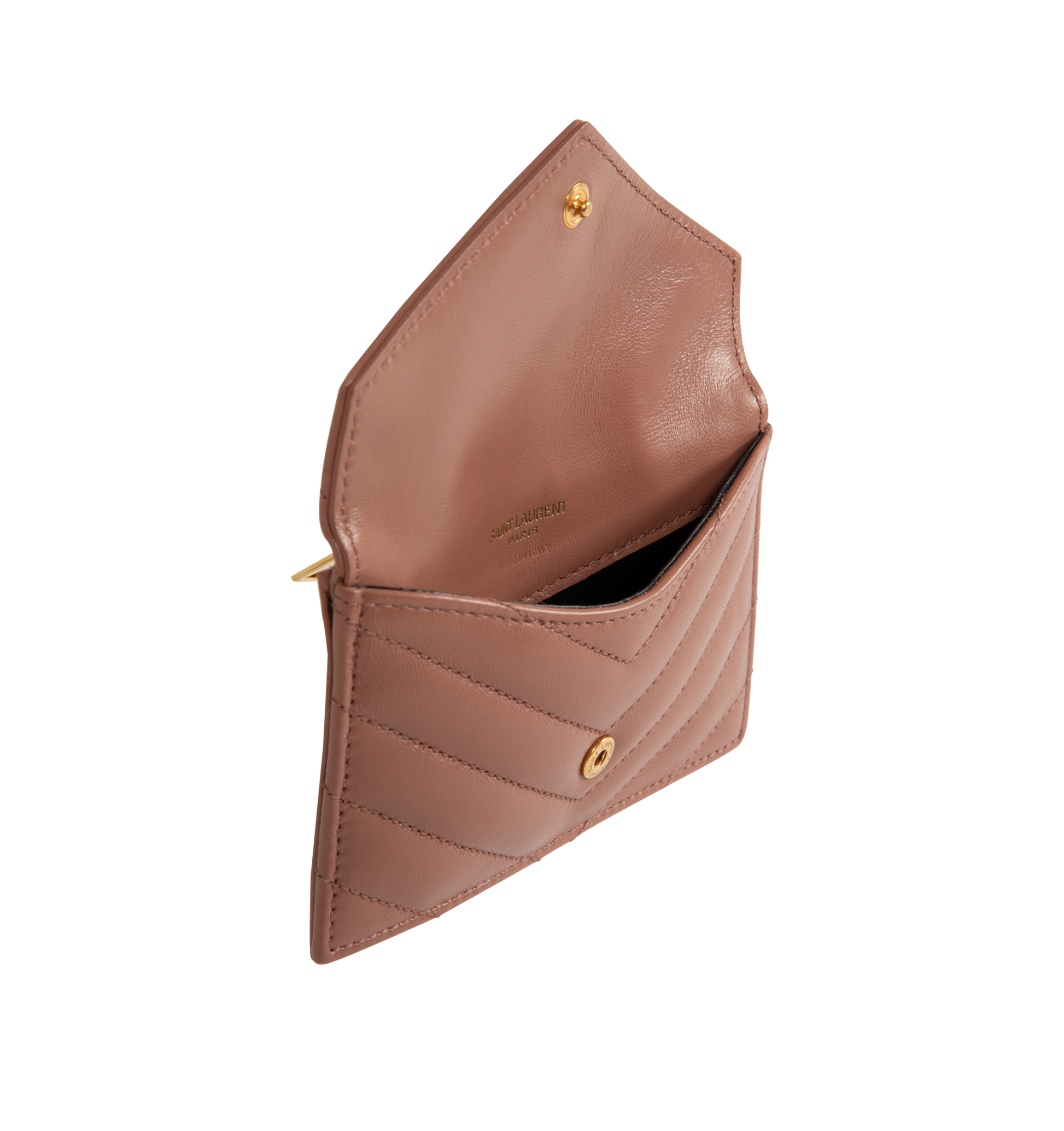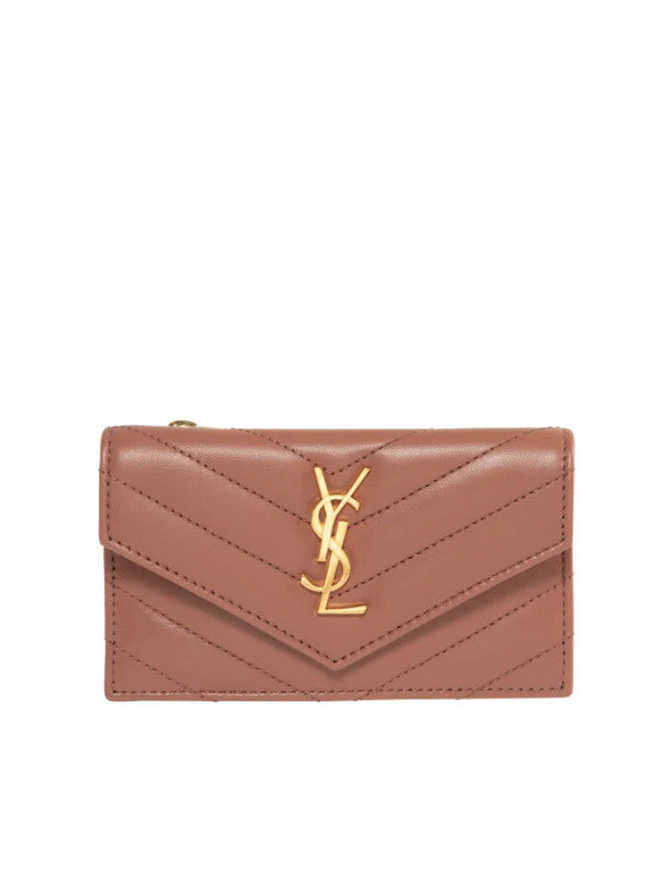 Saint Laurent women's Zip card case with flap in soft nappa leather, decorated with the CASSANDRE and chevron-quilted topstitching, leather lining, gold-toned hardware, snap-button closure, one zip coin pocket and five card slots. Dimensions: 13 x 8 x 2 CM / 5.1" x 3.1" x 0.7". Calfskin leather. Made in Italy.