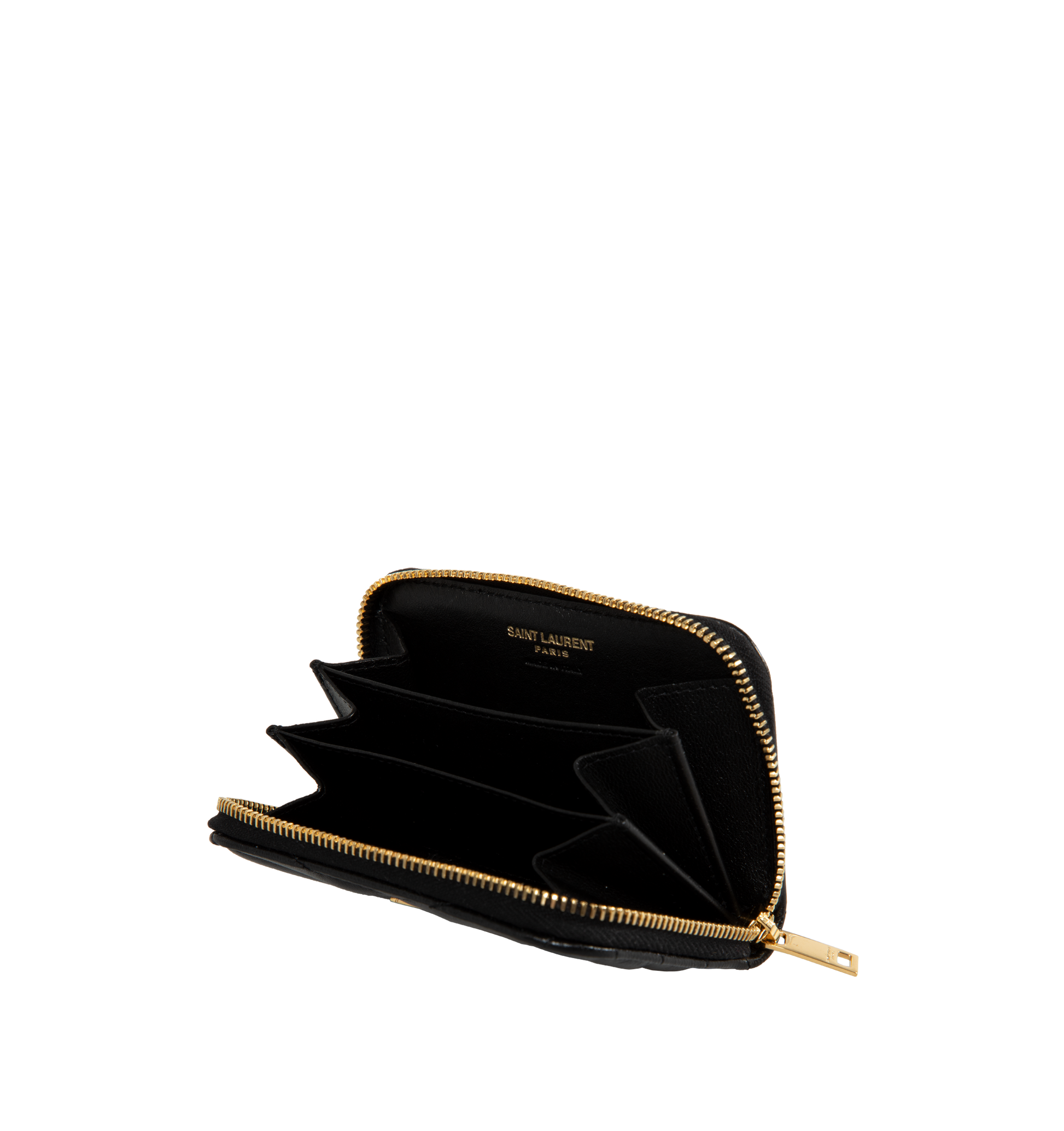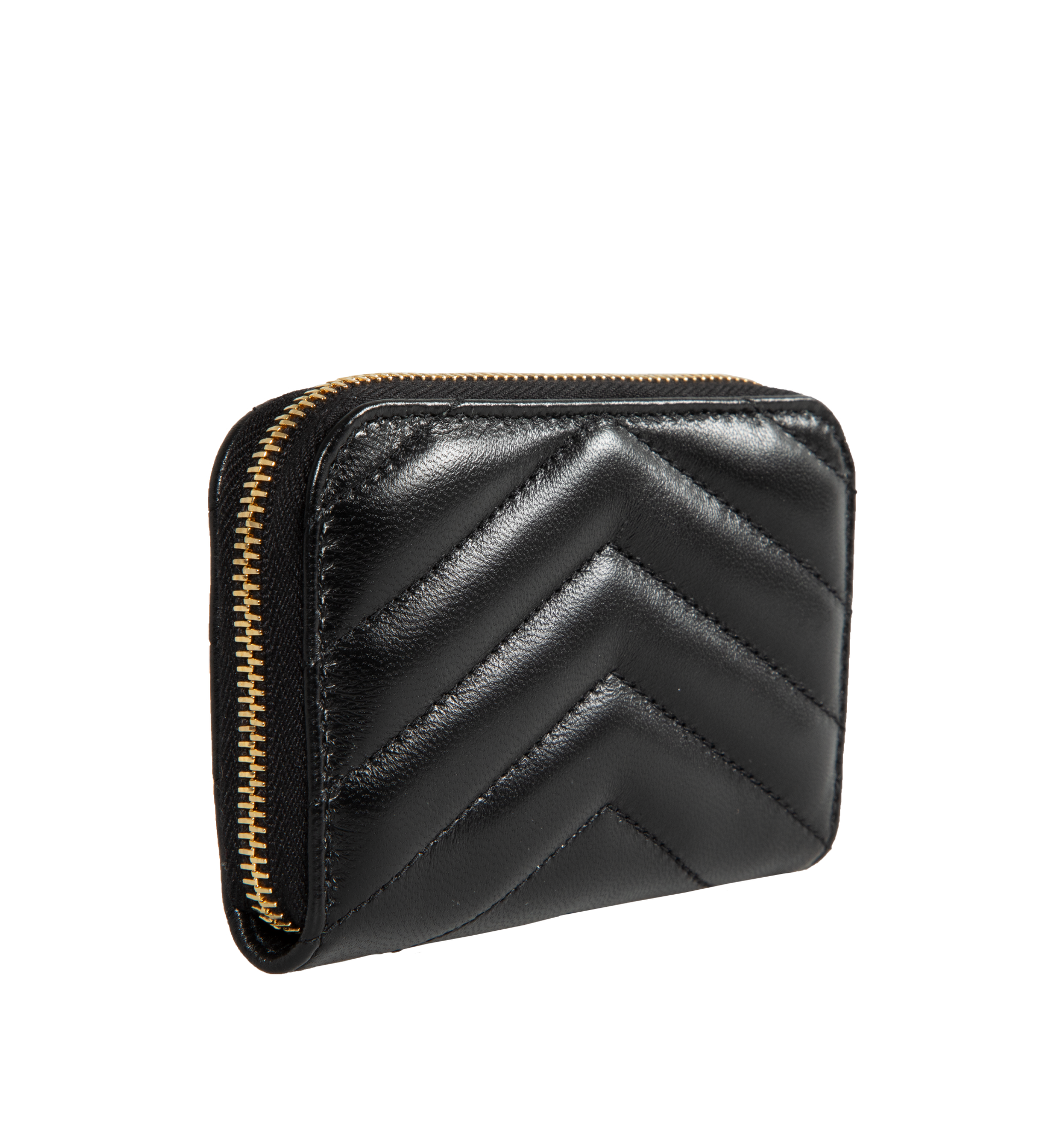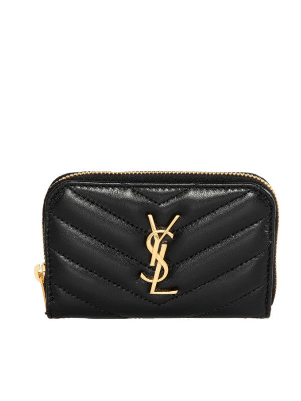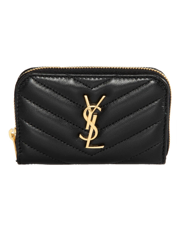 Saint Laurent Cassandre matalesse coin card zip-around wallet decorated with chevron stich quilting and the Cassandre. Interior features three gusseted compartments and grosgrain lining. Measures 4.3 X 2.8 X 0.8 inches. Lambskin leather with gold-tone hardware. Made in Italy.