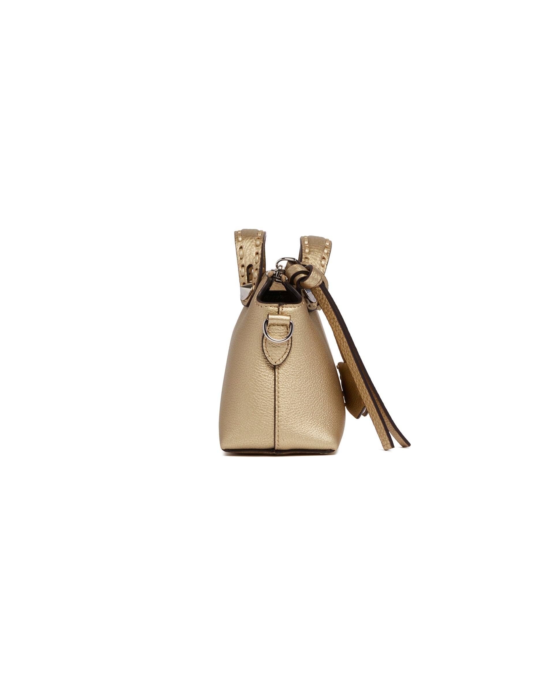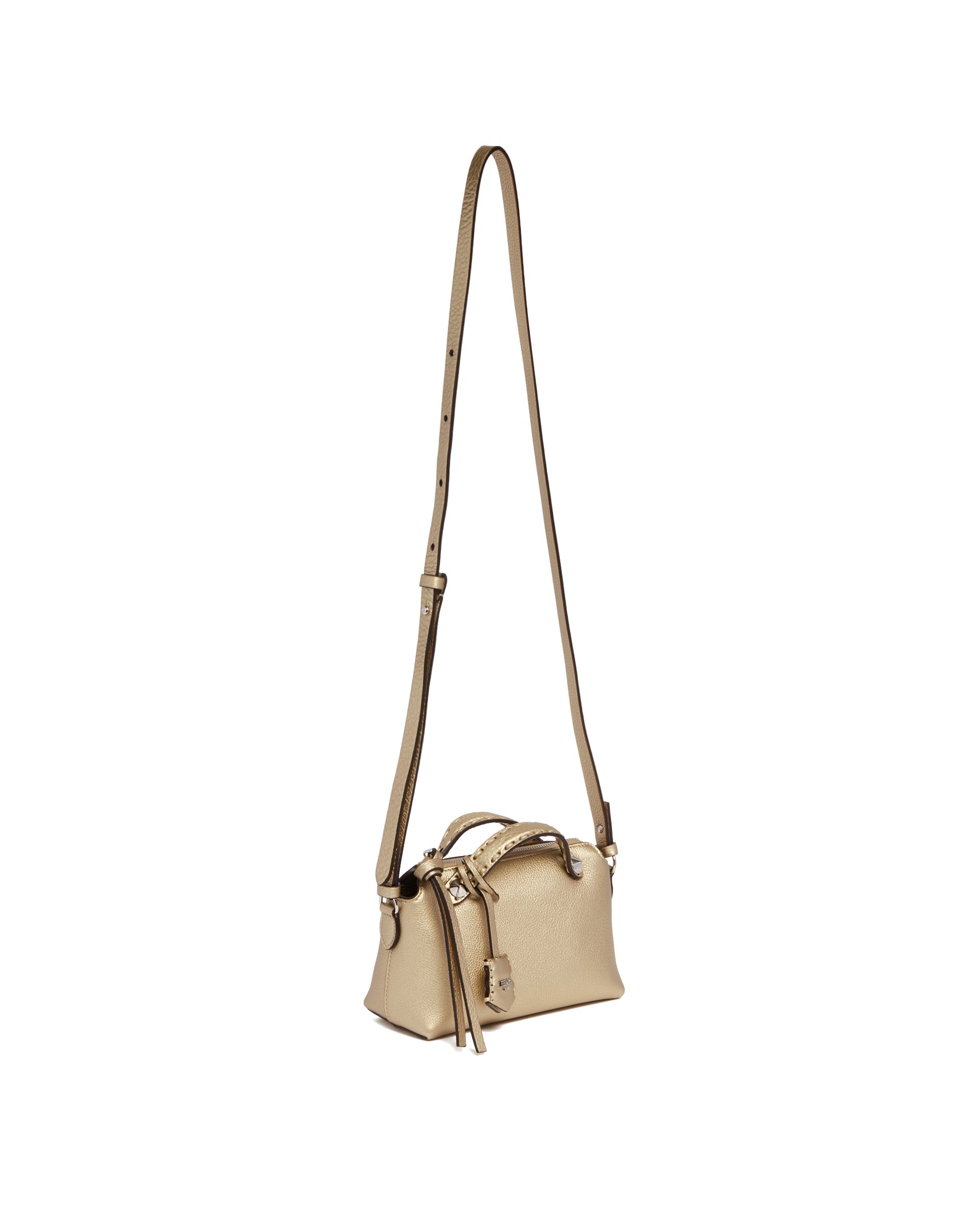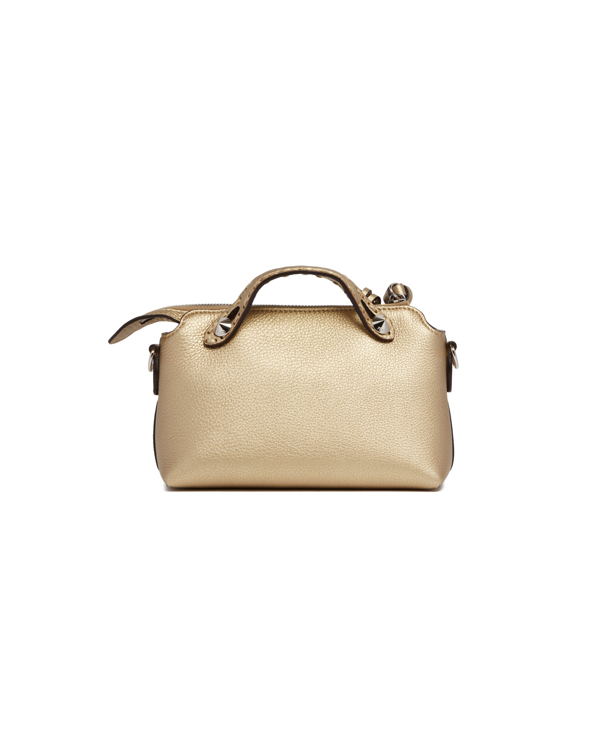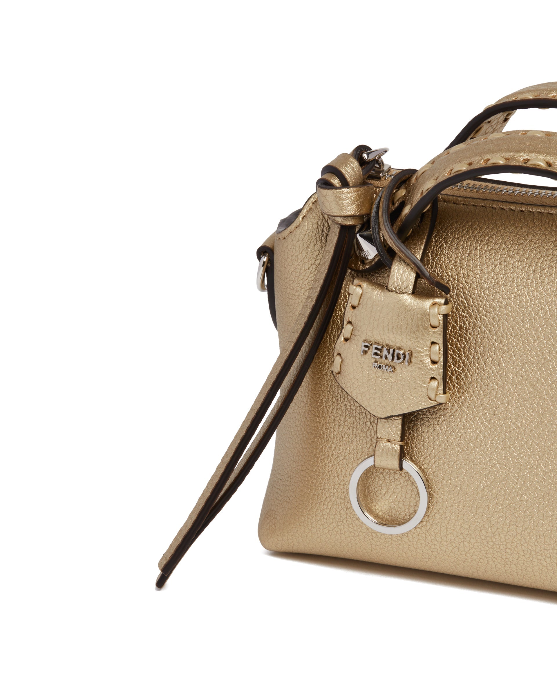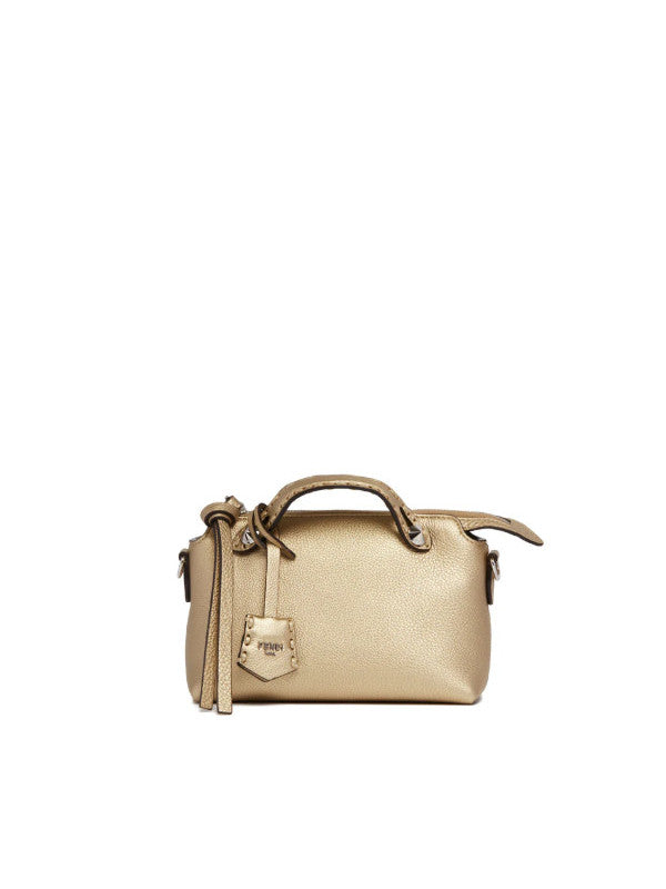 Fendi Gold By The Way Selleria Mini Bag. Gold leather with a metallic finish,156 hand-stitched tone-on-tone macro stitches, iconic Selleria craftsmanship. Tone-on-tone handles, adjustable and removable shoulder strap, customizable charm and long zipper pu