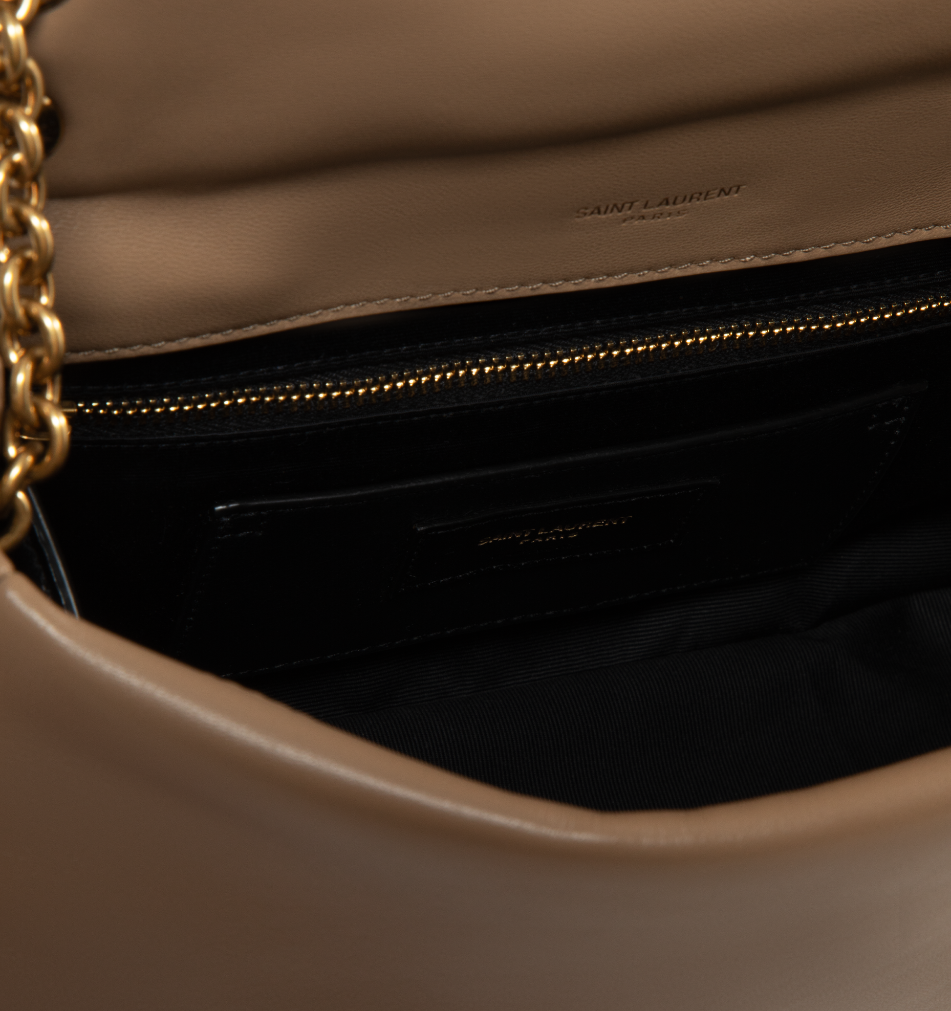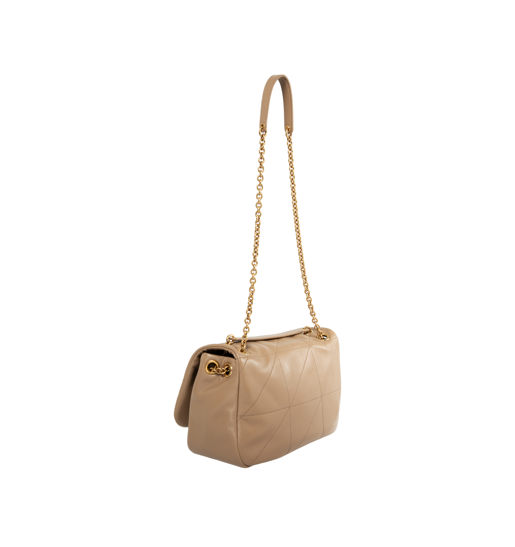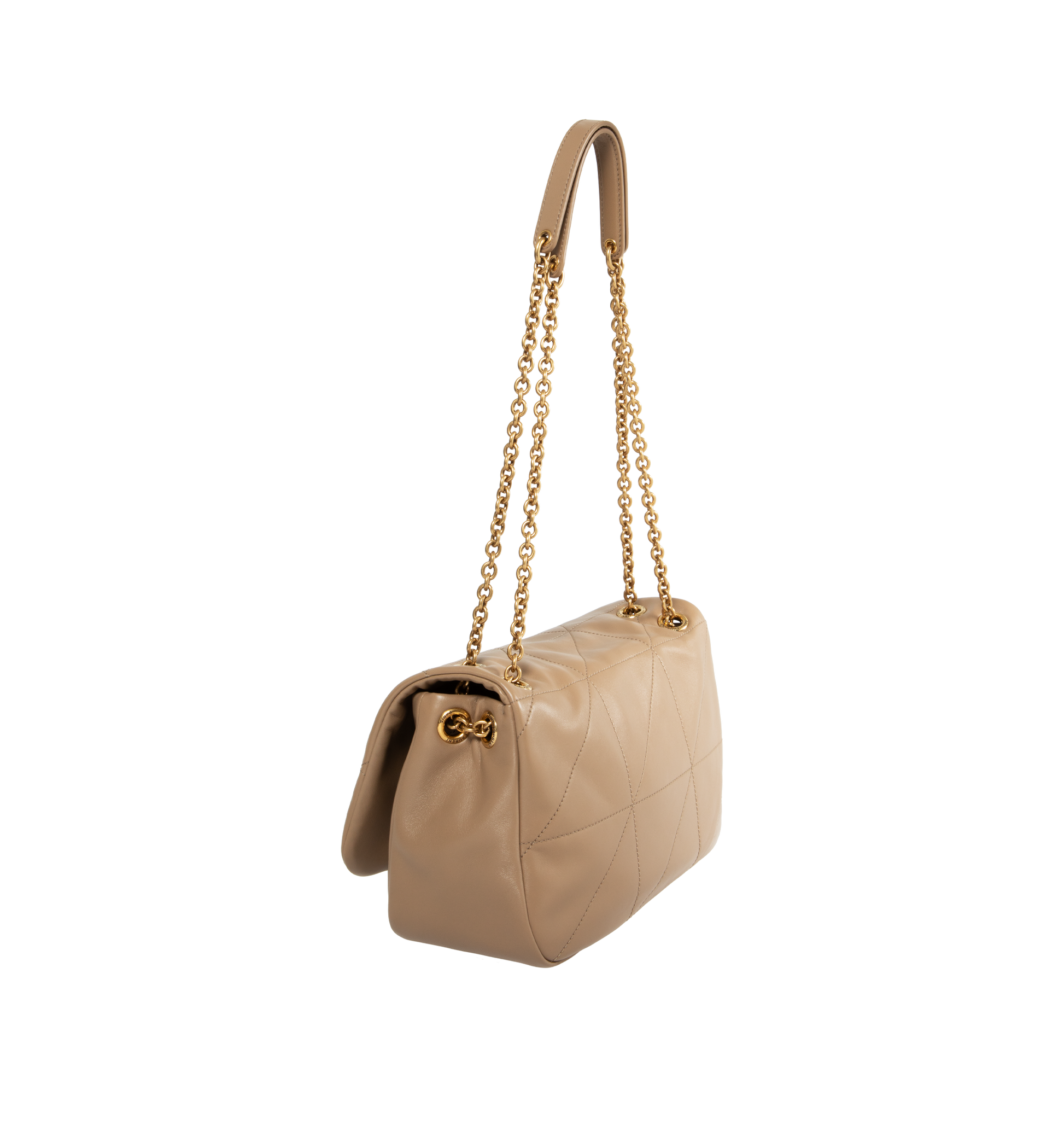 SAINT LAURENT Jamie 4.3 Small in Lambskin featuring quilted topstitching, adjustable sliding strap, one flap pocket at back and snap closure with inner ties. 9.8 X 6.3 X 2.8 inches. 100% lambskin.