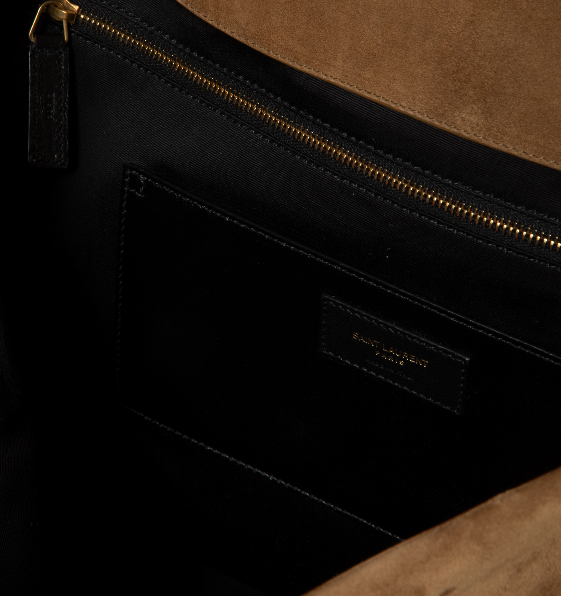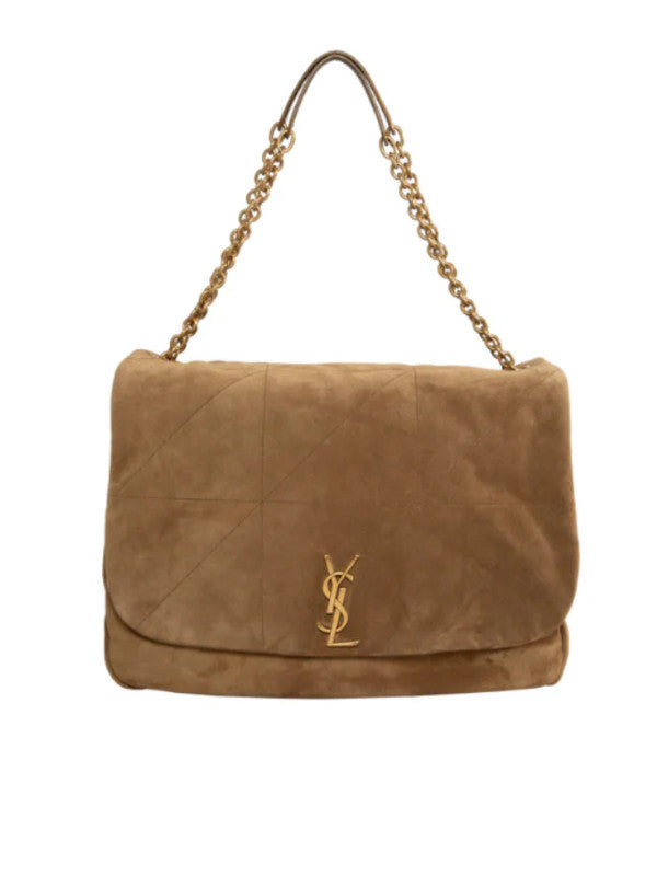 Saint Laurent Large, soft nappa leather bag decorated with quilted "Carre Rive Gauche" top-stitching. Light and roomy with adjustable sliding chain strap, bronze-tone hardware, tie closure, interior zip pocket, interior slot pocket, Measures 16.9 X 11.4 X 3.5 inches with 11.8–21.3 inch long chain. 100% calfskin leather with cotton lining. Made in Italy.
