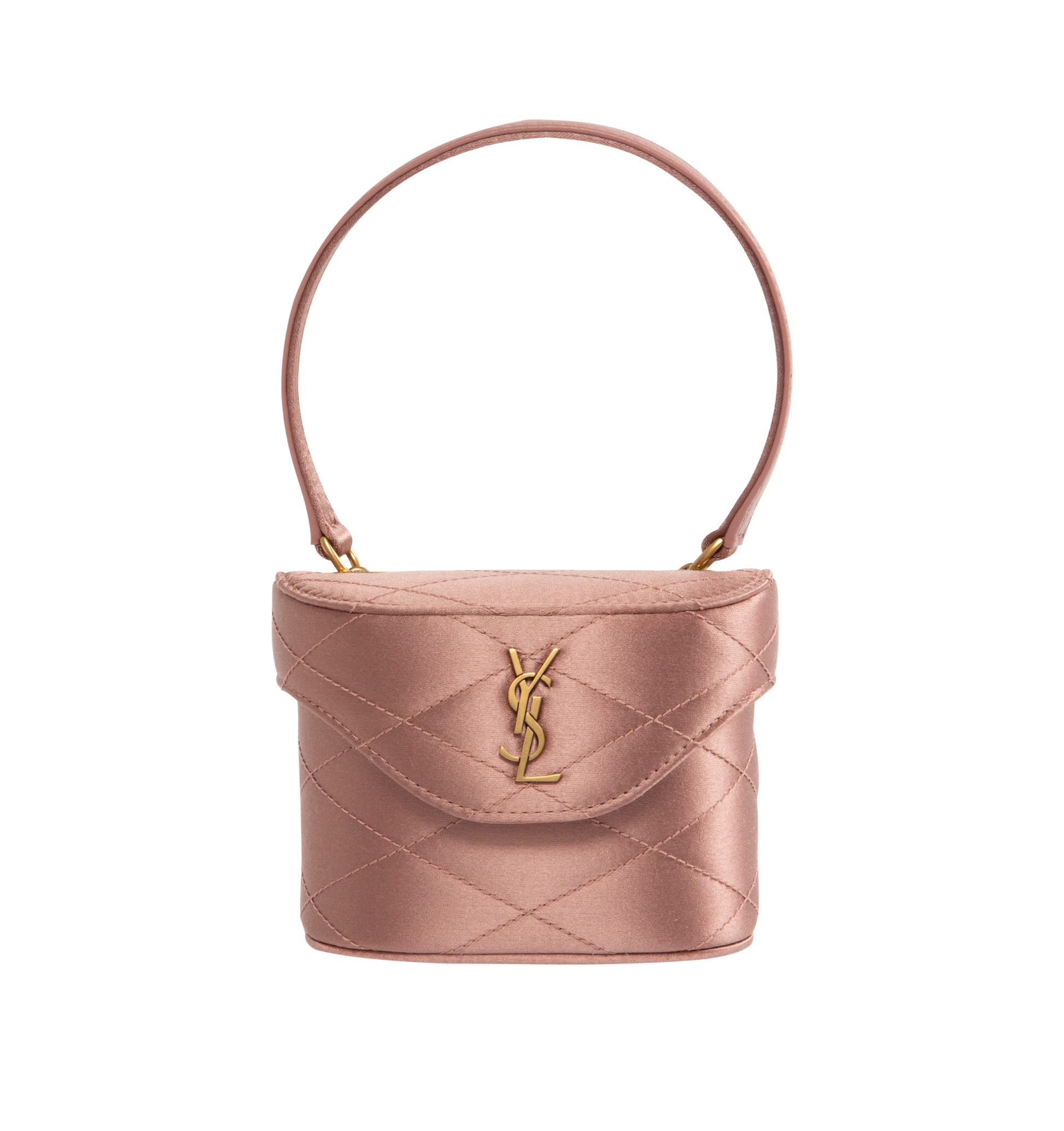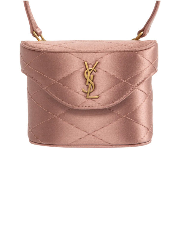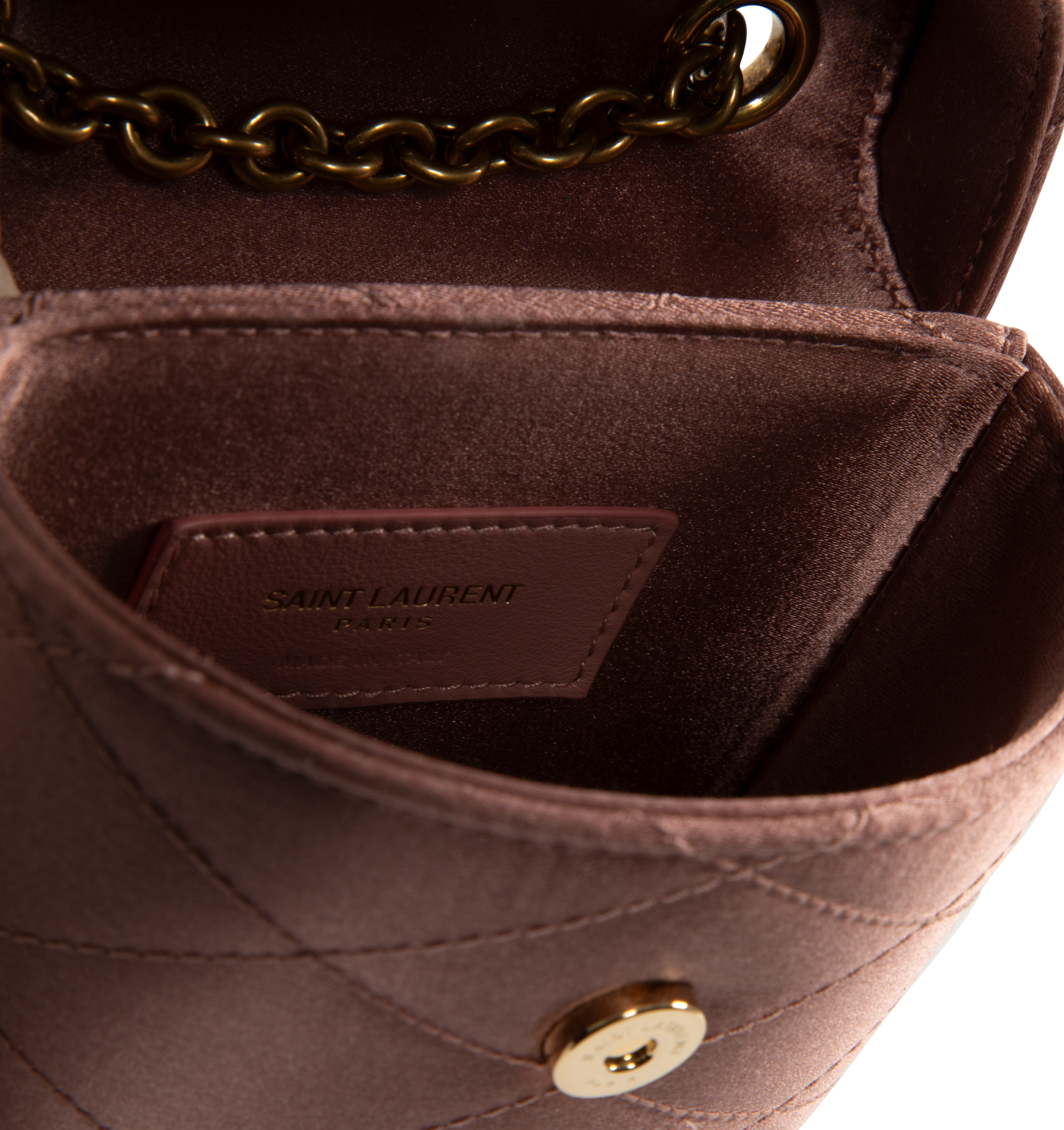 Saint Laurent micro bag decorated with the CASSANDRE and diamond-quilted topstitching, featuring a leather and chain strap for shoulder carry, leather lining, bronze-toned hardware, magnetic flap closure. Measures 4.9" x 3.5" x 2.4" with 19.7" strap drop. Viscose, silk and brass. Made in Italy.